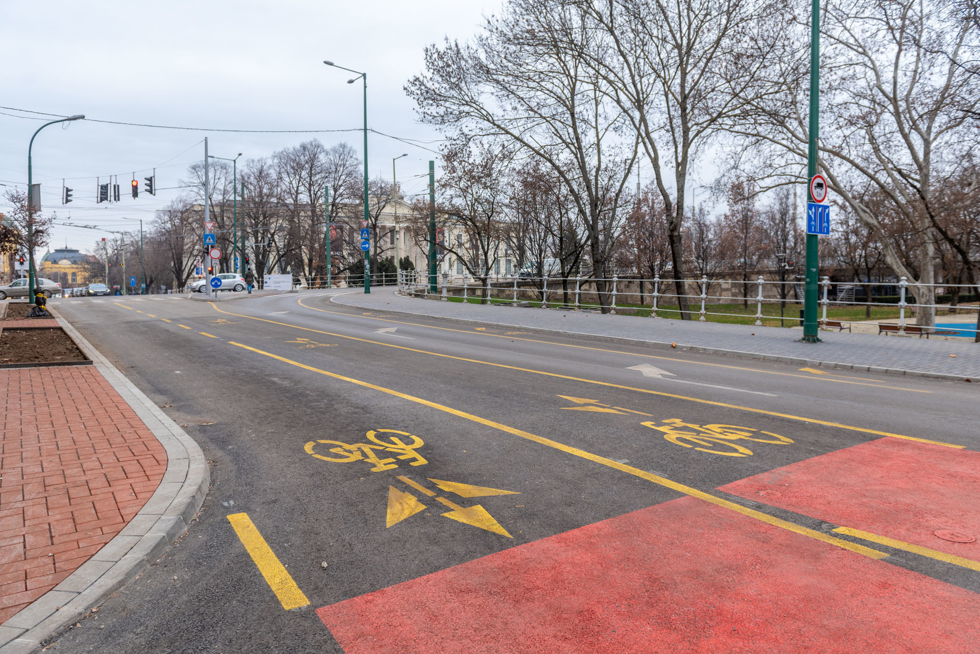 Elkészült a Belvárosi híd szegedi hídfőjében található csomópont teljes egészében a csatlakozó járdaburkolatokkal, illetve az új jelzőlámpás forgalomirányítással.