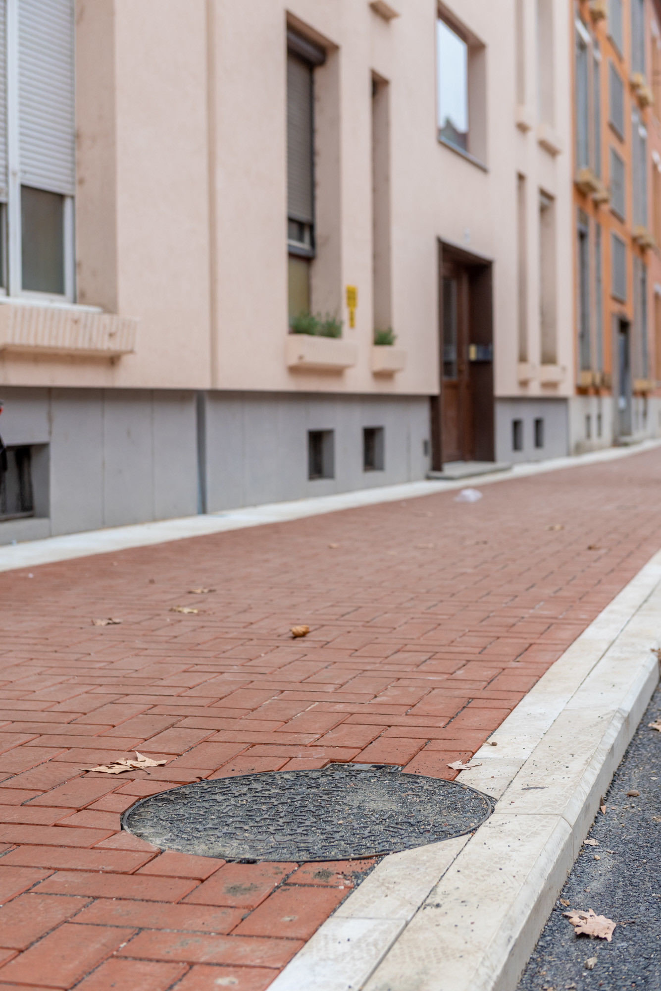 Az Oskola utcában a szegélyeket és a térburkolatokat egyedi, előregyártott betontermékekből alakítják ki, amelyek mindegyik darabját speciálisan ehhez a helyszínhez tervezték.