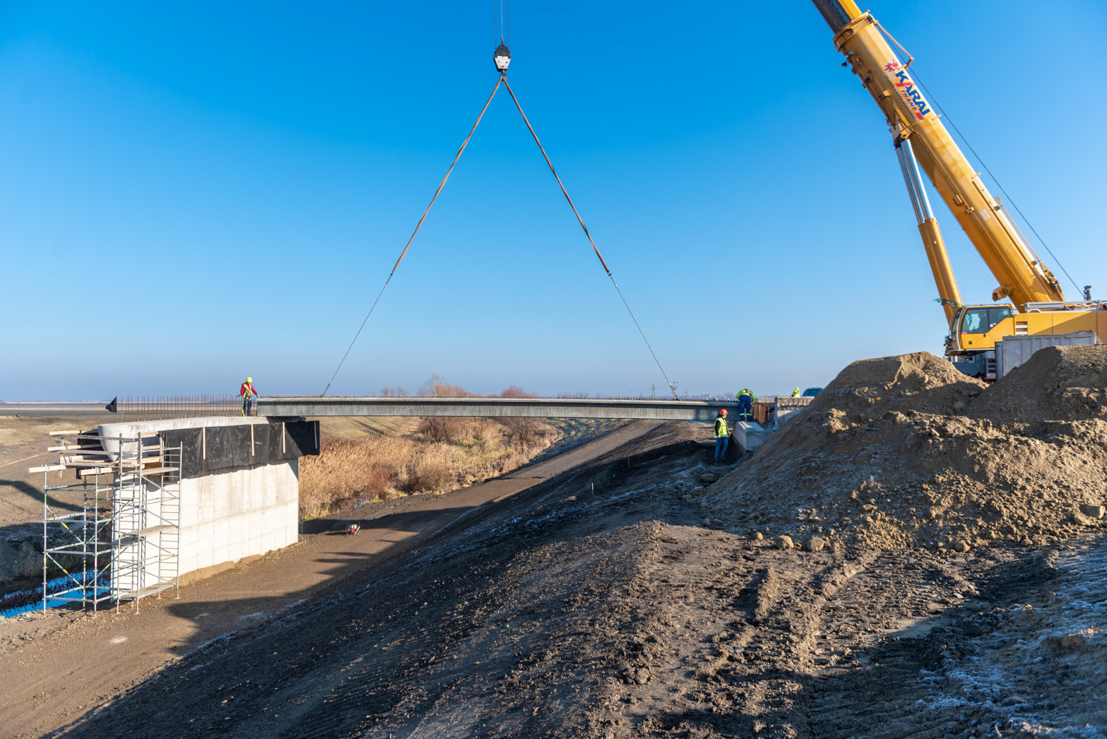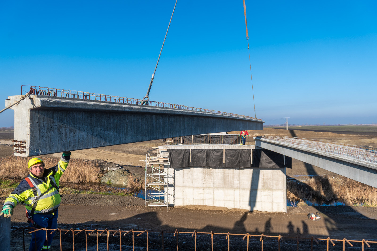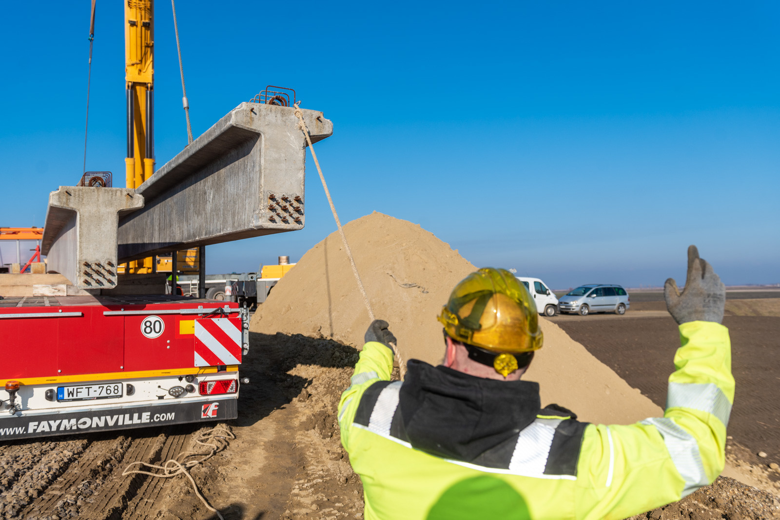 A munkálatokhoz 48 darab, egyenként 21,8 méter hosszú, 16,42 tonna súlyú előregyártott hídgerendát szállítottak a Ferrobeton Zrt. szolnoki üzeméből a helyszínre.