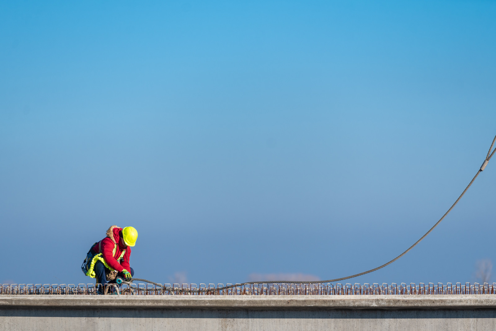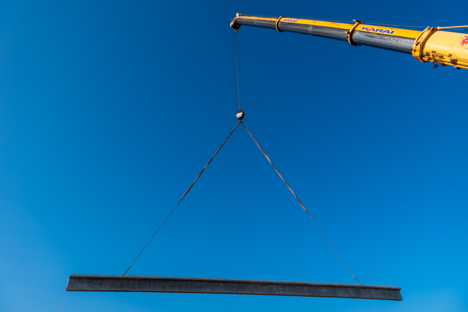 A gerendákat egy 450 tonna teherbírású daruval emelték a helyükre. A gerendák rögzítését követően további betonacél szerelési munkák és geodéziai bemérésekre került sor.