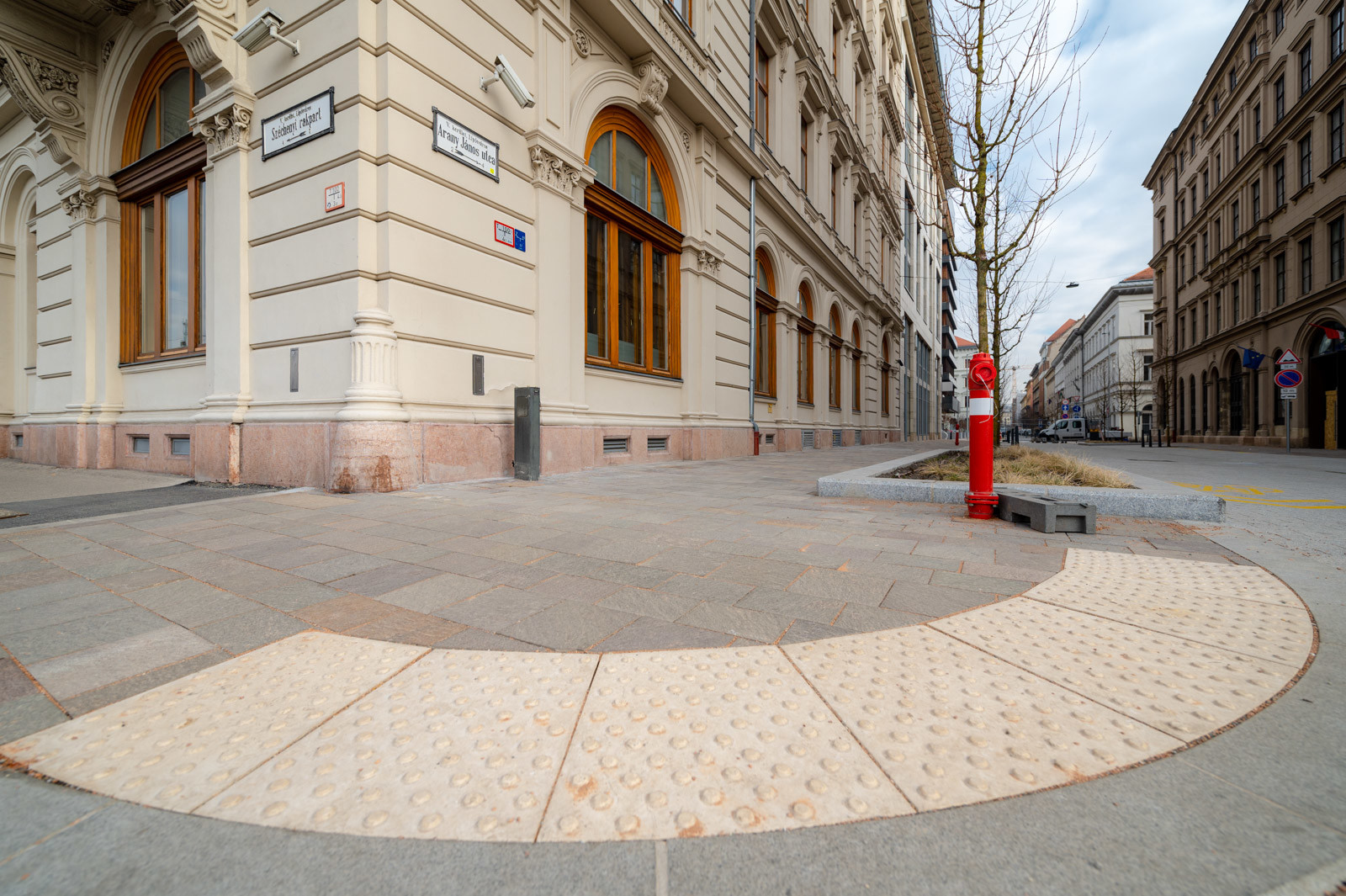 A felújítás során az épületsíkok közötti utcát teljes keresztmetszetében átépítették a szakemberek. Az öntött aszfalt járdaburkolatok helyére körülbelül 1100 négyzetméter porfír természetes kőburkolat került, az útpálya és parkolók hozzávetőlegesen 1050 négyzetméter Rosa Beta gránit burkolattal újultak meg.
