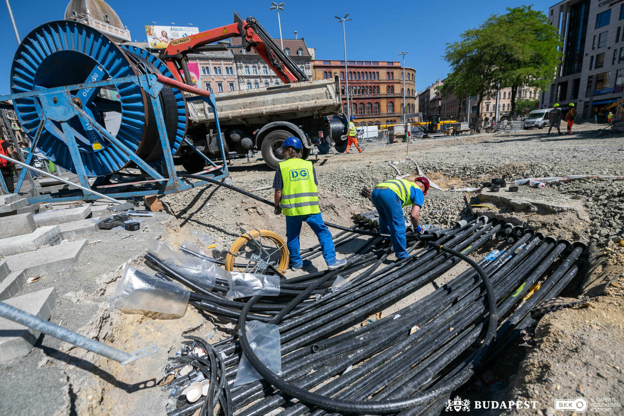 A felszín alatt elkezdték behúzni a már elkészült új kábelcsatornába a BKV földkábelt, amely fontos szerepet játszik például a nagykörúti 4-es és 6-os villamos zavartalan működtetésében.
