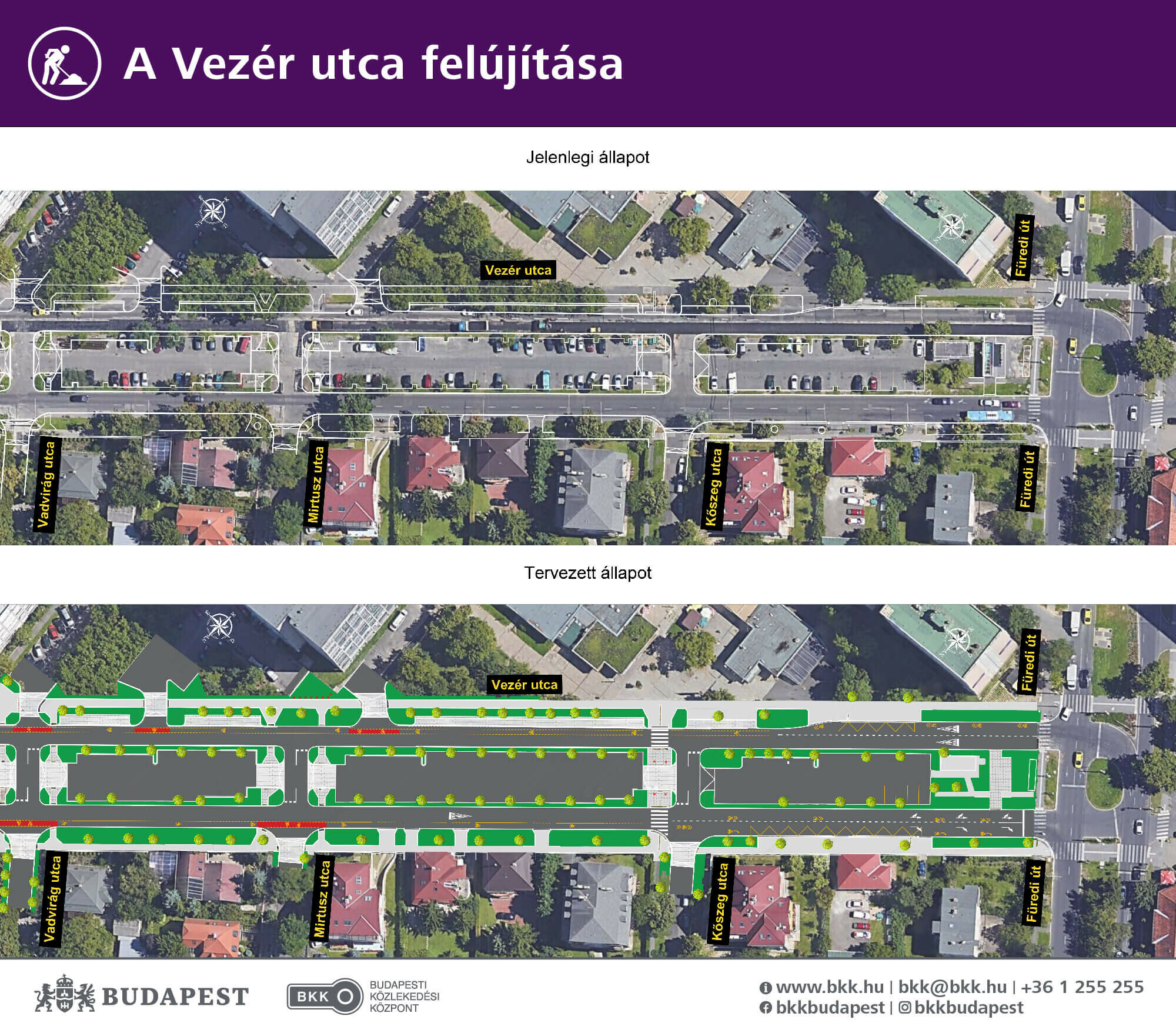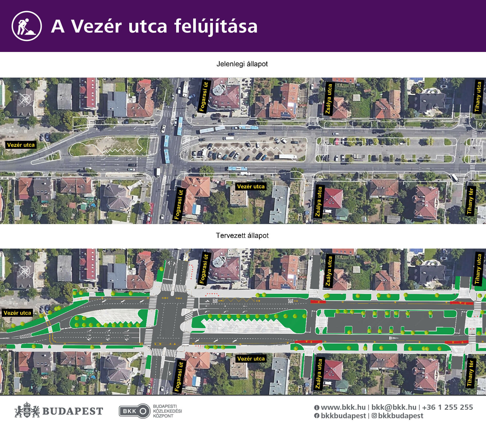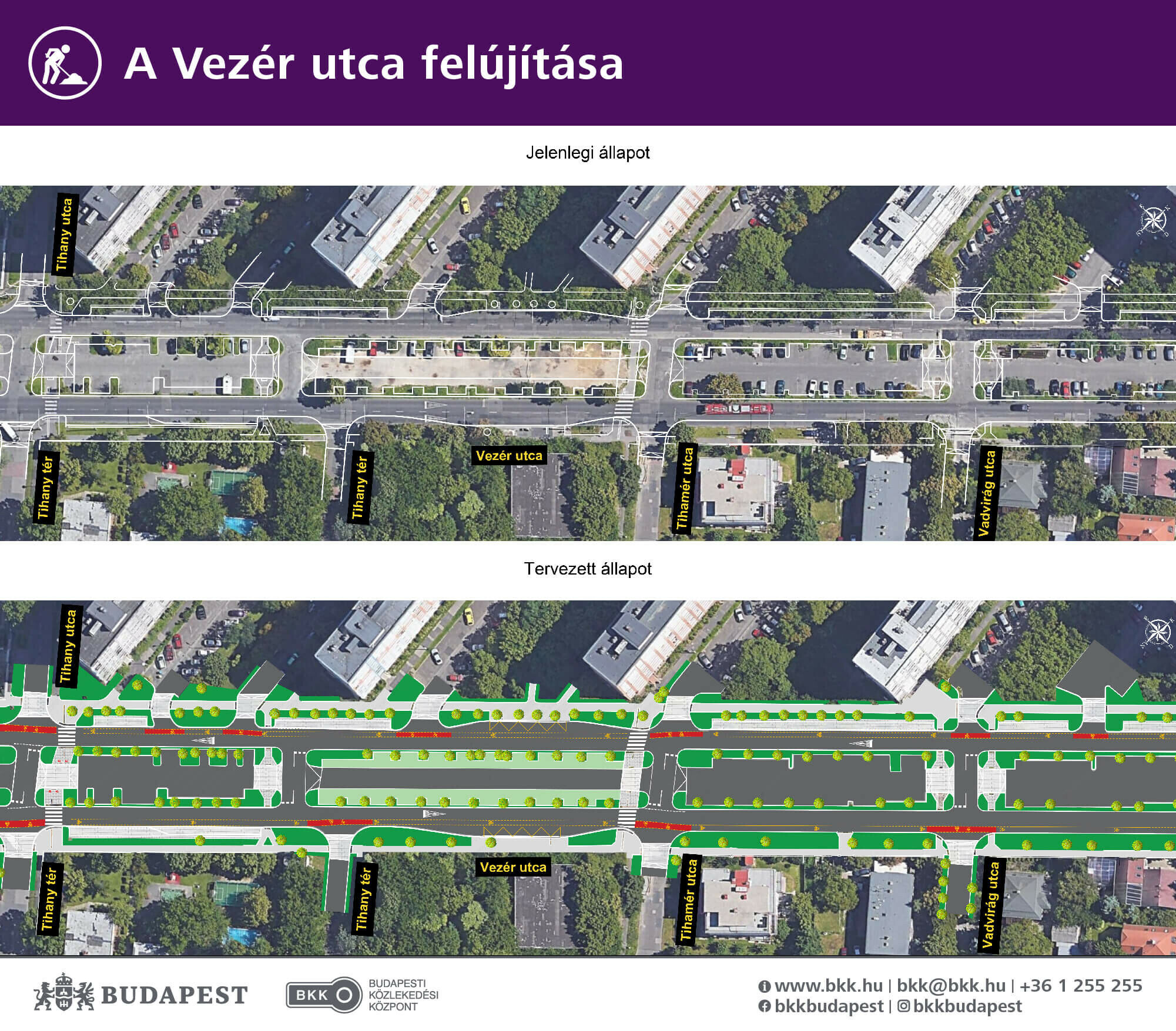 Ugyanakkor más feladatok is megvalósulnak: a Vezér utcán megszűnik egy-egy forgalmi sáv, parkolót és kerékpársávot alakítanak ki, új járdákat építenek, illetve taktilis figyelmeztető és tájékoztató burkolattal is biztosítják majd az akadálymentes és biztonságos közlekedést.