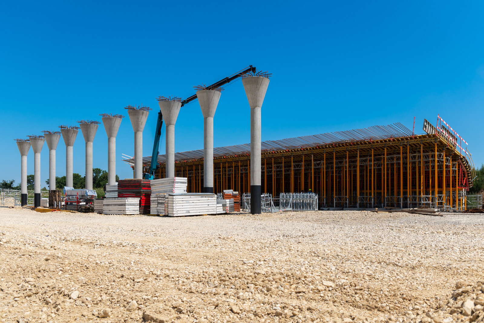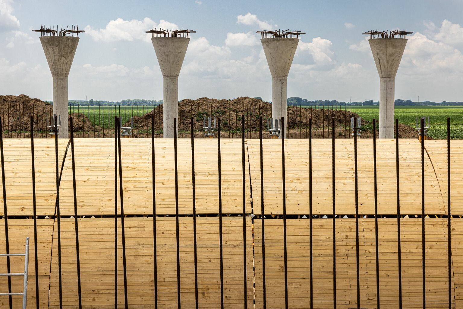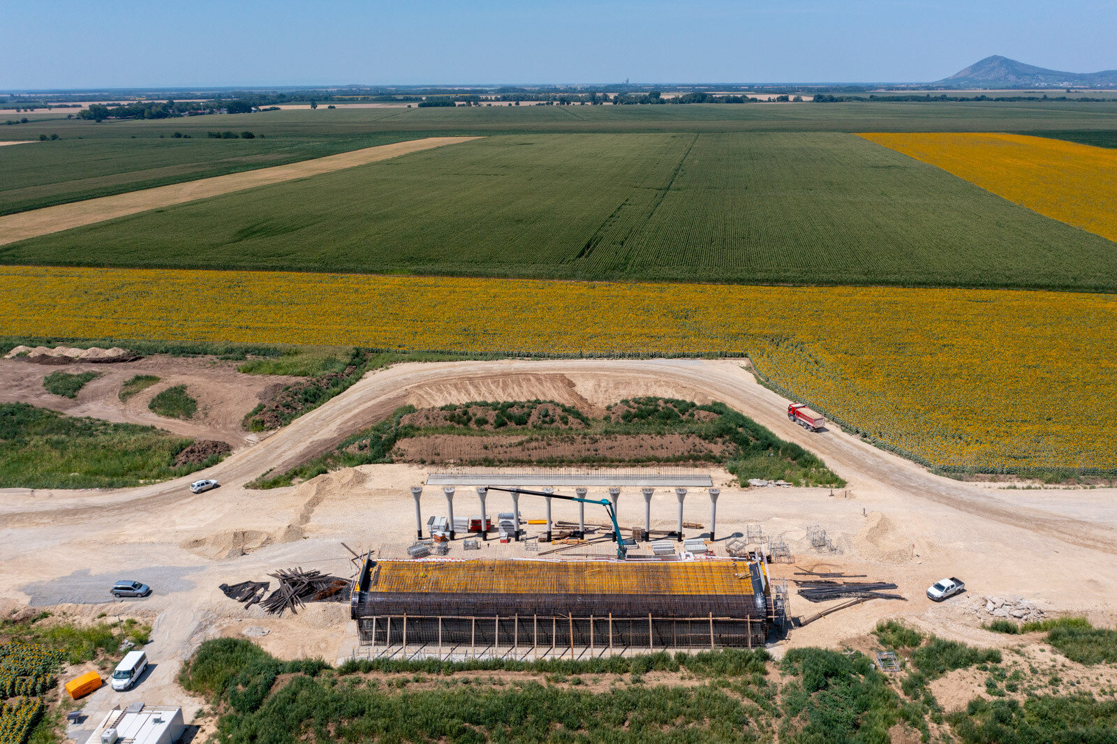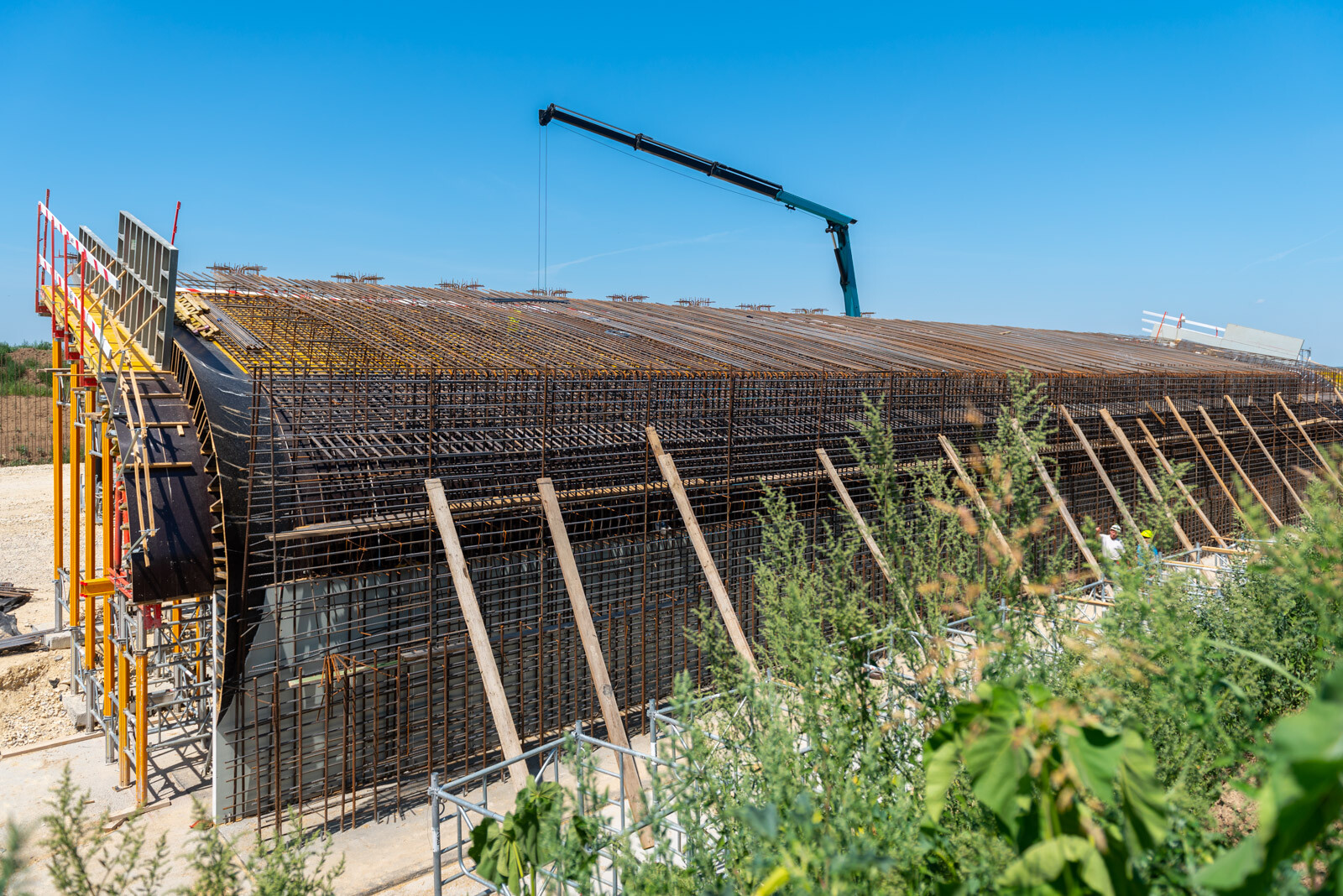 Balogh Ádám a kivitelezés kapcsán ismertette, hogy a műtárgyat a Duna Aszfalt Zrt. építi. „A vadátjáró közbenső támaszának oszlopai elkészültek, jelenleg a keleti oldali hídfő zsaluzása és vasszerelése zajlik. A zsaluzat egyedi alakja kihívás elé állítja a kivitelezőket, akik példamutató igényességgel és körültekintéssel hajtják végre a nem mindennapi feladatot. A rendszeres tervezői konzultációknak köszönhetően az esetlegesen felmerülő problémákat időben és hatékonyan tudtuk kezelni.”
