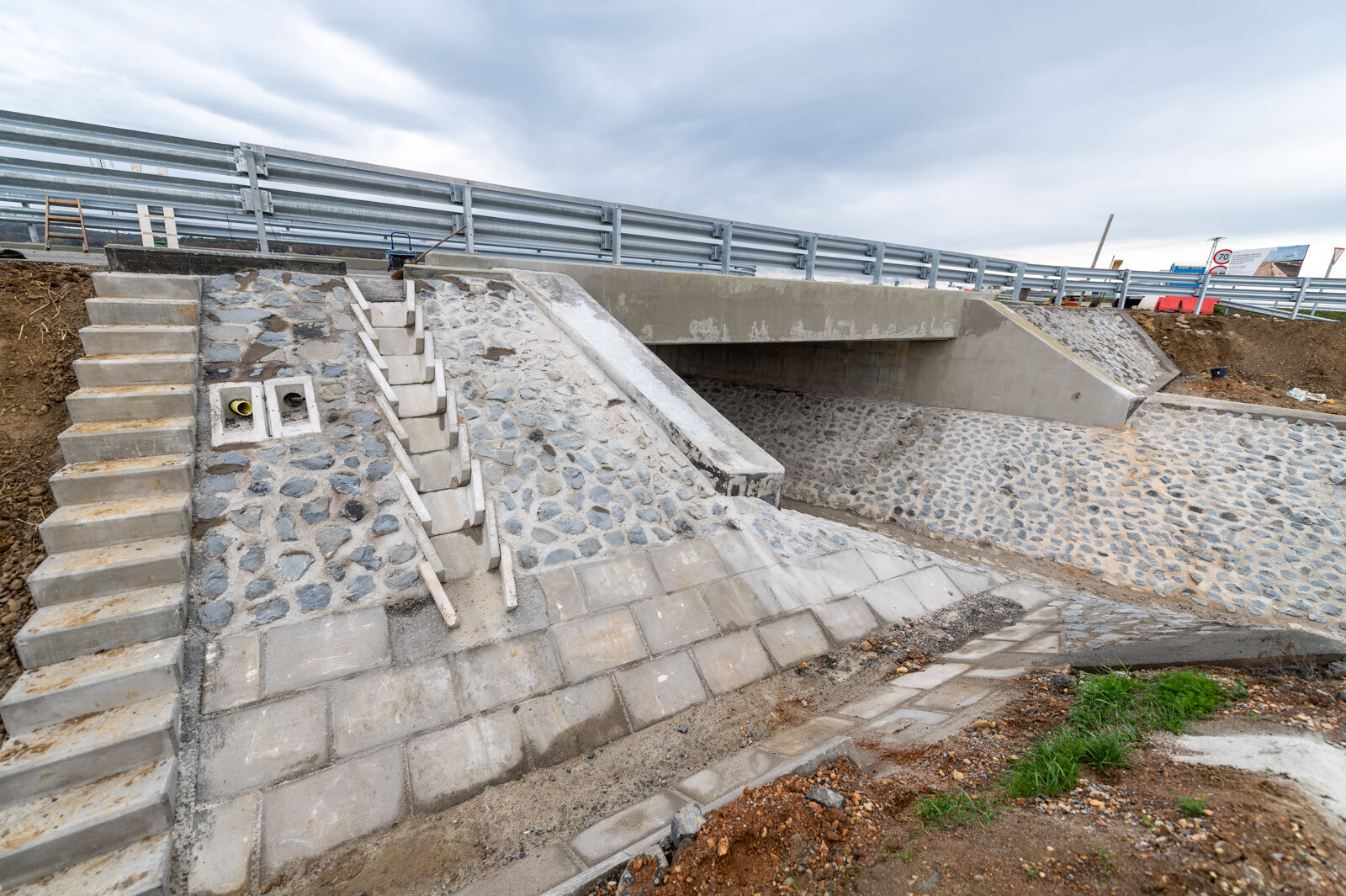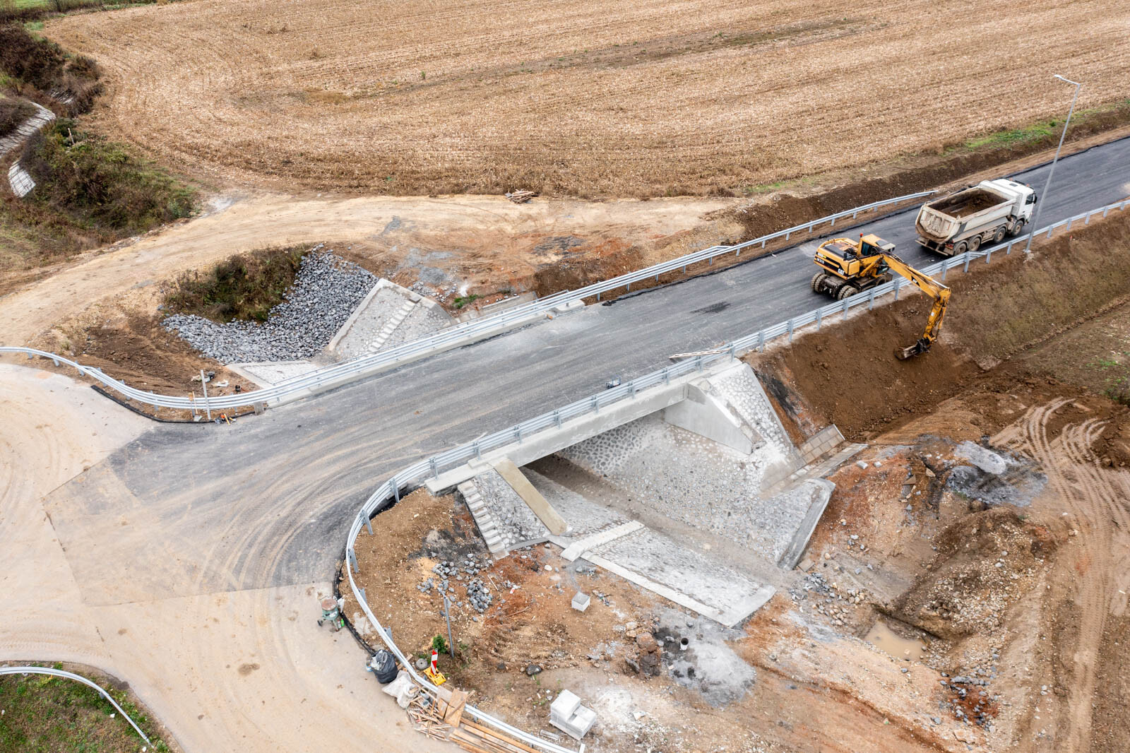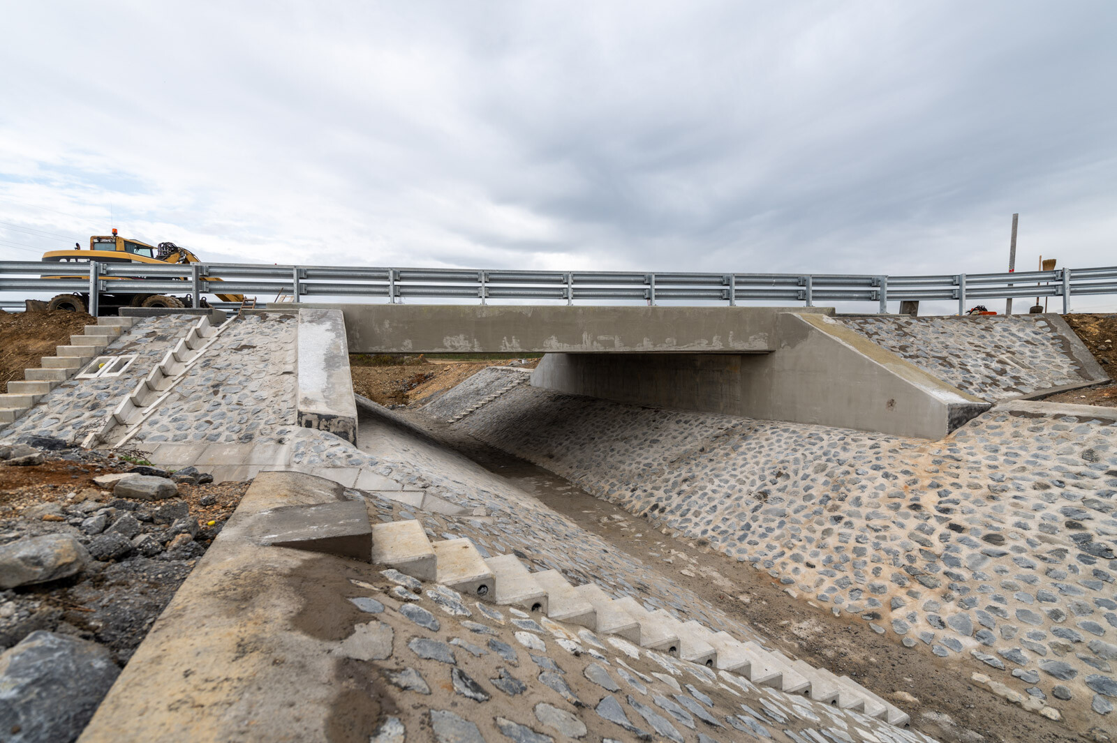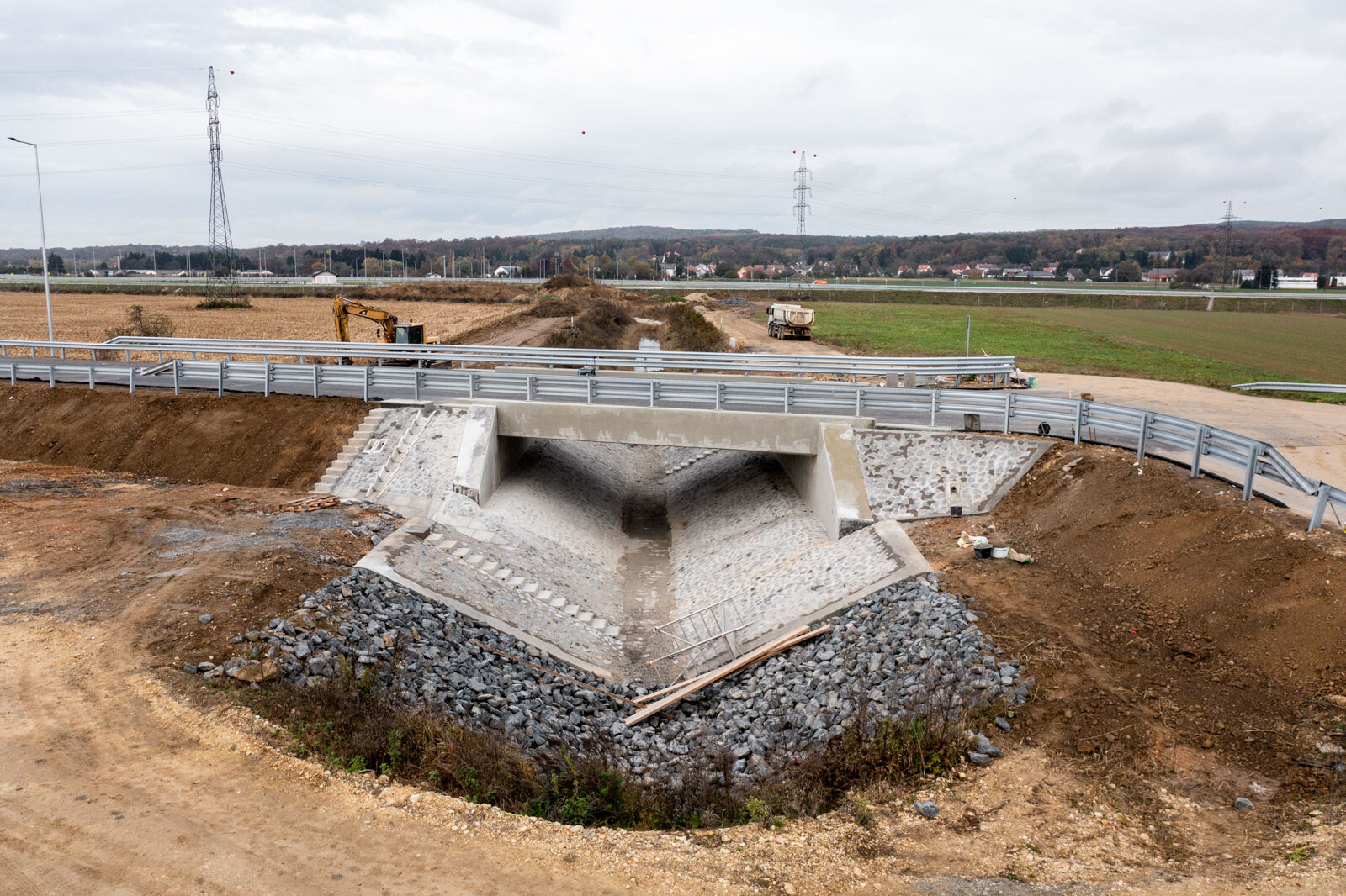 A NIF Zrt. által megadott információk szerint a lapunk által legutóbb májusban bemutatott projektben a Rábafüzesi-patak megépült felüljáróján már elkészült a hídszegély melletti öntött aszfalt kiöntés is. Emellett folyamatban van a híd alatti rézsű kőburkolat készítése, a híd vizsgáló lépcsőinek elhelyezése, a rézsűk humuszolása és füvesítése, valamint a híd és a csatlakozó út szalagkorlátjainak az építése is. A beruházásban az útszakaszhoz kapcsolódó közvilágítási, vízvezeték és szennyvízhálózat is megvalósul.