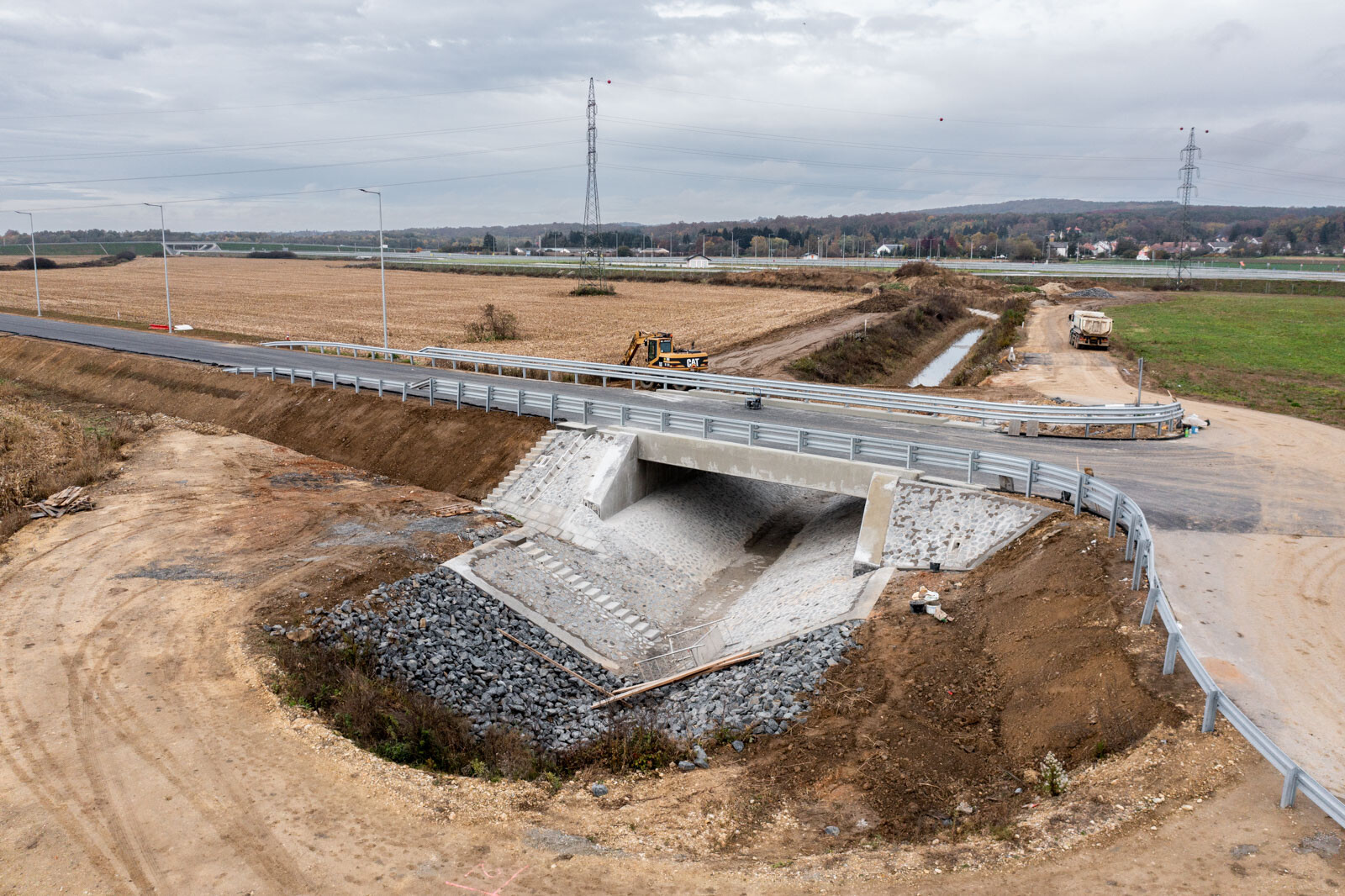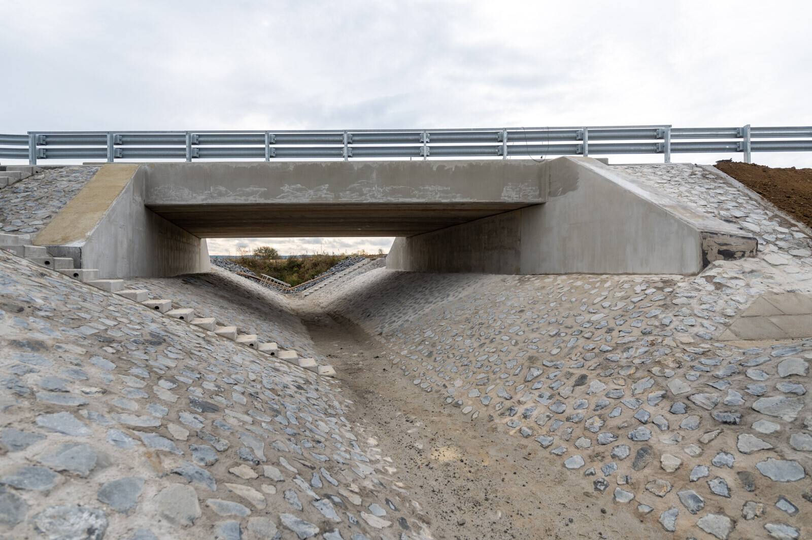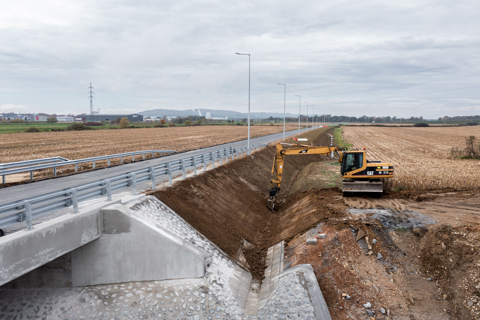 A NIF Zrt. által megadott információk szerint a lapunk által legutóbb májusban bemutatott projektben a Rábafüzesi-patak megépült felüljáróján már elkészült a hídszegély melletti öntött aszfalt kiöntés is. Emellett folyamatban van a híd alatti rézsű kőburkolat készítése, a híd vizsgáló lépcsőinek elhelyezése, a rézsűk humuszolása és füvesítése, valamint a híd és a csatlakozó út szalagkorlátjainak az építése is. A beruházásban az útszakaszhoz kapcsolódó közvilágítási, vízvezeték és szennyvízhálózat is megvalósul.