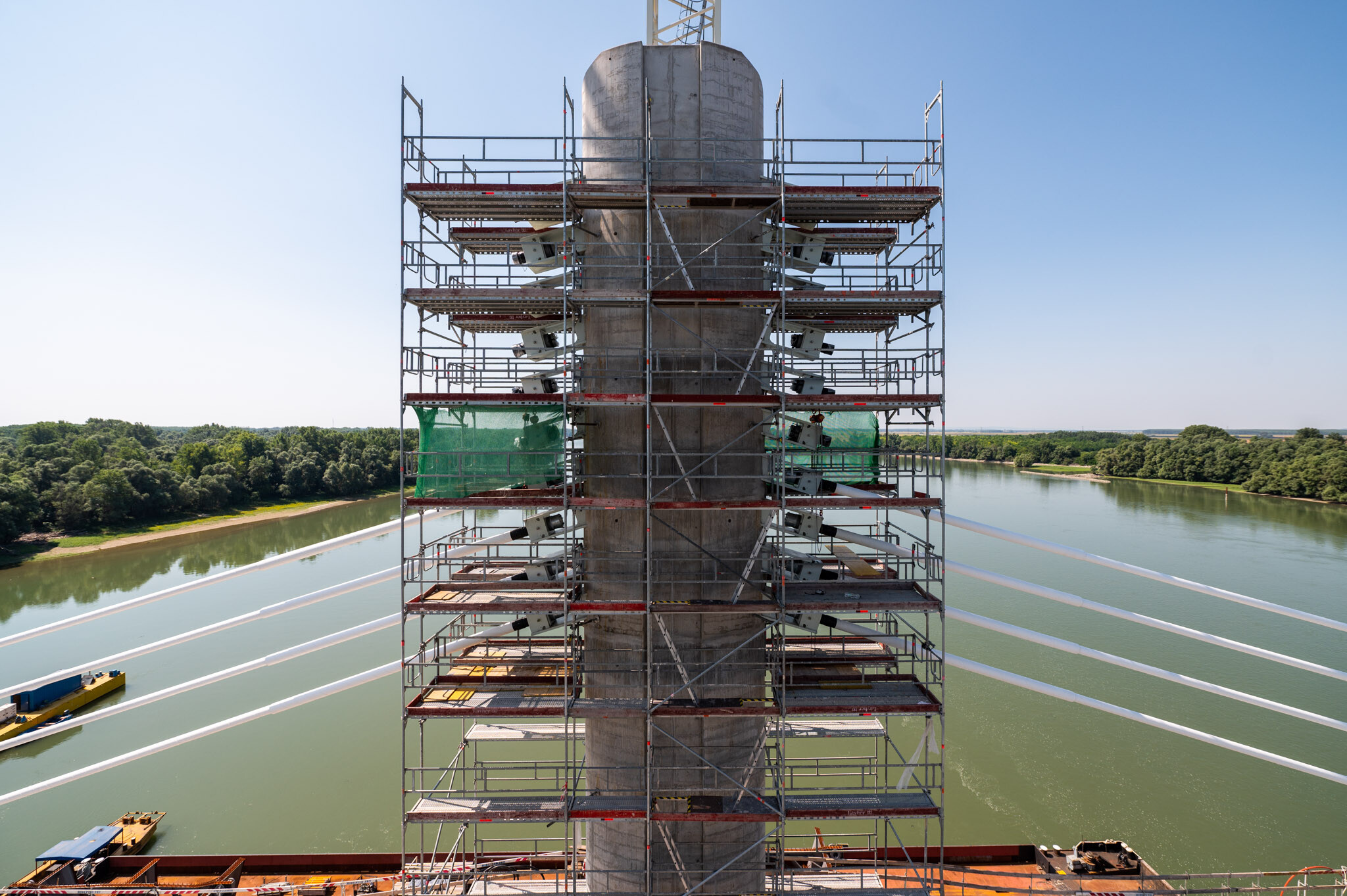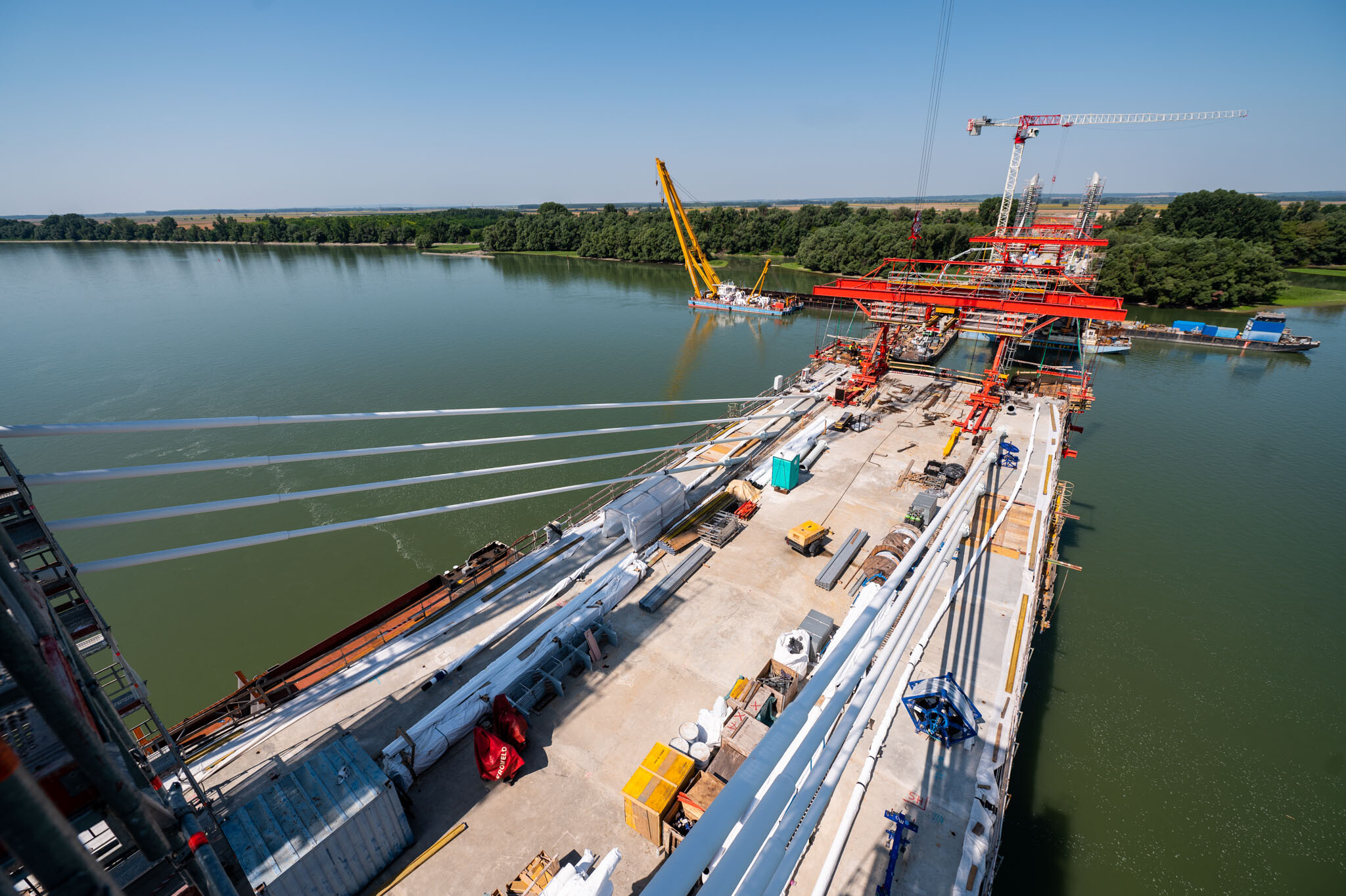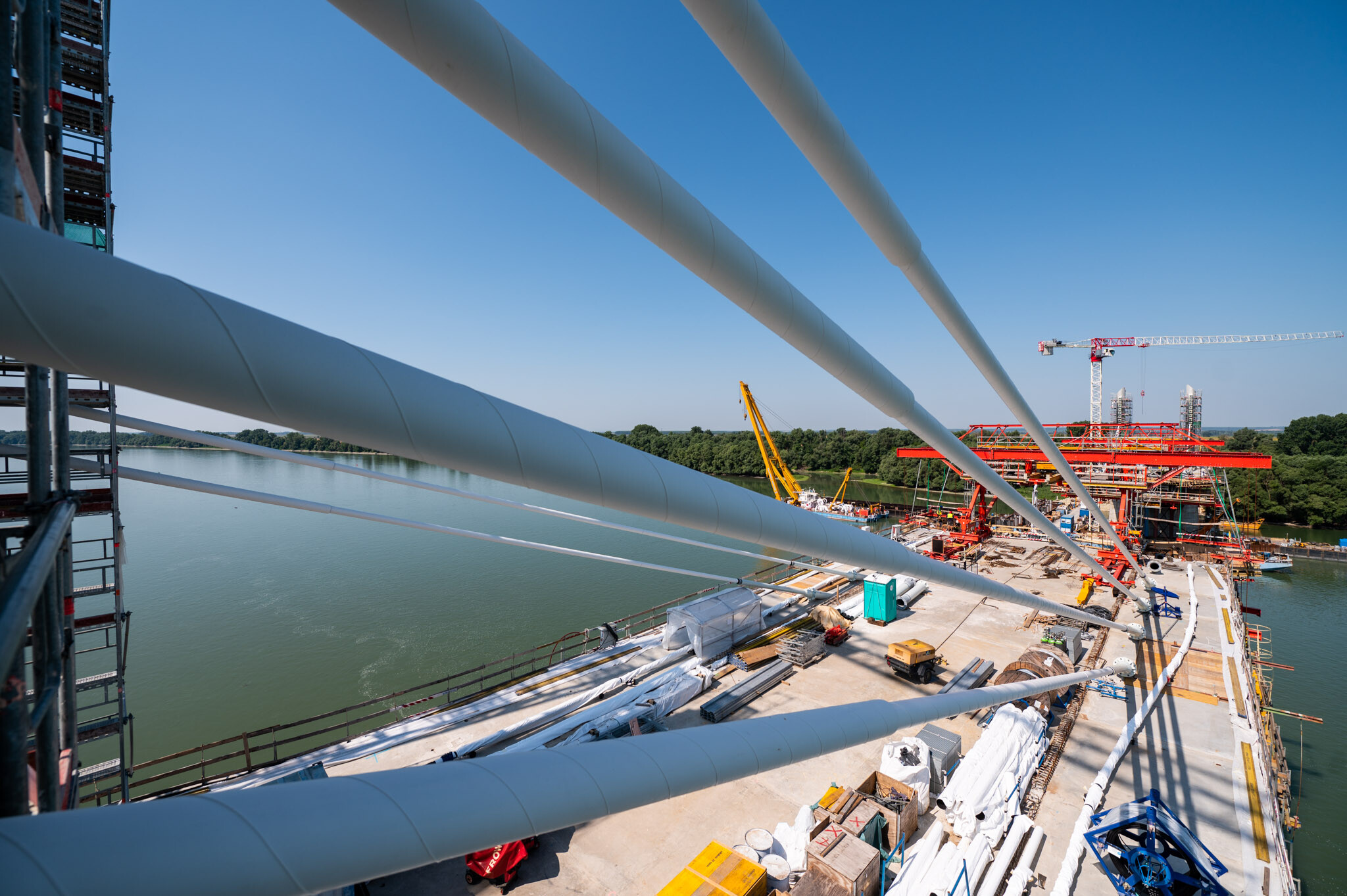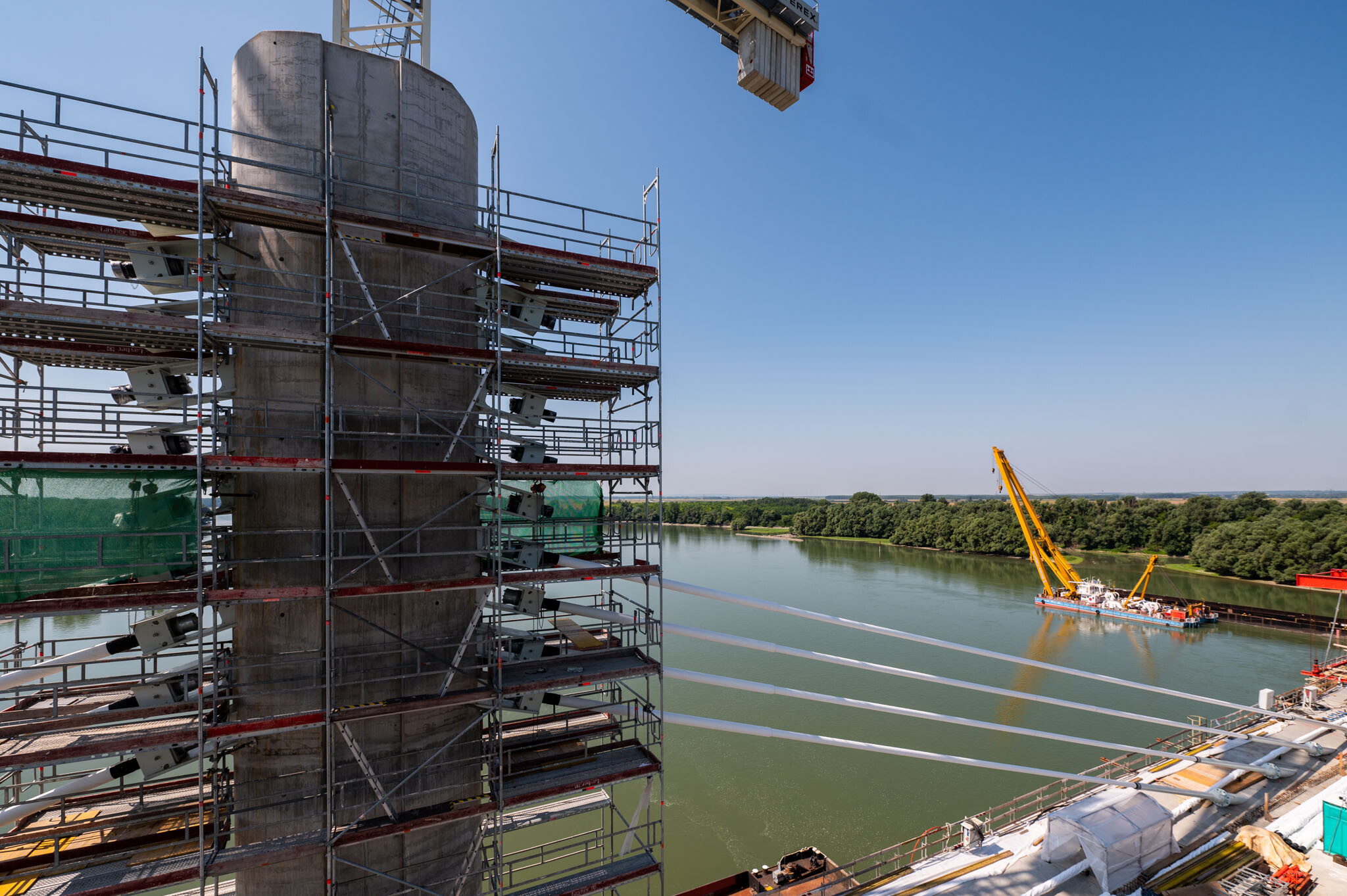 Az átlagos Duna vízszint fölé 40 méterrel magasodó 5. támasz feletti pilon – a fotógaléria készítésének időpontjában − már 4 szintnyi (4x4=16db) ferdekábellel vett részt a szabadon szerelt mederhíd teherviselésében, míg a 6. támasz feletti pilonon 3 szint (3x4=12db) ferdekábelt feszítettek meg a PANNON-FREYSSINET Kft. szakemberei.
