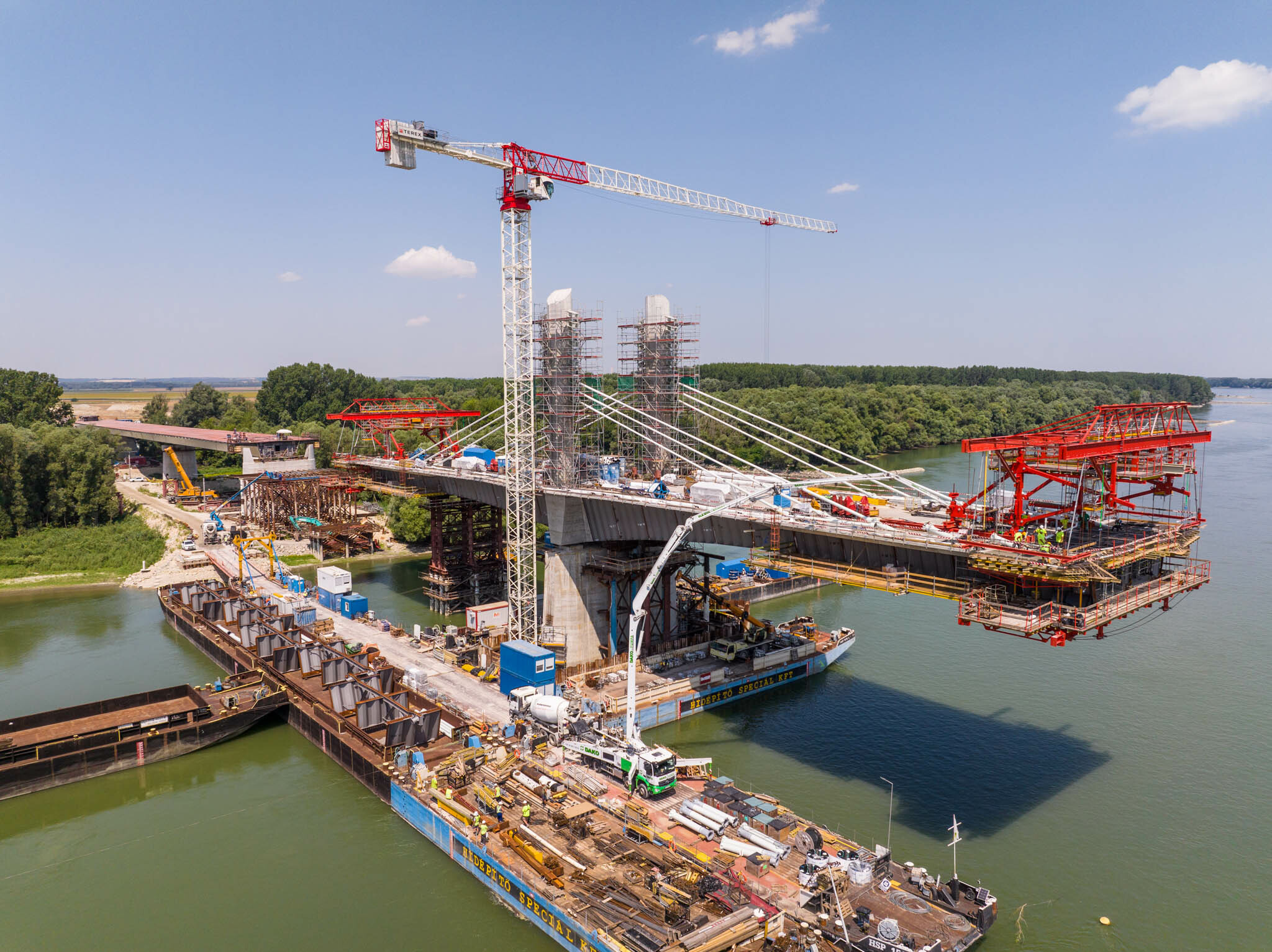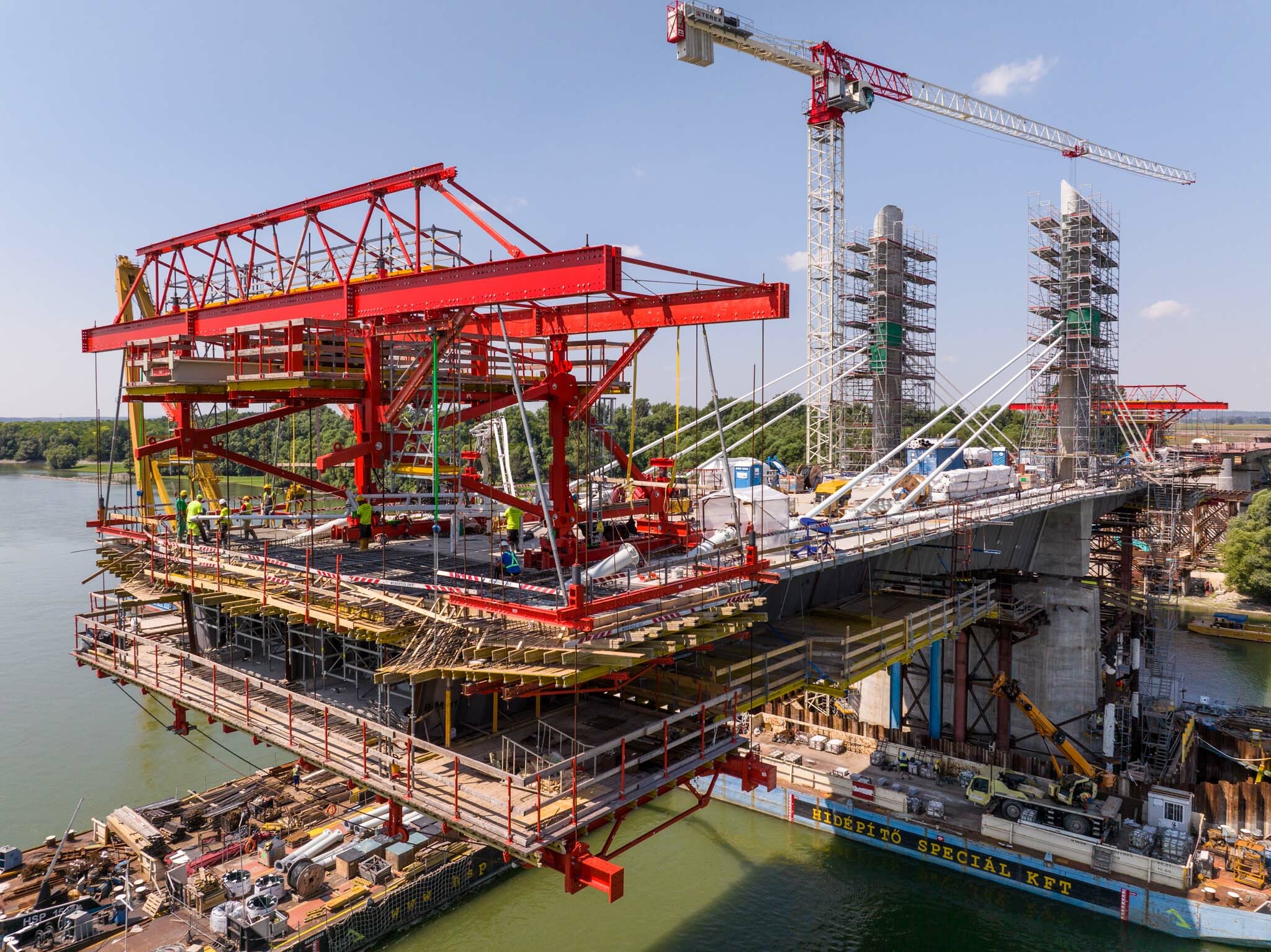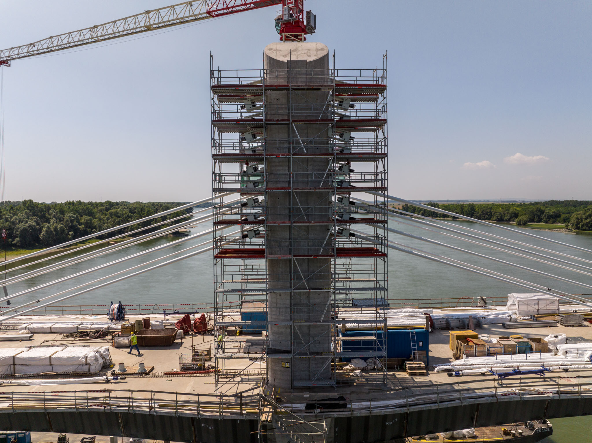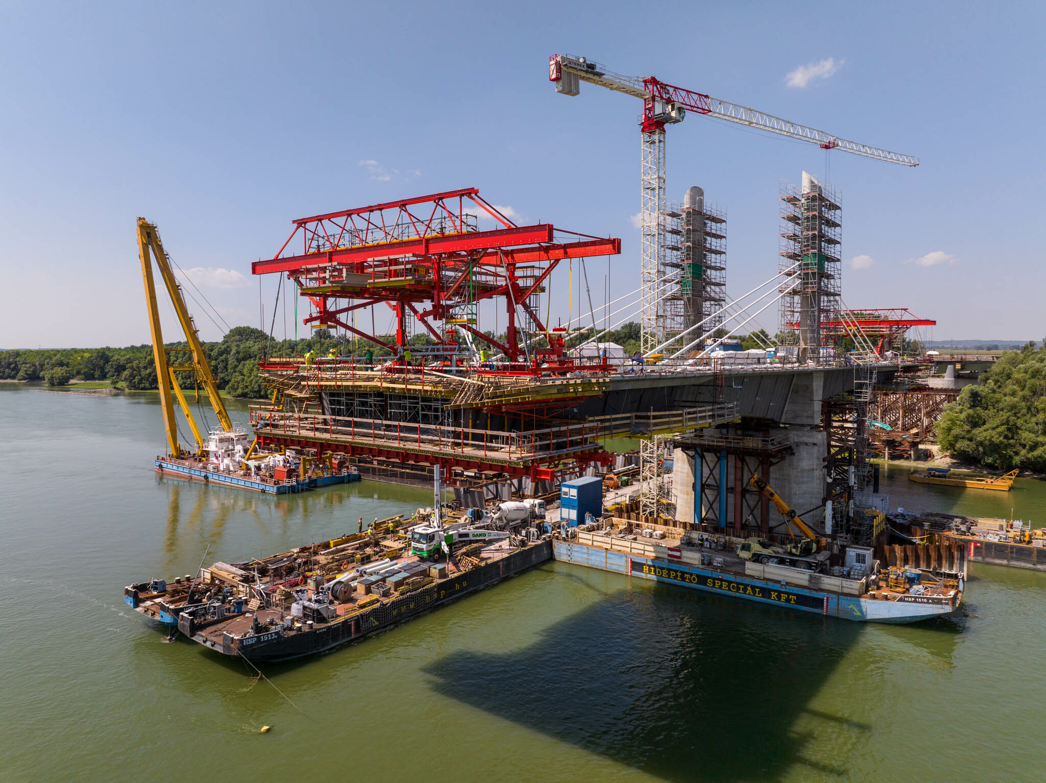 Az átlagos Duna vízszint fölé 40 méterrel magasodó 5. támasz feletti pilon – a fotógaléria készítésének időpontjában − már 4 szintnyi (4x4=16db) ferdekábellel vett részt a szabadon szerelt mederhíd teherviselésében, míg a 6. támasz feletti pilonon 3 szint (3x4=12db) ferdekábelt feszítettek meg a PANNON-FREYSSINET Kft. szakemberei.