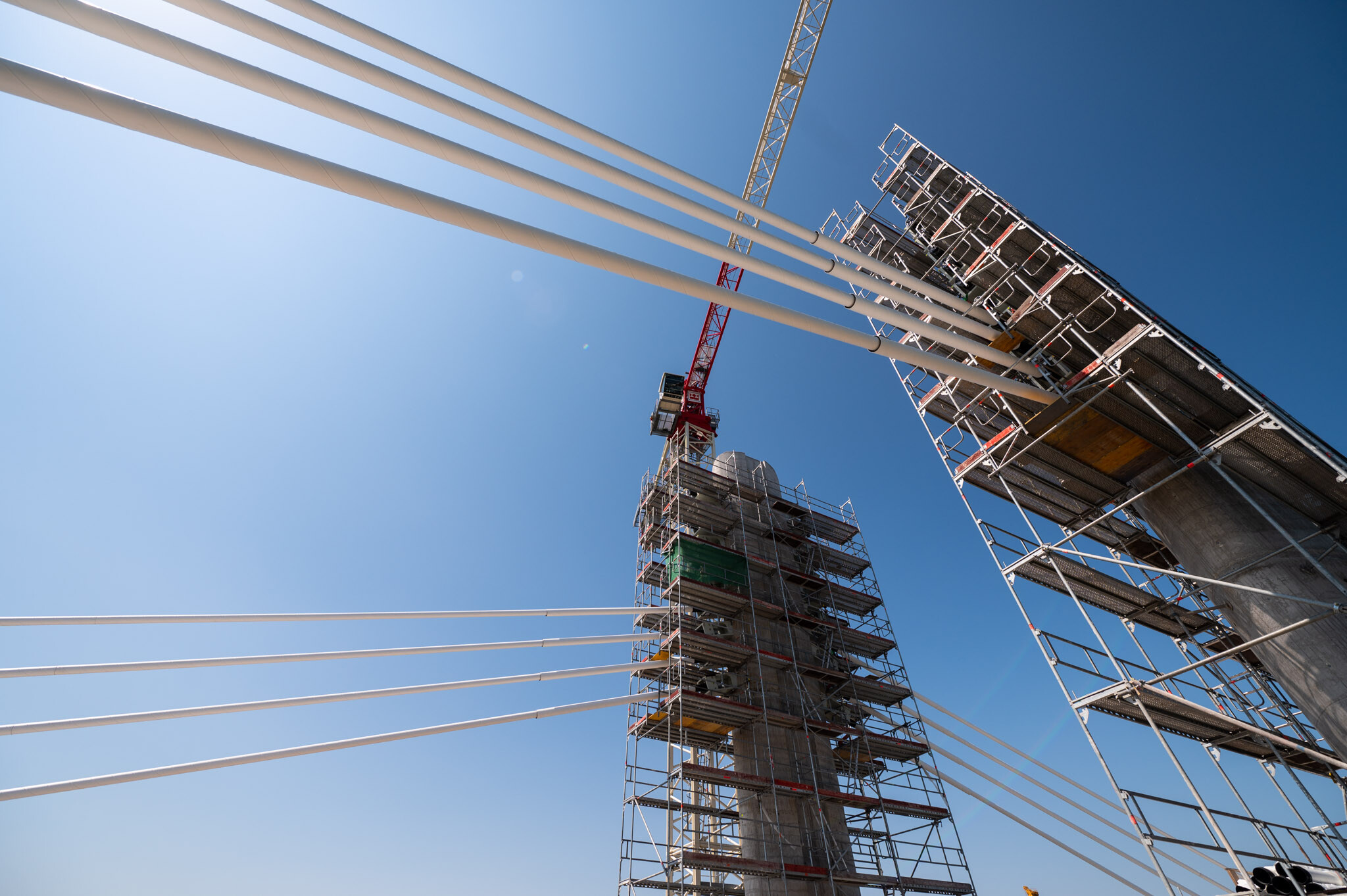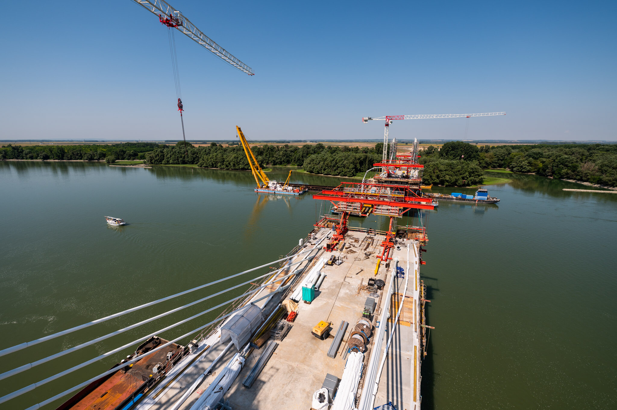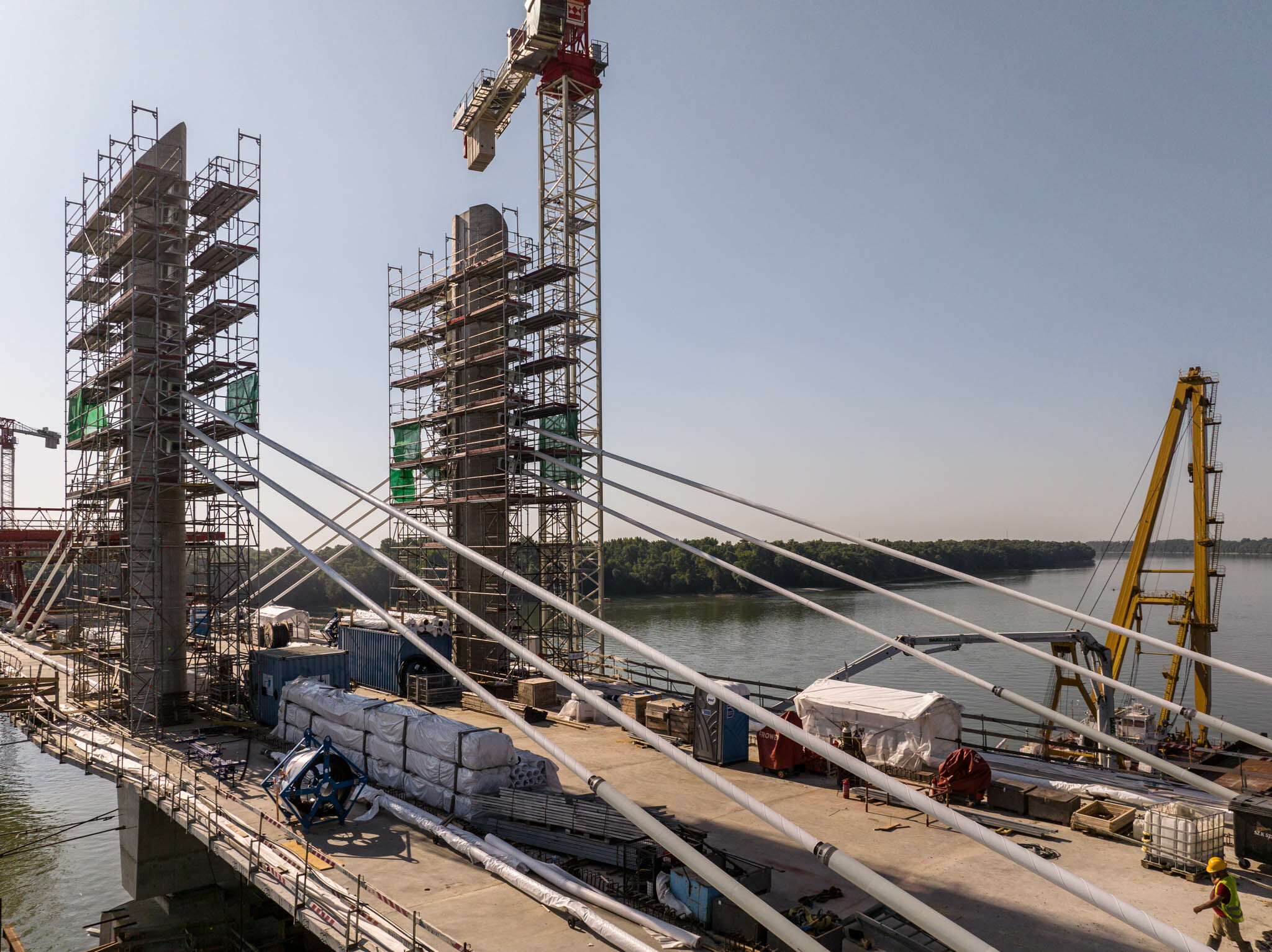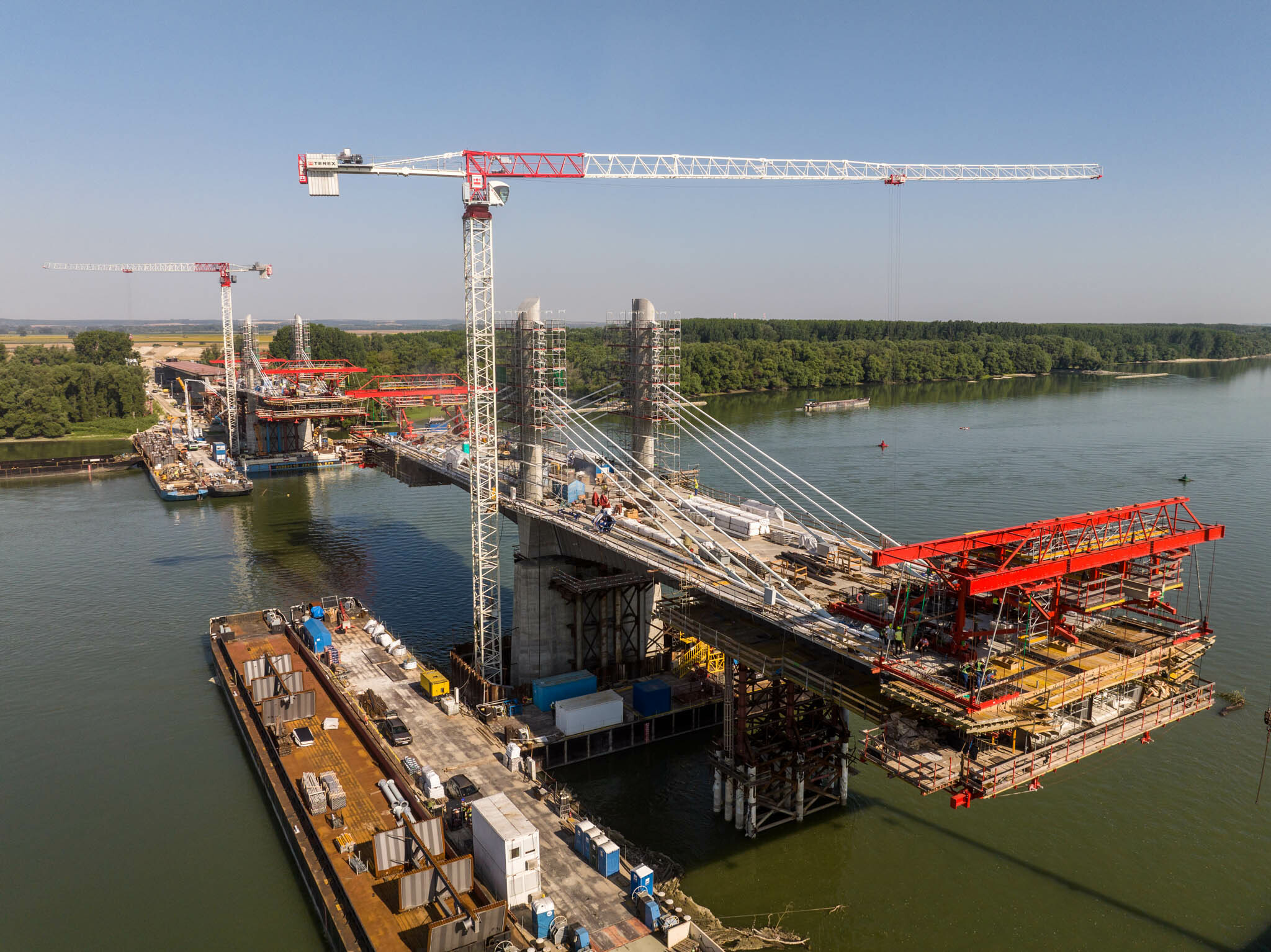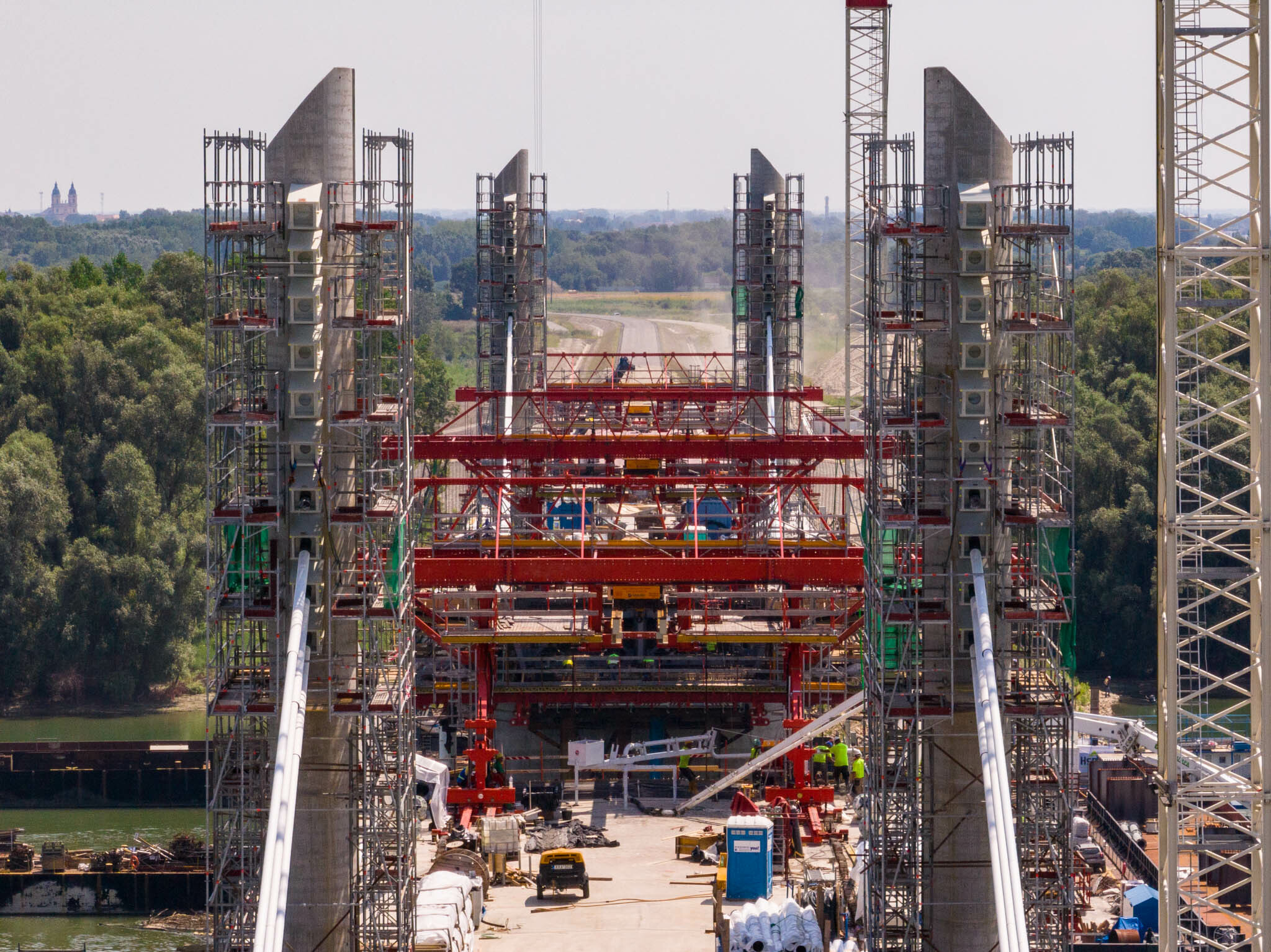 Az átlagos Duna vízszint fölé 40 méterrel magasodó 5. támasz feletti pilon – a fotógaléria készítésének időpontjában − már 4 szintnyi (4x4=16db) ferdekábellel vett részt a szabadon szerelt mederhíd teherviselésében, míg a 6. támasz feletti pilonon 3 szint (3x4=12db) ferdekábelt feszítettek meg a PANNON-FREYSSINET Kft. szakemberei.