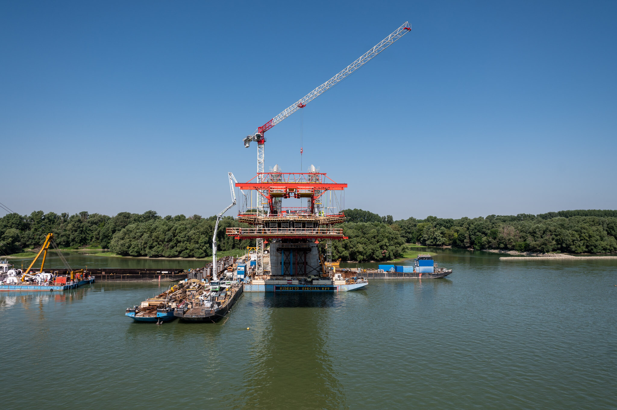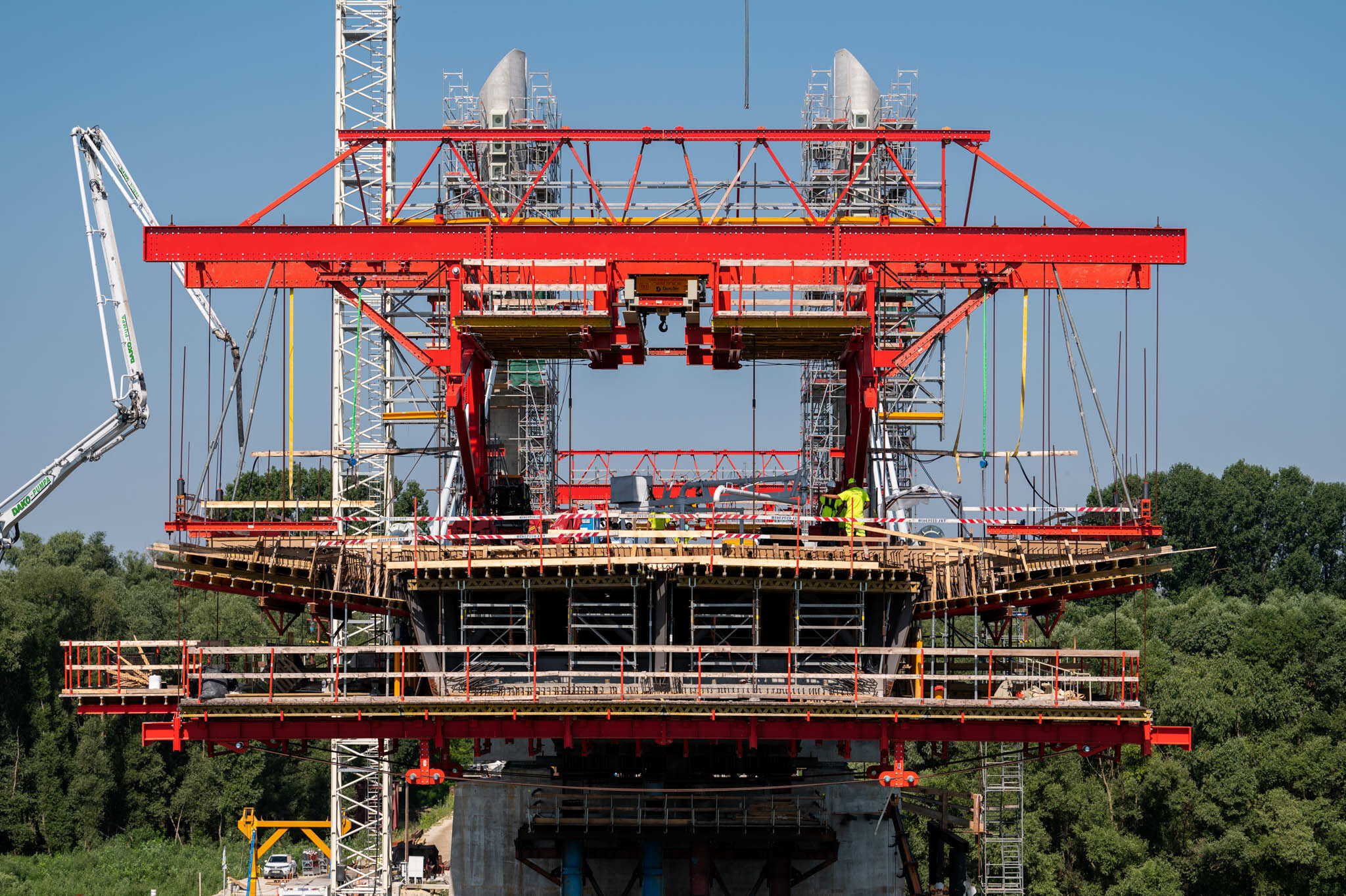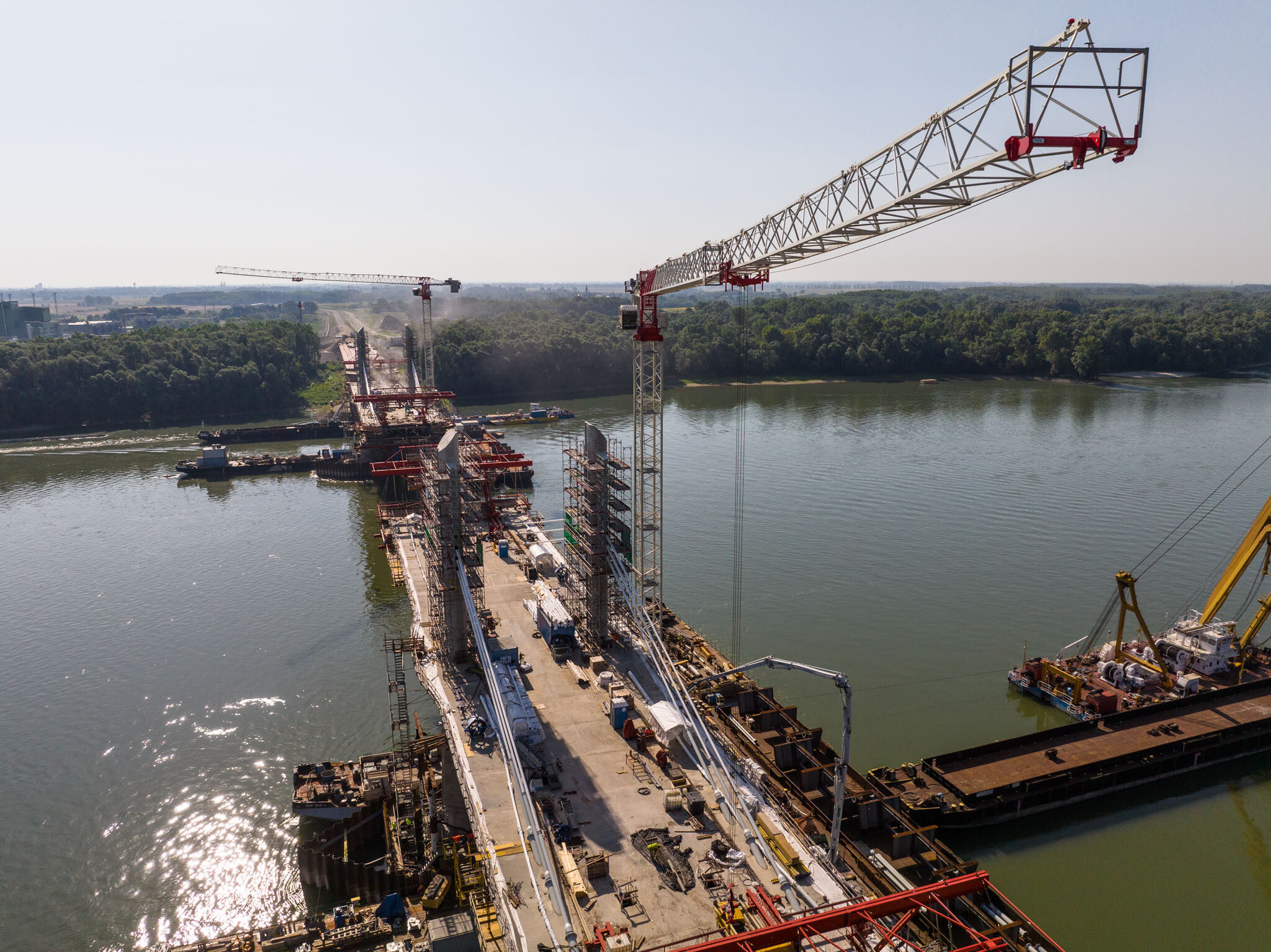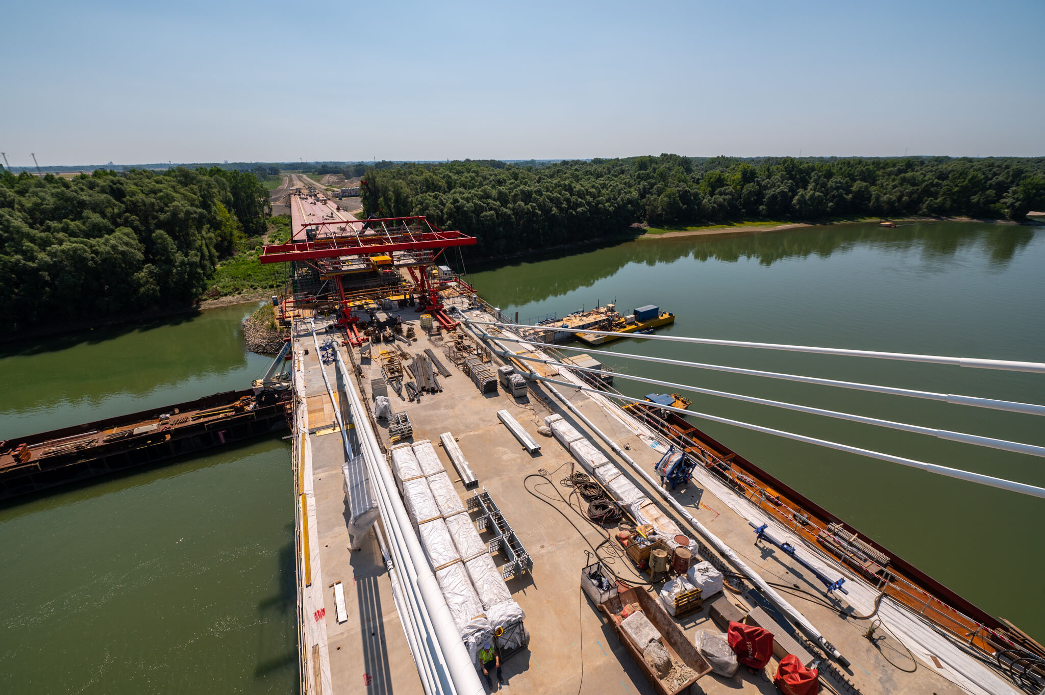 Az átlagos Duna vízszint fölé 40 méterrel magasodó 5. támasz feletti pilon – a fotógaléria készítésének időpontjában − már 4 szintnyi (4x4=16db) ferdekábellel vett részt a szabadon szerelt mederhíd teherviselésében, míg a 6. támasz feletti pilonon 3 szint (3x4=12db) ferdekábelt feszítettek meg a PANNON-FREYSSINET Kft. szakemberei.