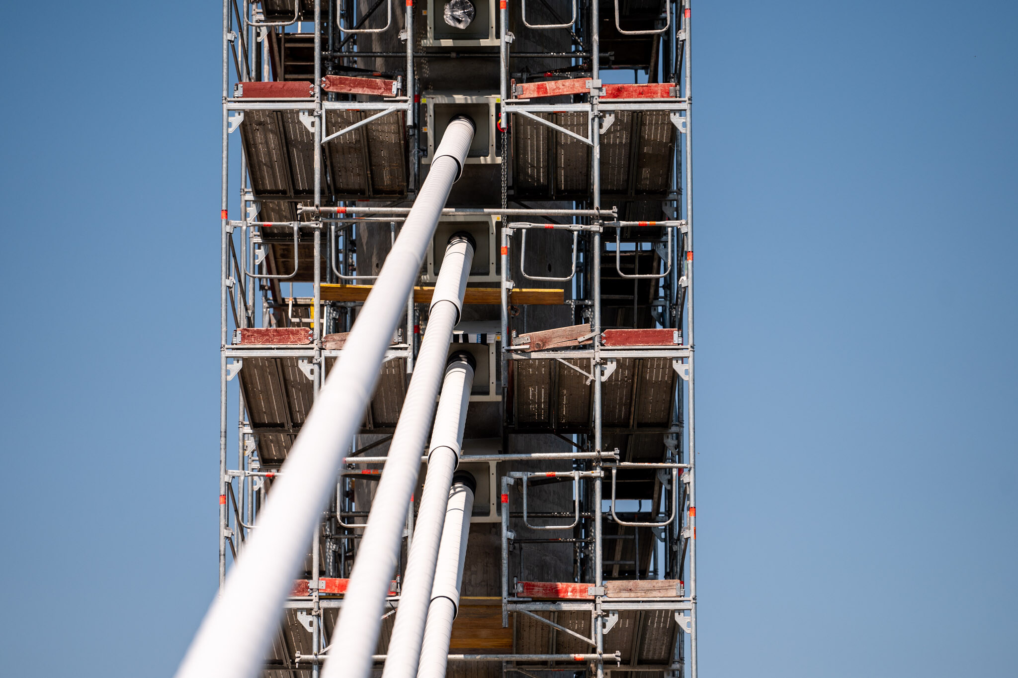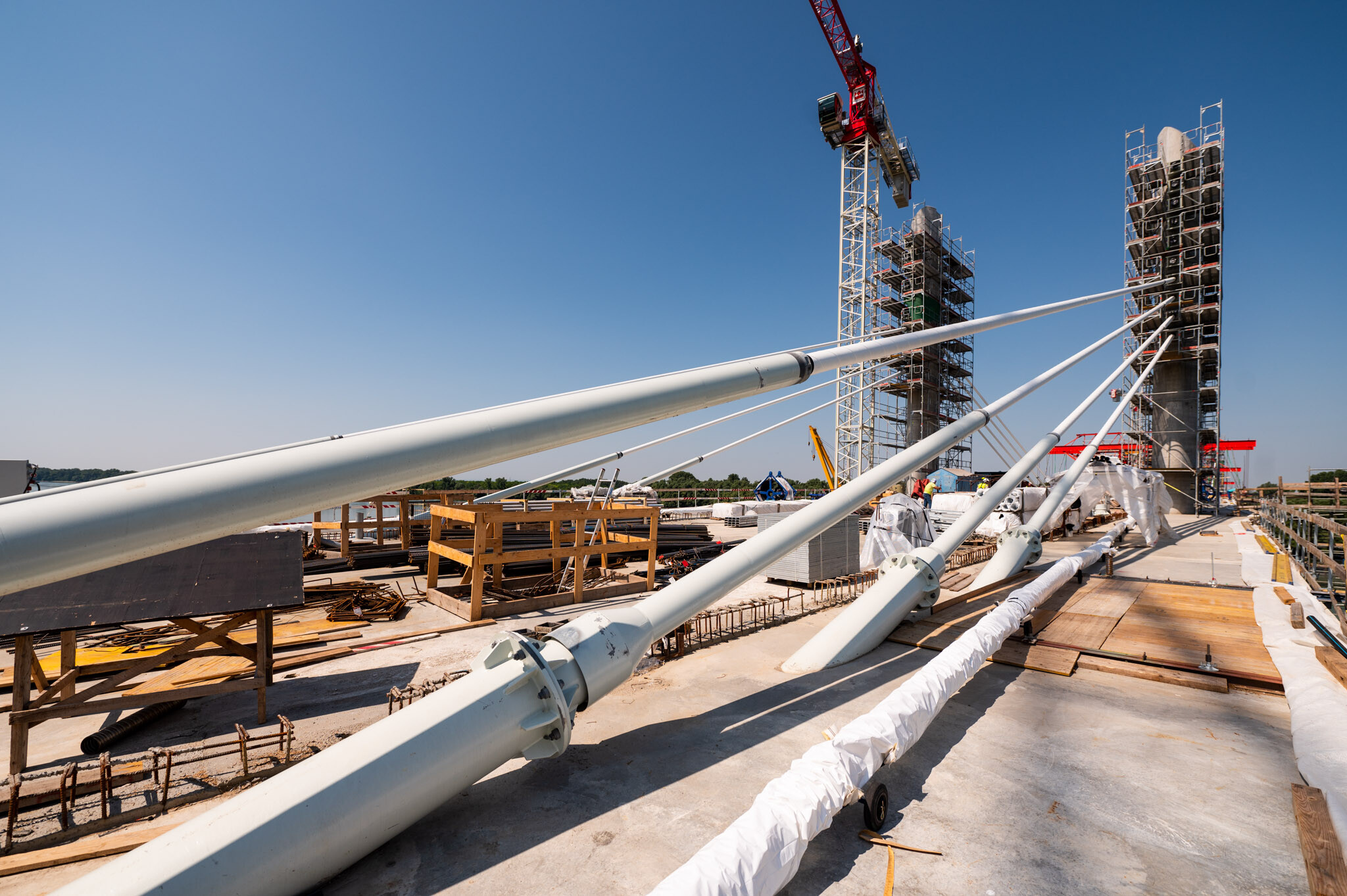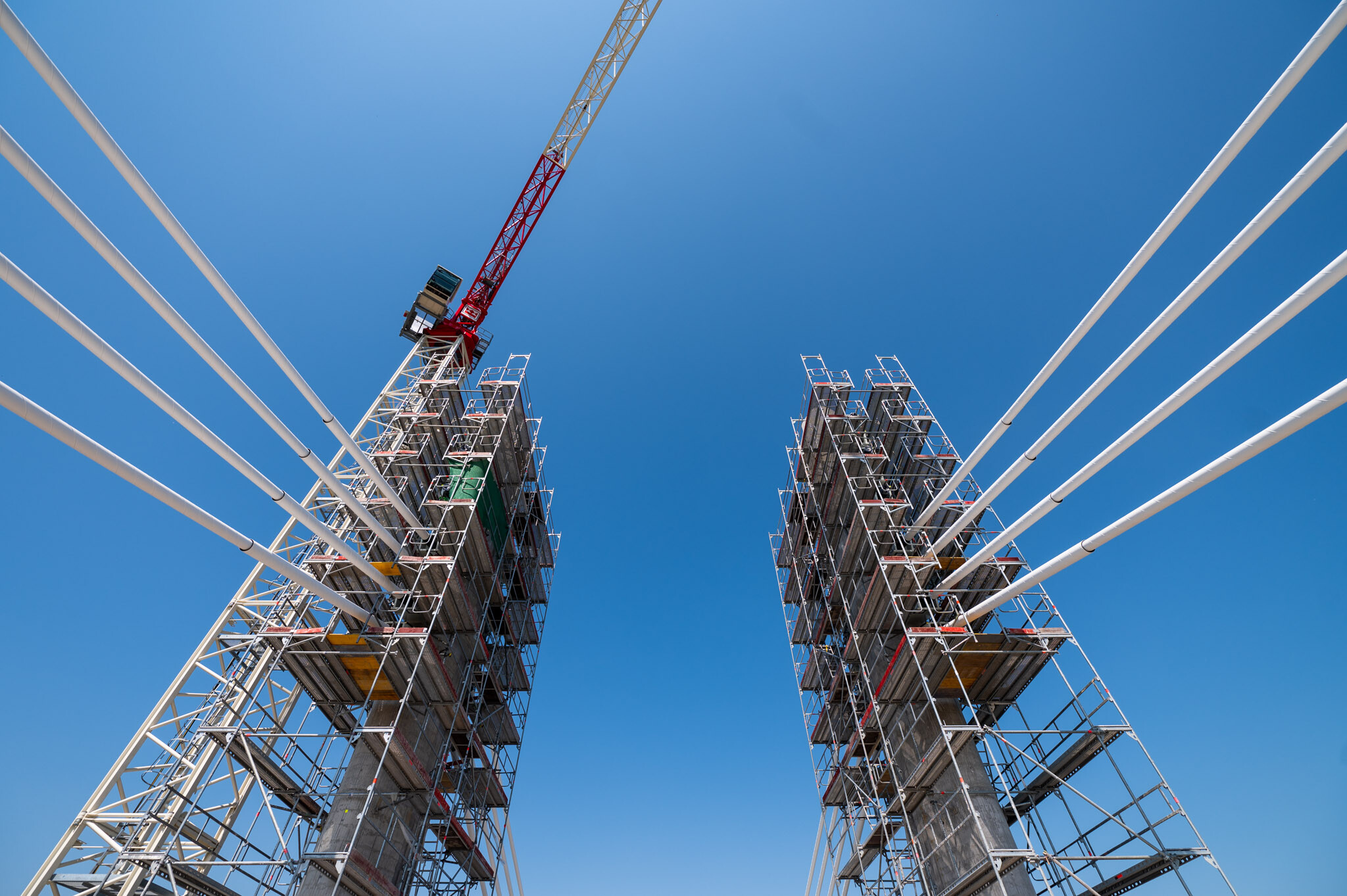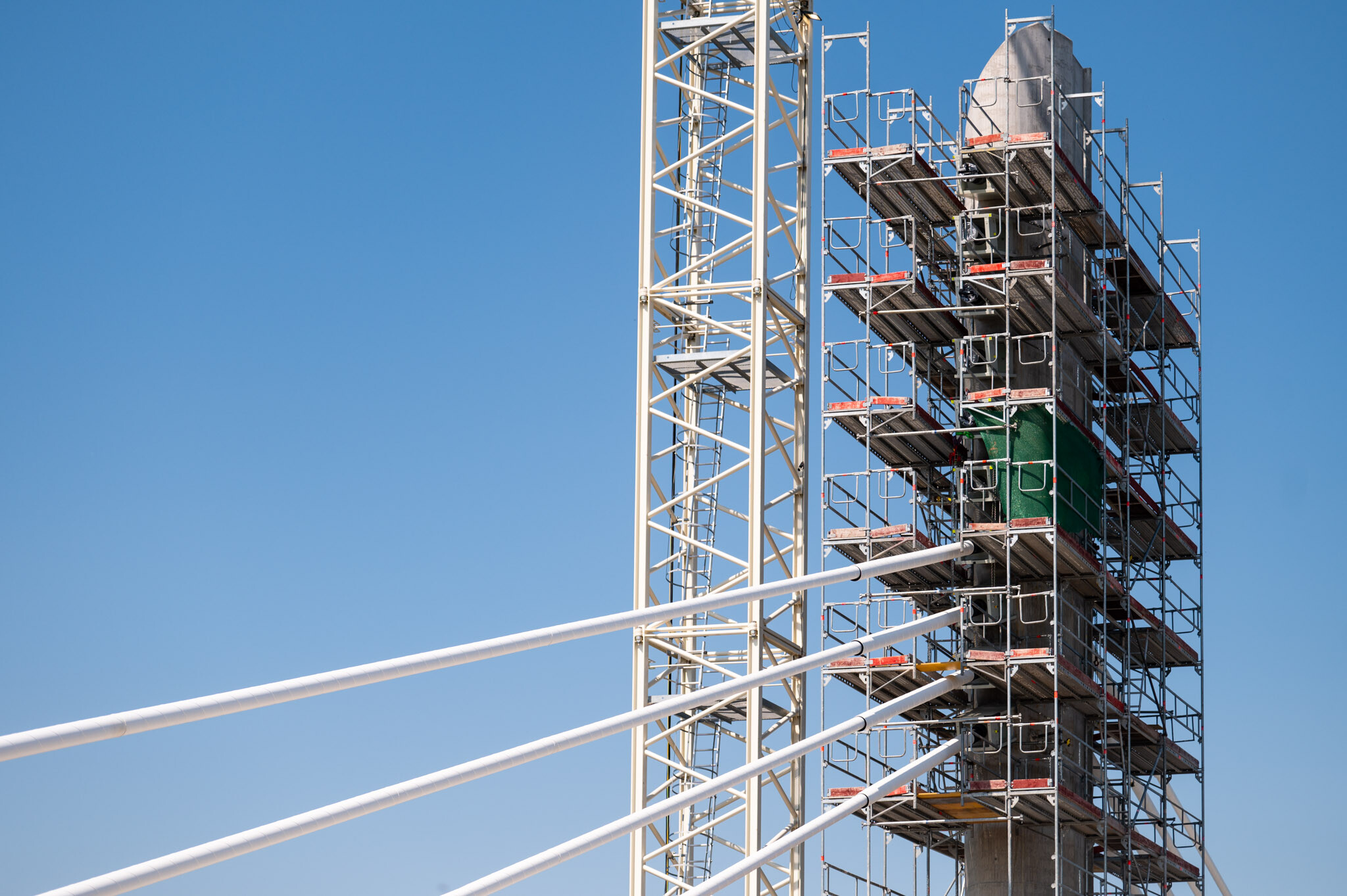 Az átlagos Duna vízszint fölé 40 méterrel magasodó 5. támasz feletti pilon – a fotógaléria készítésének időpontjában − már 4 szintnyi (4x4=16db) ferdekábellel vett részt a szabadon szerelt mederhíd teherviselésében, míg a 6. támasz feletti pilonon 3 szint (3x4=12db) ferdekábelt feszítettek meg a PANNON-FREYSSINET Kft. szakemberei.