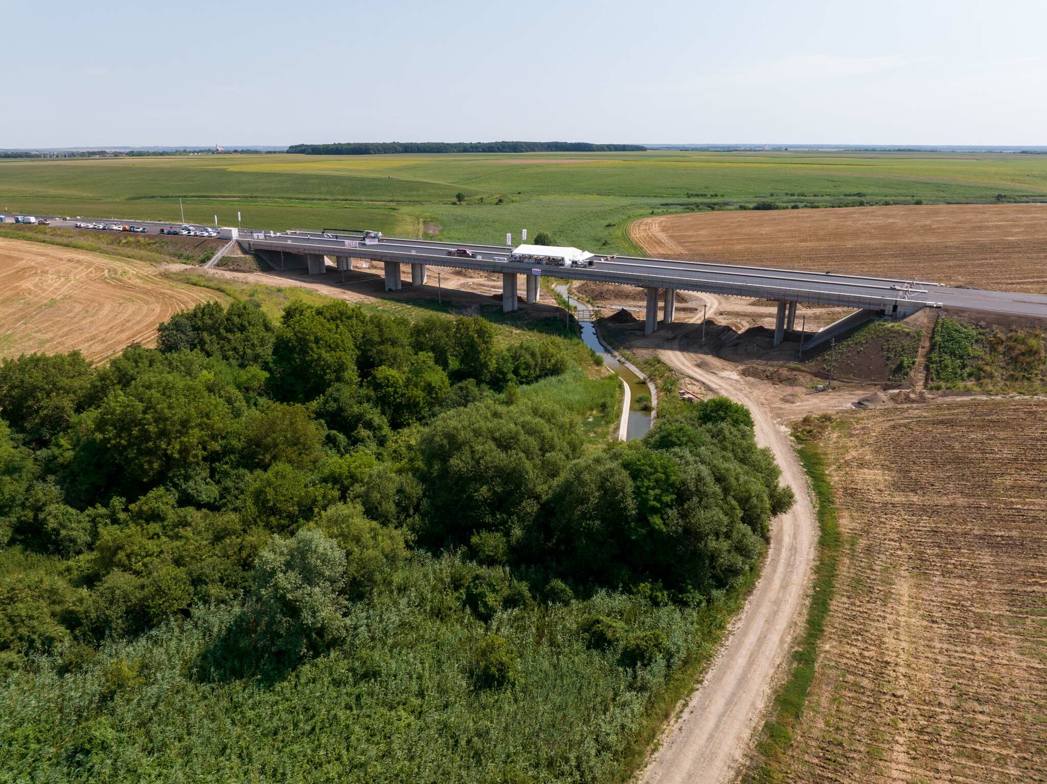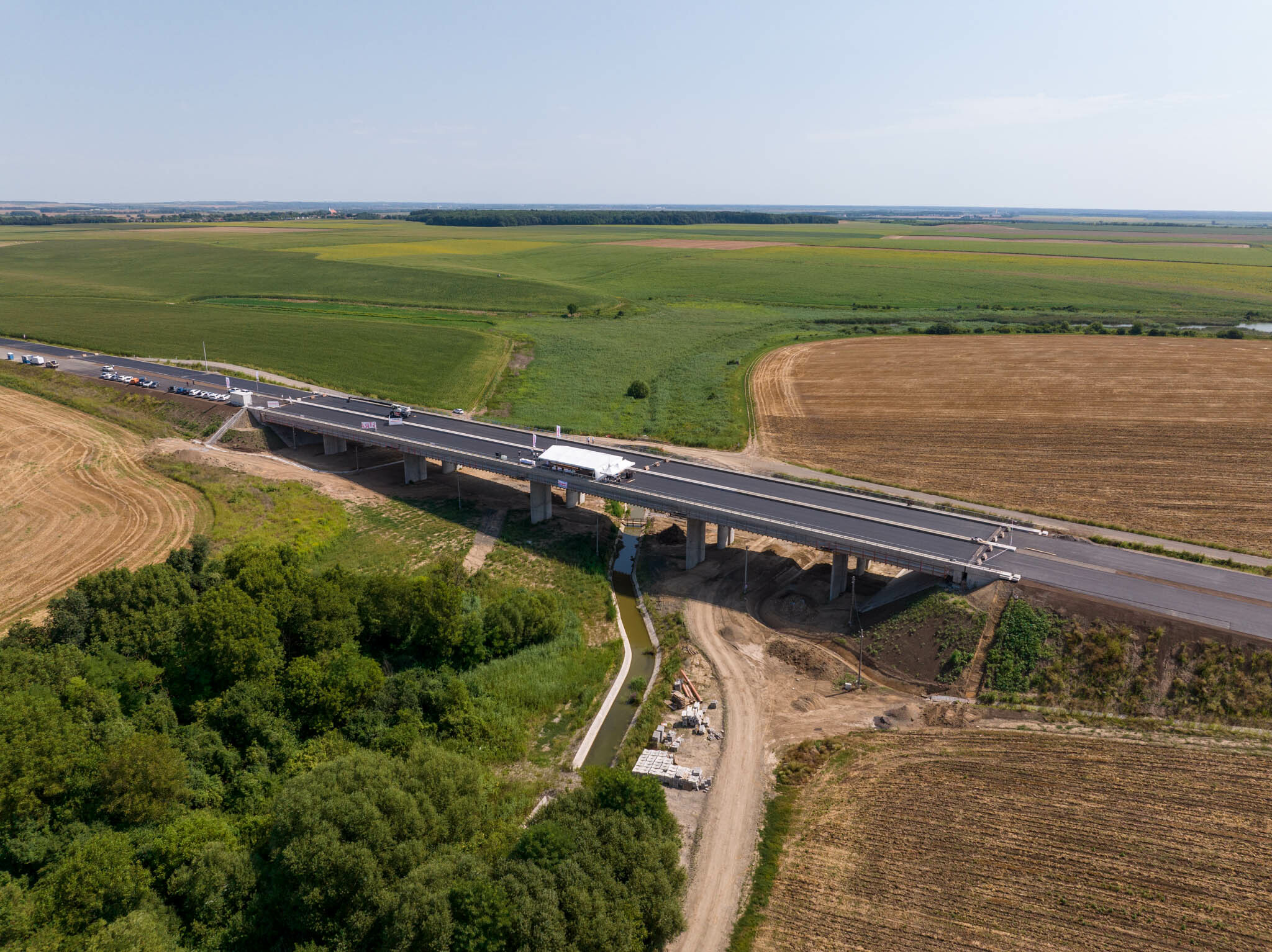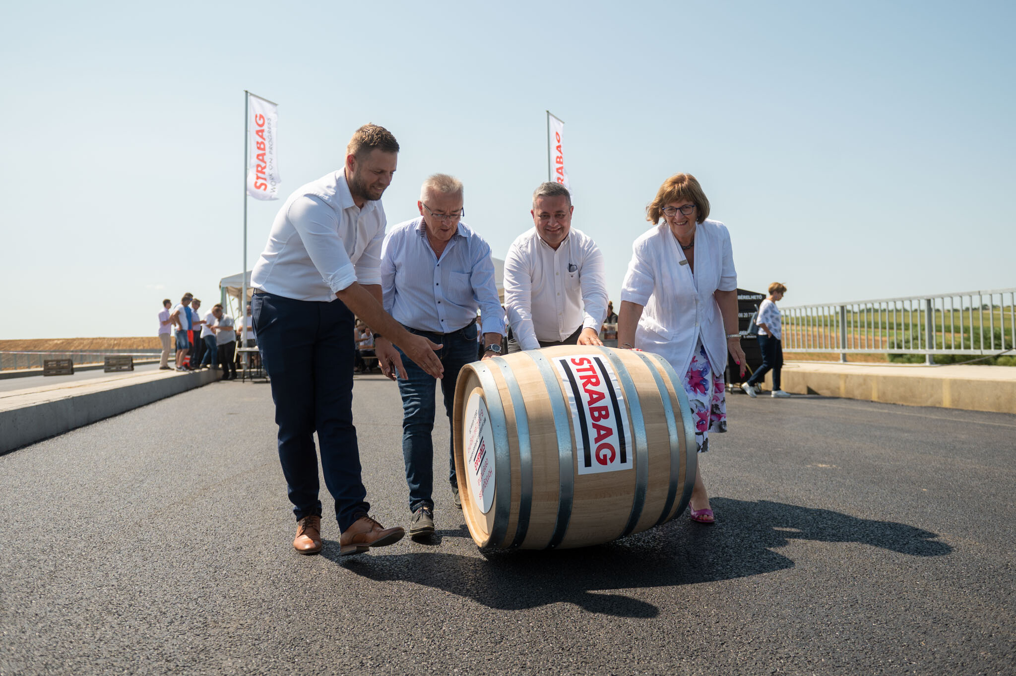 A Strabag Építő Kft. és a Duna Aszfalt Zrt. konzorciumának generálkivitelezésében megvalósuló fejlesztésben ezúttal egy hídépítés került a fókuszba: csütörtökön megtartották a Majsi-vízfolyás felett a Strabag által megépített hídon a hordógurítást.