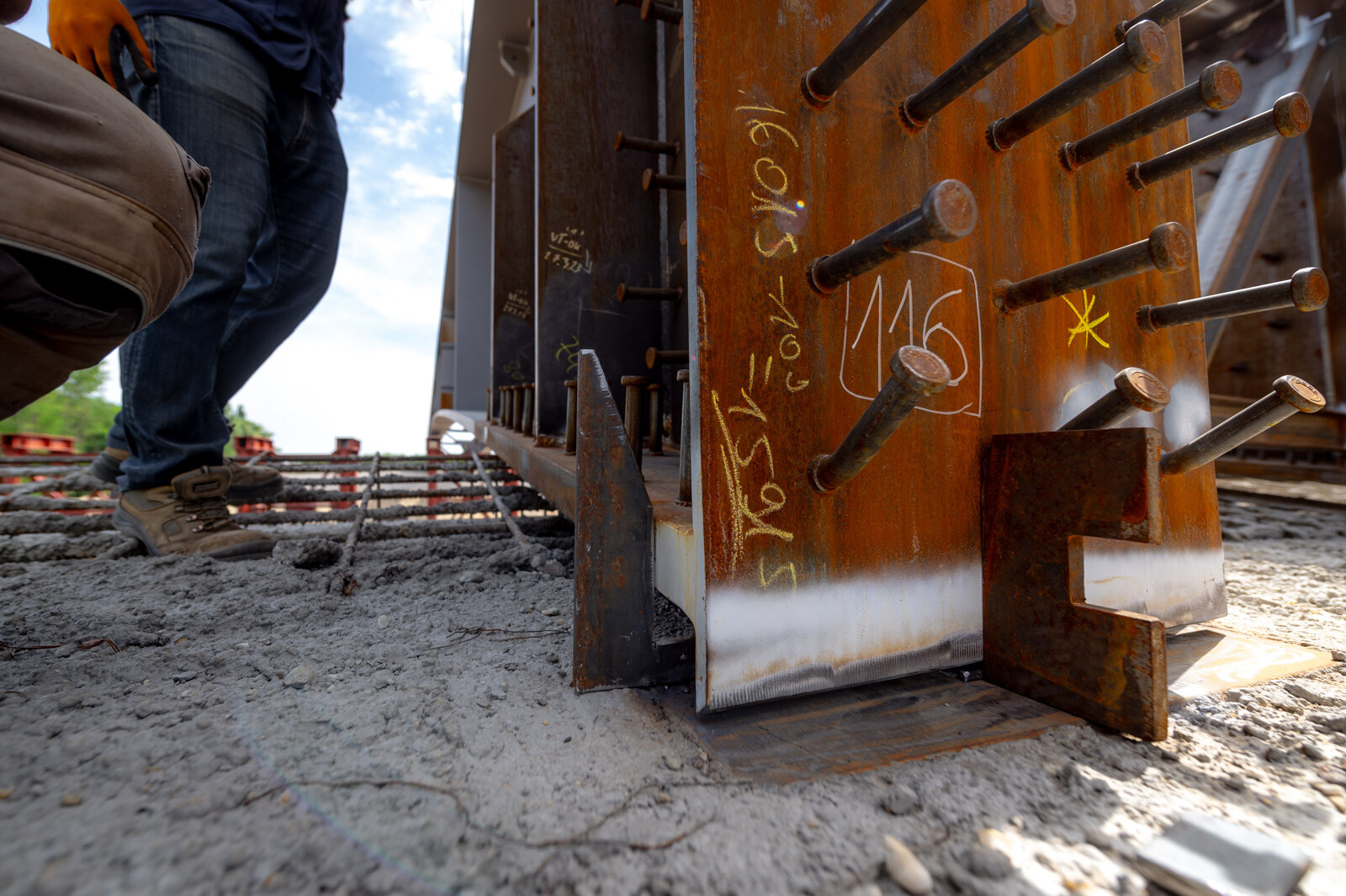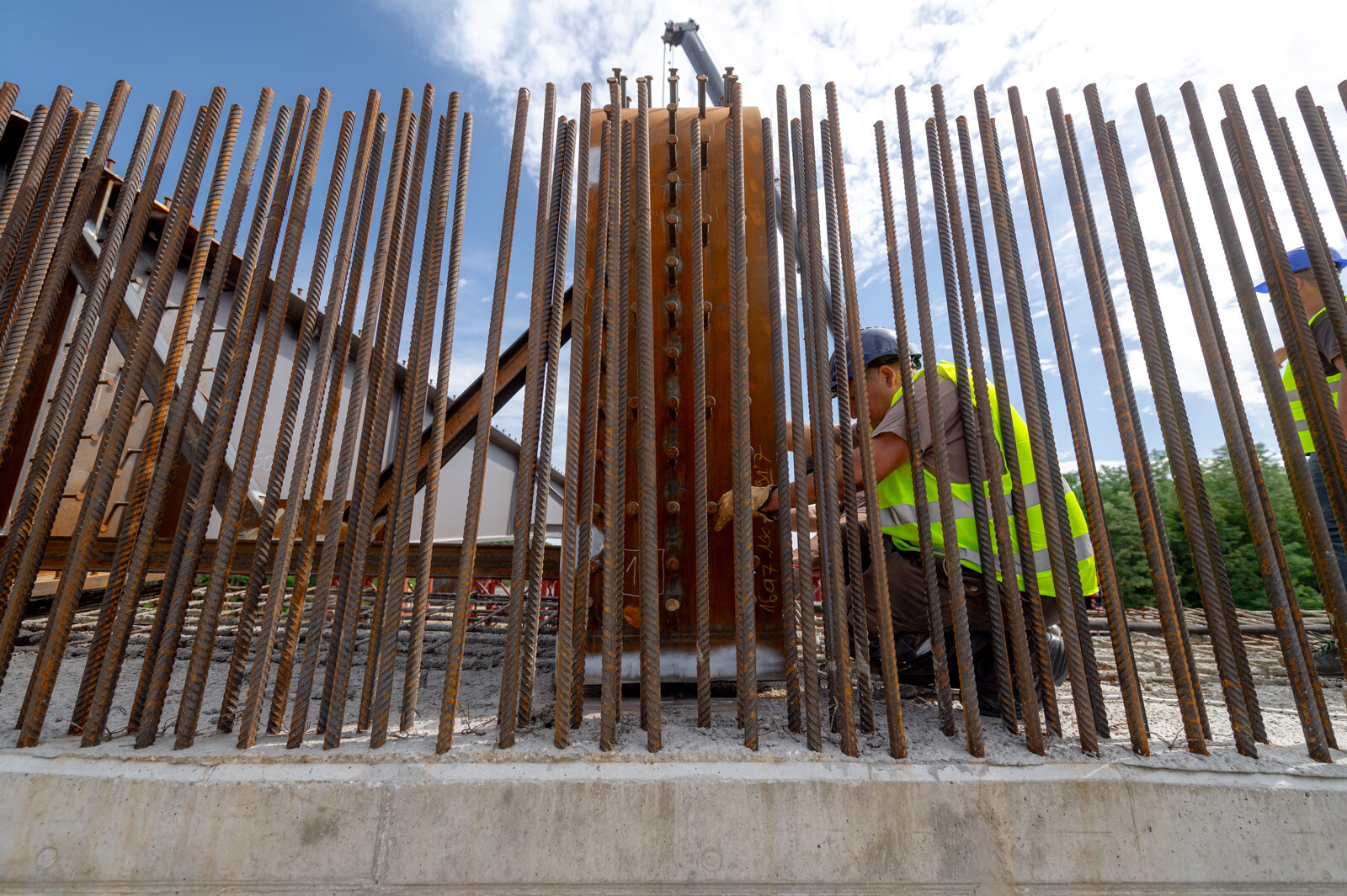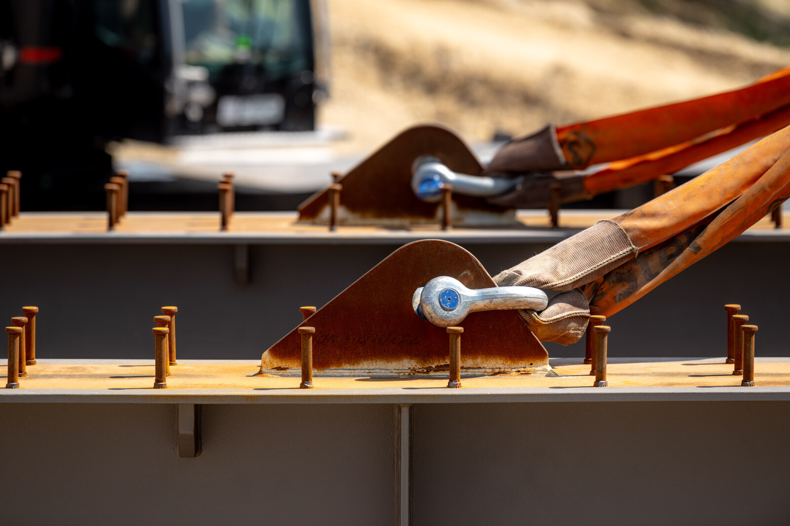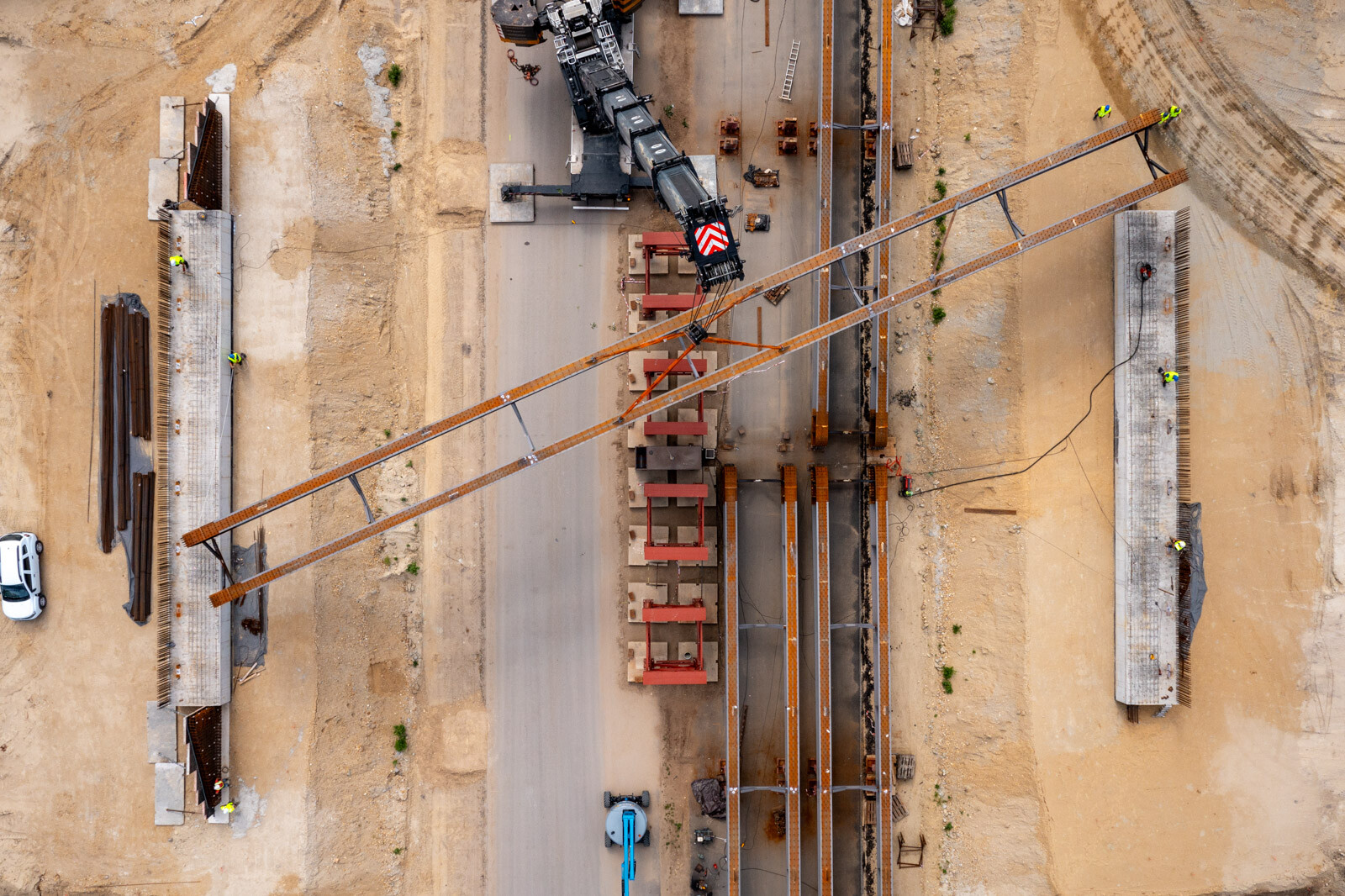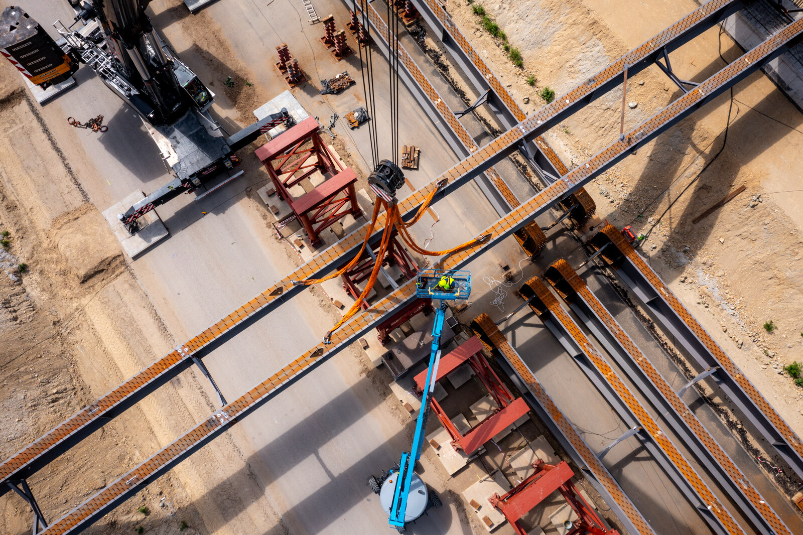 A 62 tonna tömeget meghaladó két főtartóból, keresztkötésekből és emelési szélrácsból álló, párban összeállított beemelési egységet 450 tonna kapacitású autódaru segítségével emelték fel végső helyére. Az autódaru 25 méteres emelési magasságban 16 méteres gémkinyúlással dolgozott az építési helyszínen.