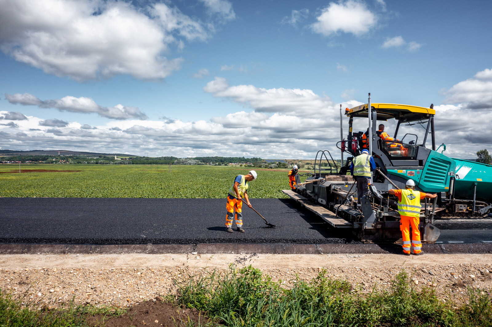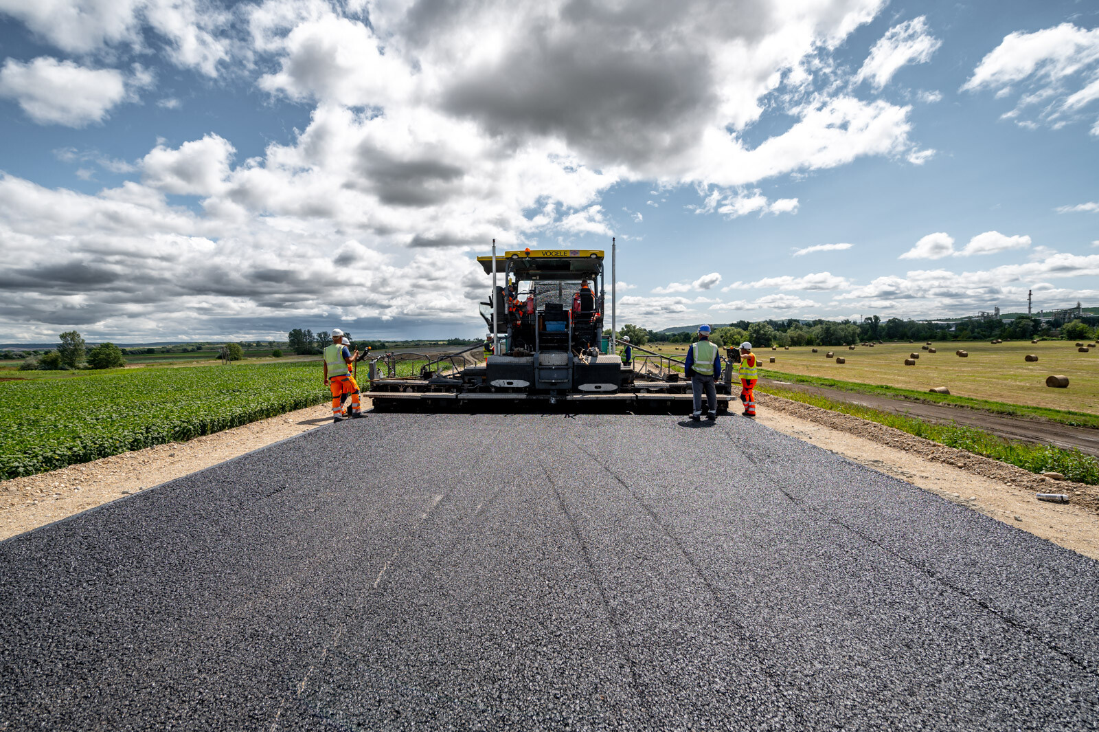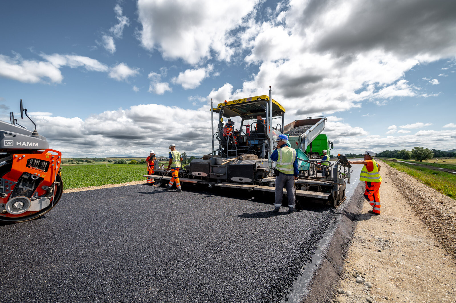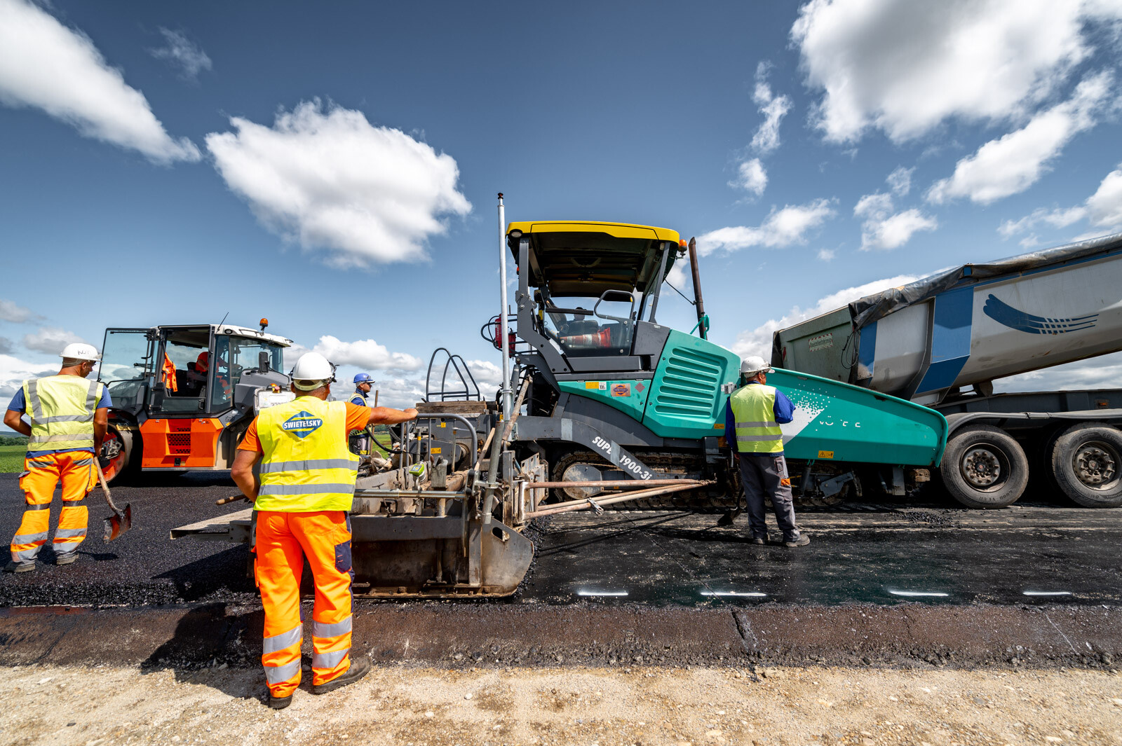 Stábunk megtekintette a kivitelezést, és látványos felvételeket készíthettünk az épülő körforgalomról. Ottjártunkkor az AC-22 aszfalt alapréteg beépítése történt 260-as elkerülő út főpályájának 20+600 és a 20+890 kilométerszelvények közötti szakaszán. A bedolgozást egy széles paddal felszerelt finisherrel végezték, mellyel a pálya teljes szélességében lehetséges az aszfaltrétegek terítése.