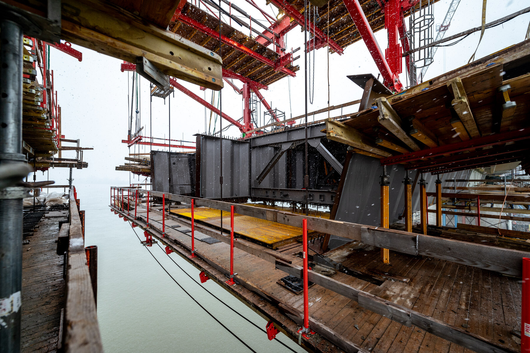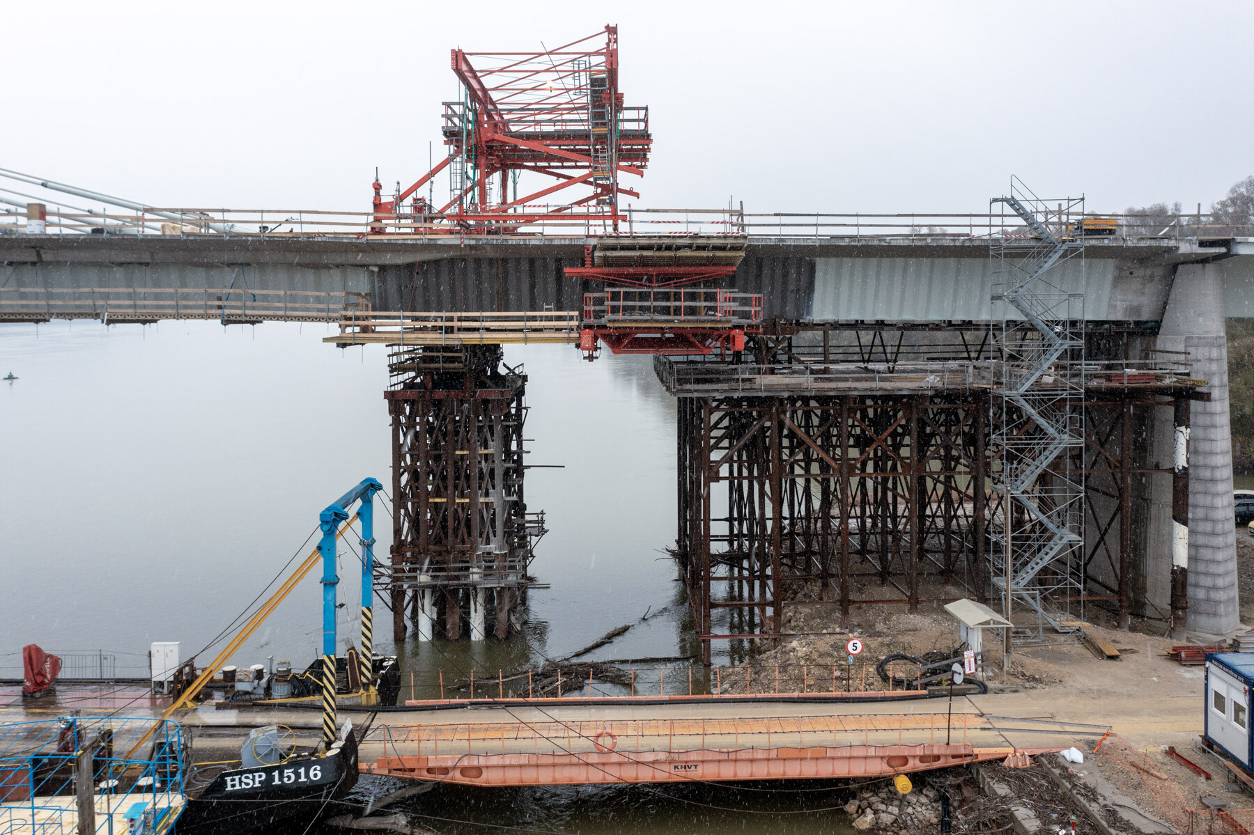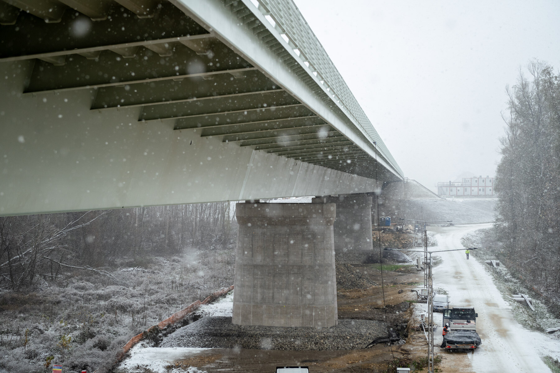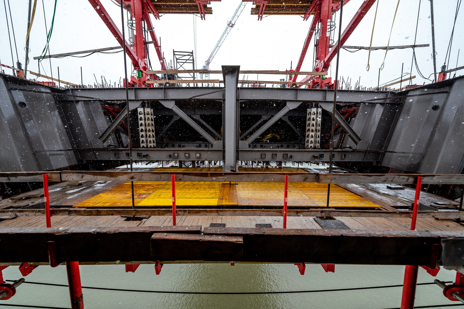 Helyszíni bejárásunk közben leszakadt a hó, de a megfelelő technológiai előkészületeknek köszönhetően ez nem jelentett megoldhatatlan akadályt a kivitelezők számára, zavartalanul folyt tovább a munka a jobb parti záró acél merevítőtartó beemelésével majd hegesztésével.