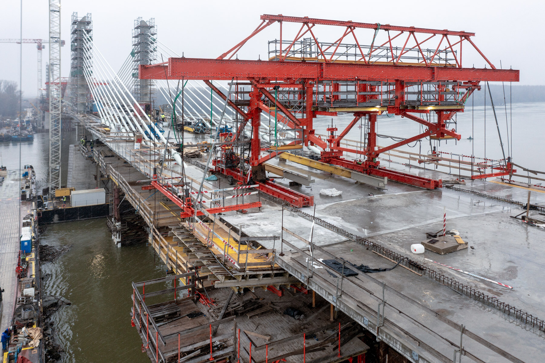 A kivitelezők december 5-én bebetonozták a KP19-es jelzésű kalocsai parti zárózöm (vagyis szerkezeti egység – a szerk.) pályalemezét. Ennek köszönhetően december 6-án a kalocsai oldalról az 1-es jelű hídfőtől, a bal ártéri hídszerkezeten keresztül már egészen a Duna medrének közepéig el lehetett gyalog jutni.