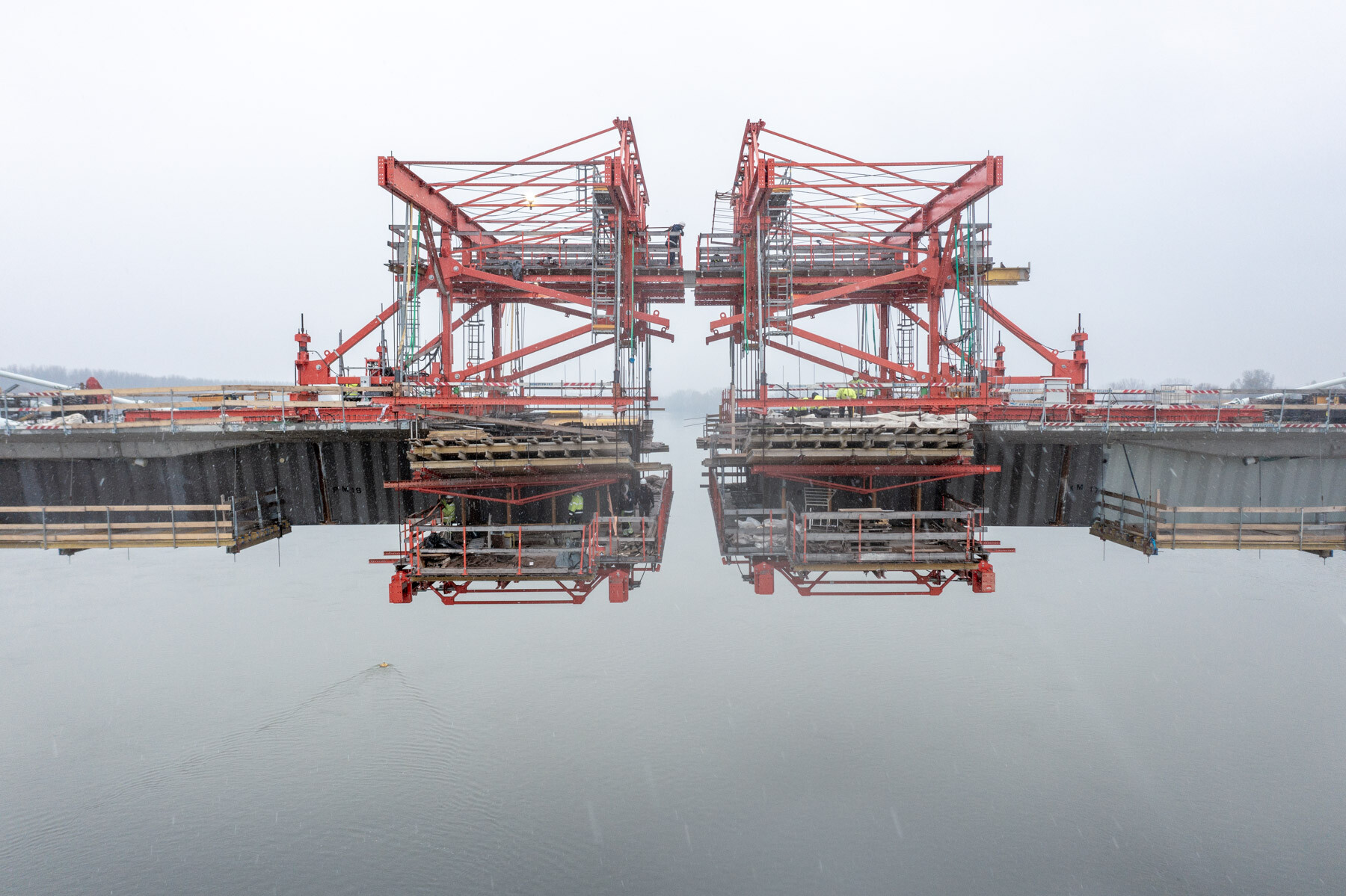 A 440 méter hosszú mederhíd építkezése december 6-án látványos pillanathoz ért: a szakemberek munkájának köszönhetően véglegesen összekapcsolták a kalocsai parti oldali szakaszát. Ennek a munkának az utolsó mozzanatáról közlünk most helyszíni galériát – a részletekről pedig a Duna Aszfalt projektvezetése tájékoztatta lapunkat.