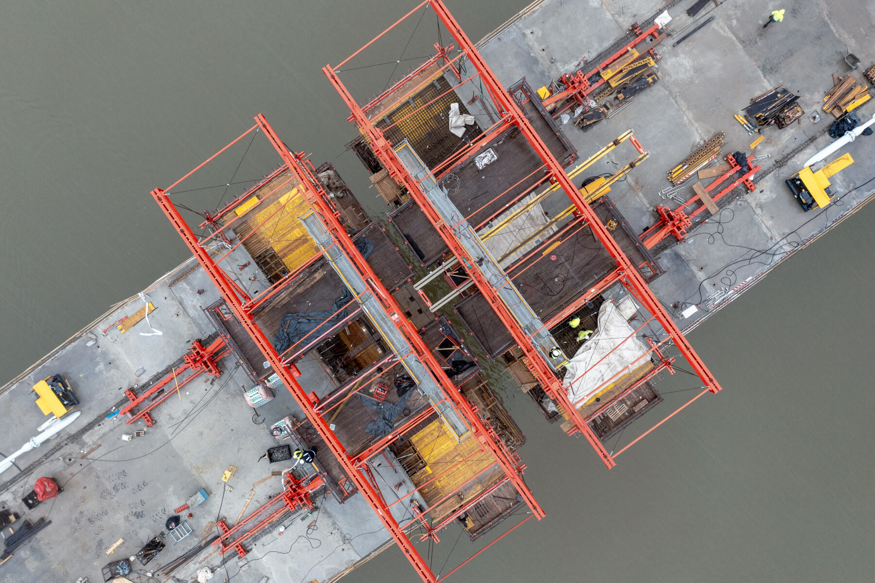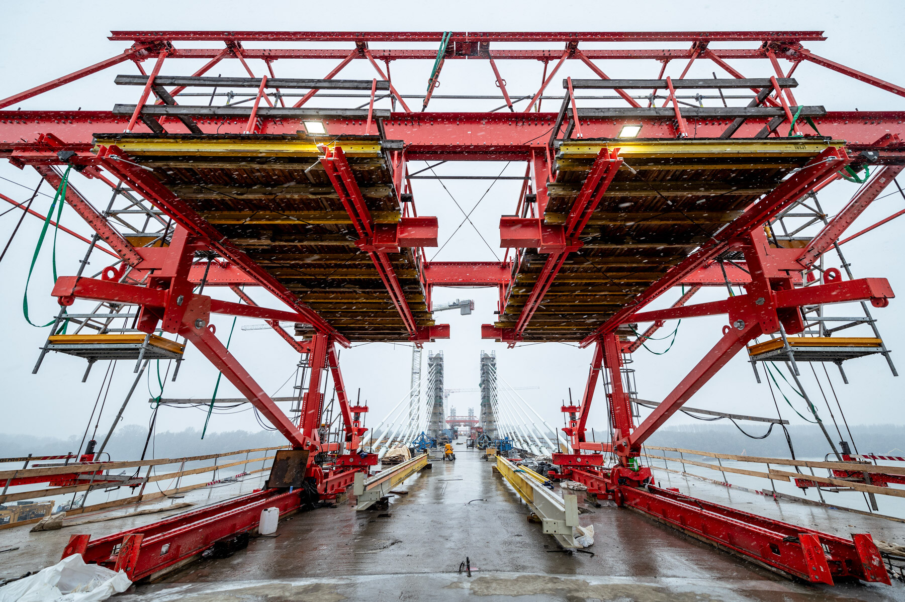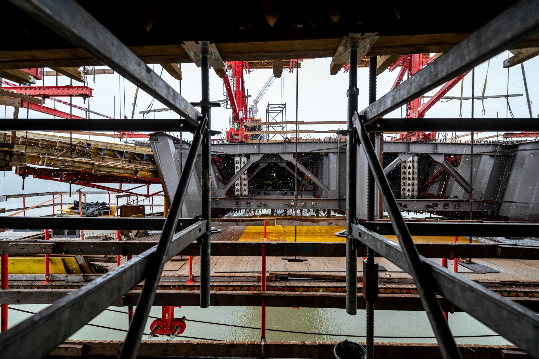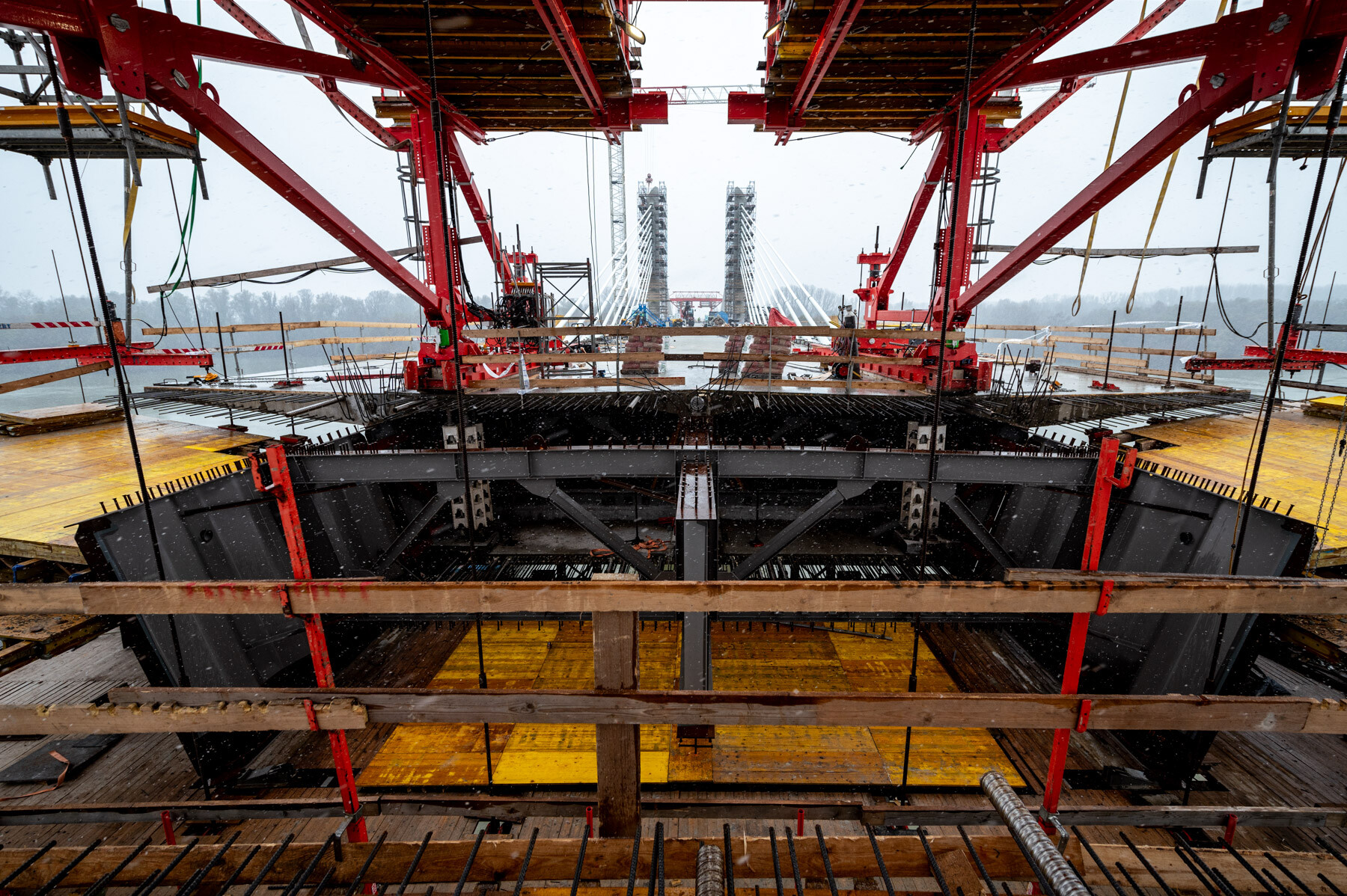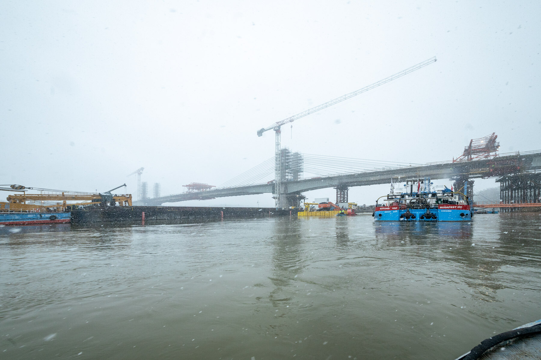 A szakemberek a középső mederzárást is előkészítették, ami várhatóan 2024 februárjában fog megvalósulni. Ennek a mederzárásnak az első mozzanata az MM20-as jelű acél merevítőtartó részeinek beemelése és hegesztése lesz, majd pedig a fenéklemez és pályalemez betonozása zárja le ezt munkafolyamatot, ami lehetővé teszi, hogy át lehessen kelni a teljes hídon a Duna egyik partjáról a másikra.