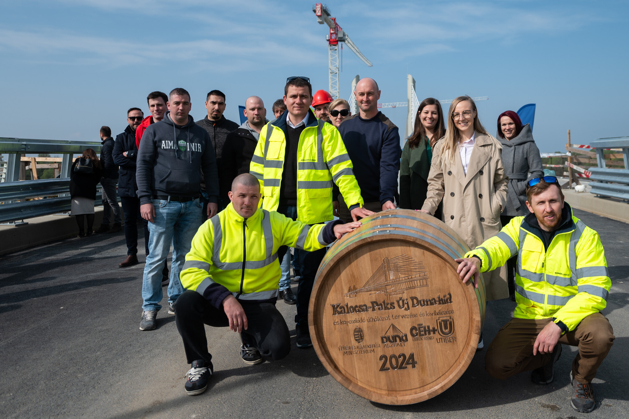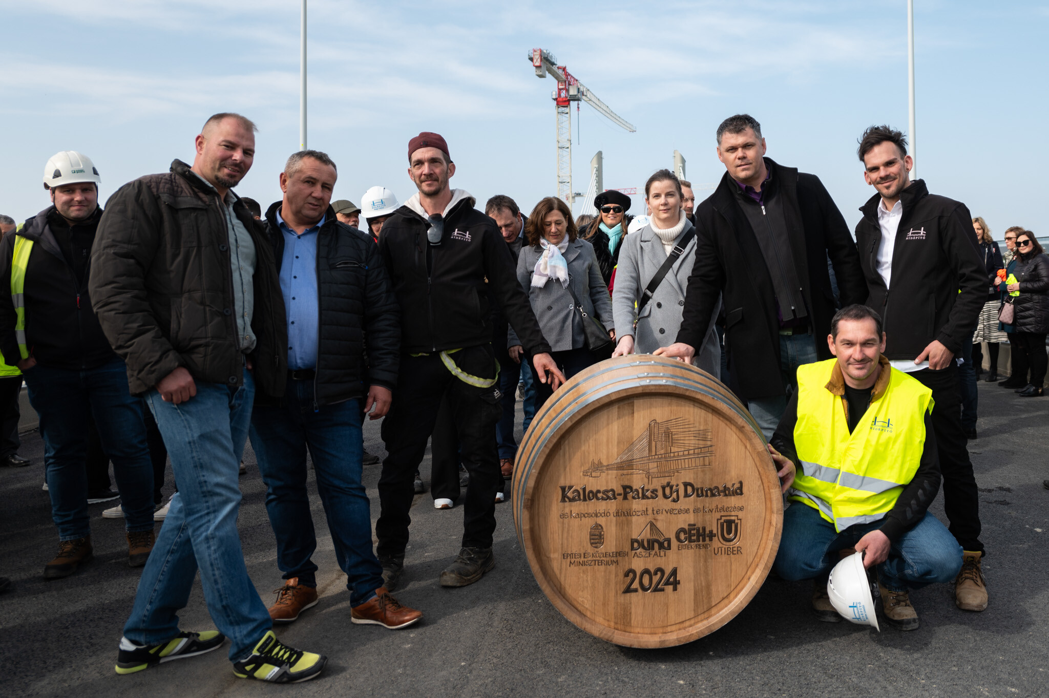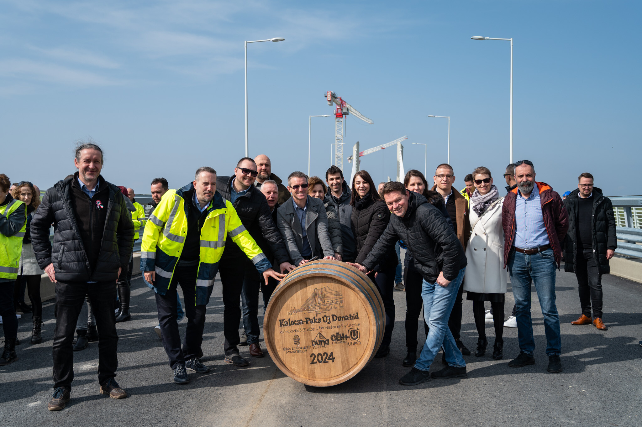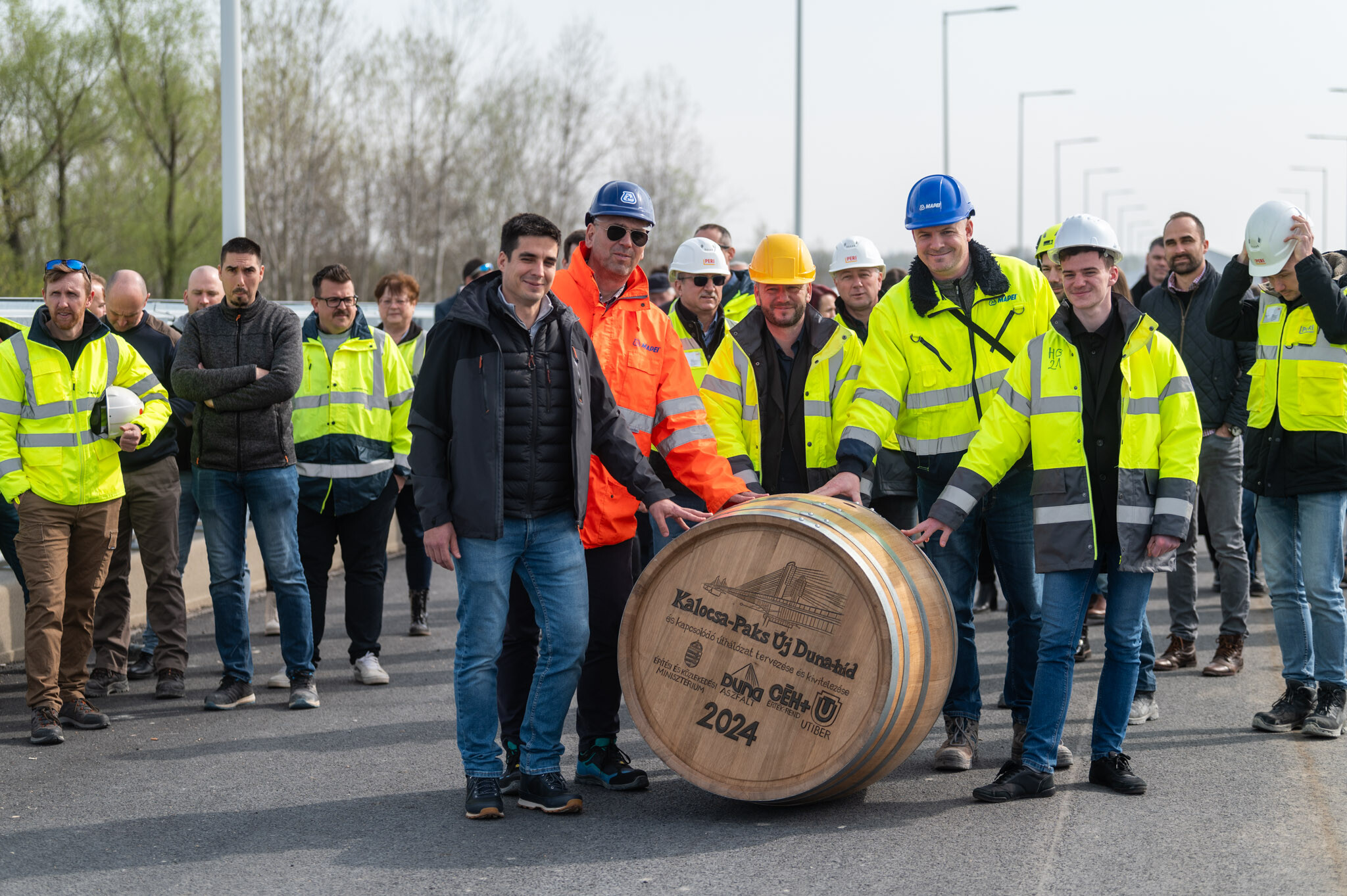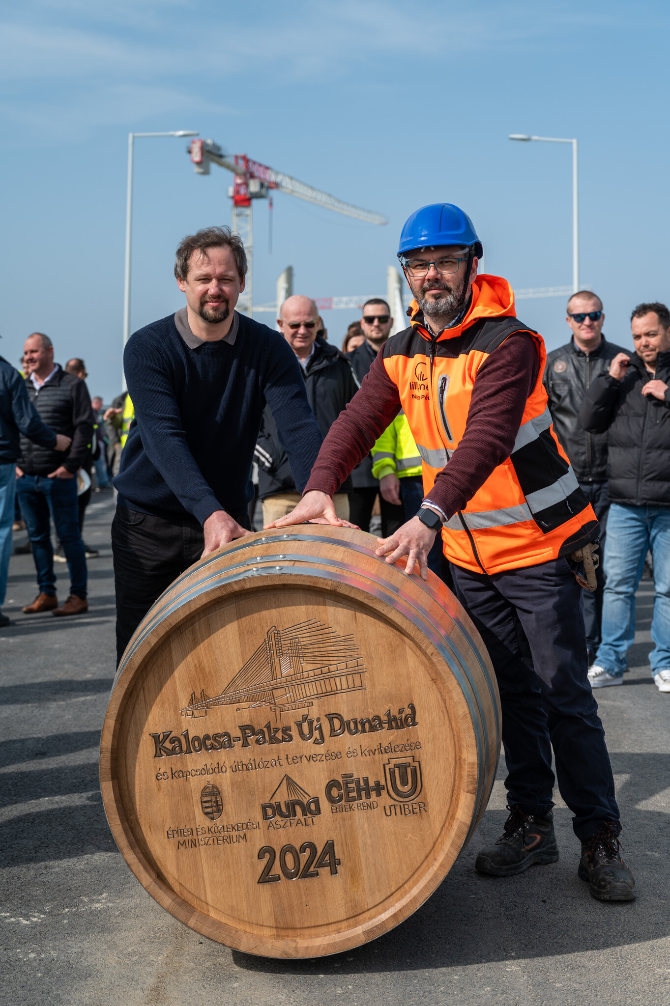 Foktő térségében március 14-én megtartották a Duna Aszfalt Zrt. kivitelezésében épülő Kalocsa-Paks Duna-híd hordógurítását. Az építőipari hagyományokat követő eseményre azt követően kerülhetett sor, hogy idén januárban a közel 1 kilométeres építményen teljessé vált a pályalemez. Ahogy azt az akkor beszámolónkban is jeleztük, ezt az tette lehetővé, hogy a balparti ártéri híd, majd a jobbparti ártéri híd szerkezetének betolását követően január 26-án a középső elemet képező mederhíd is bezárult.