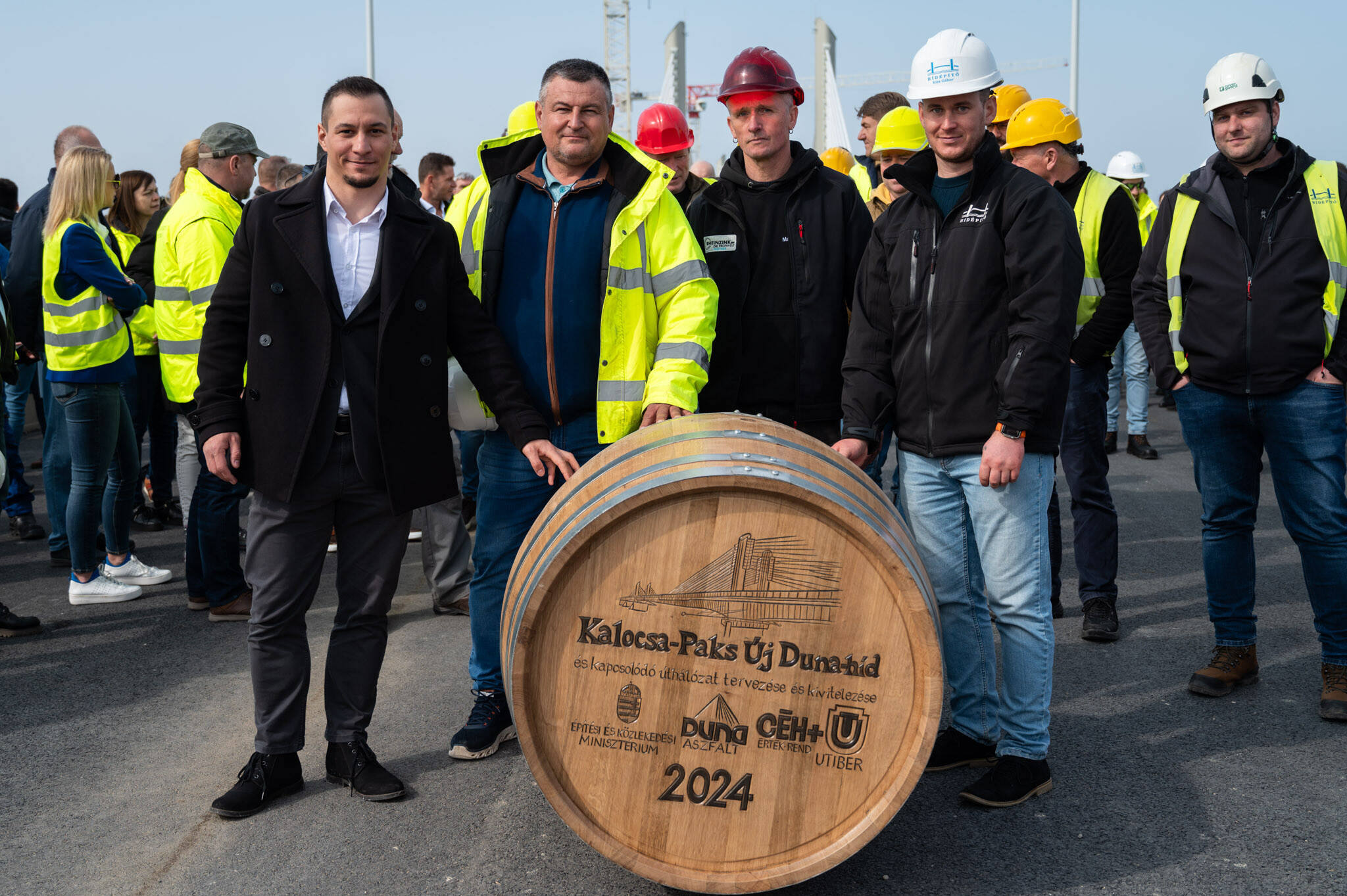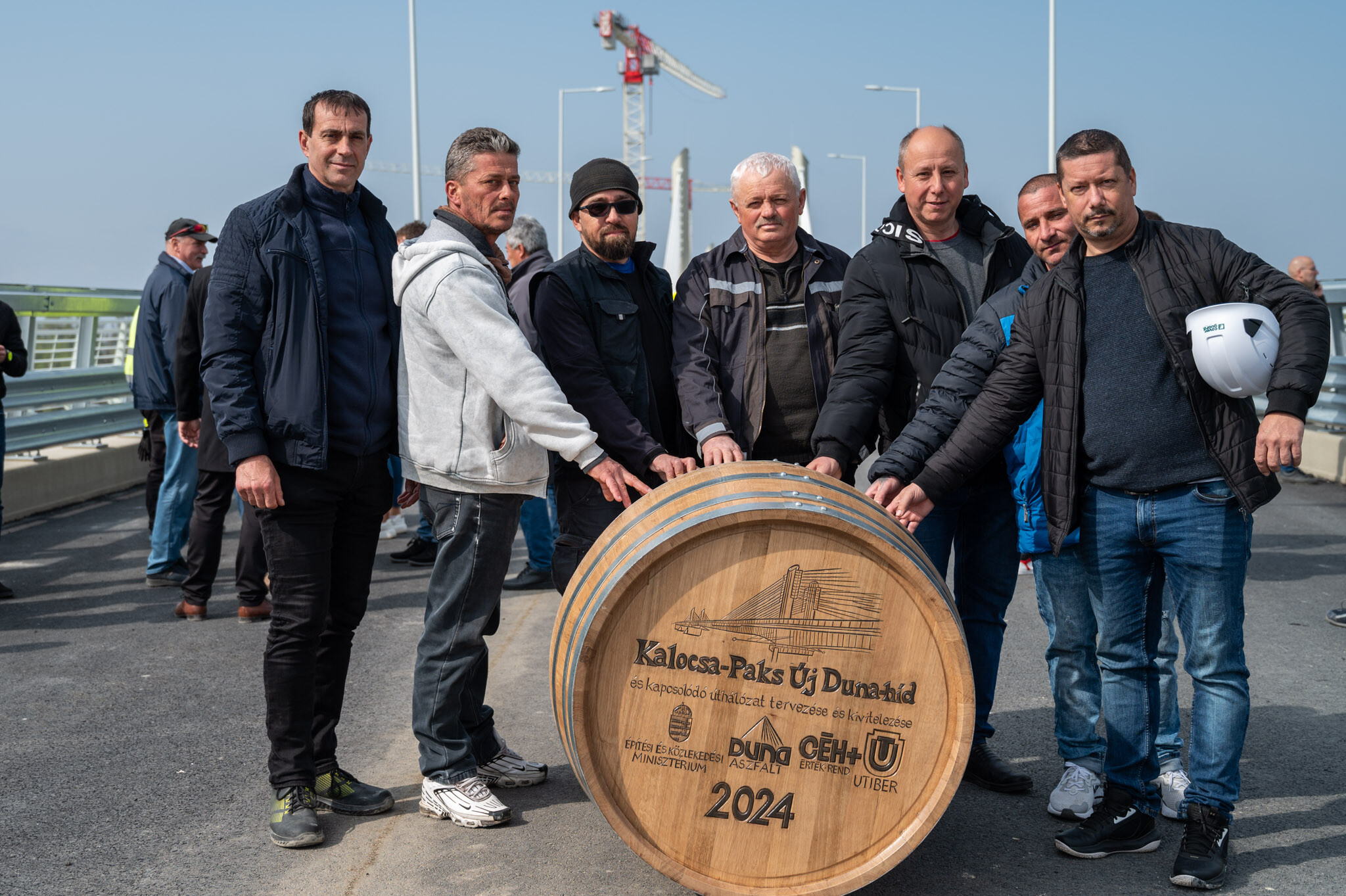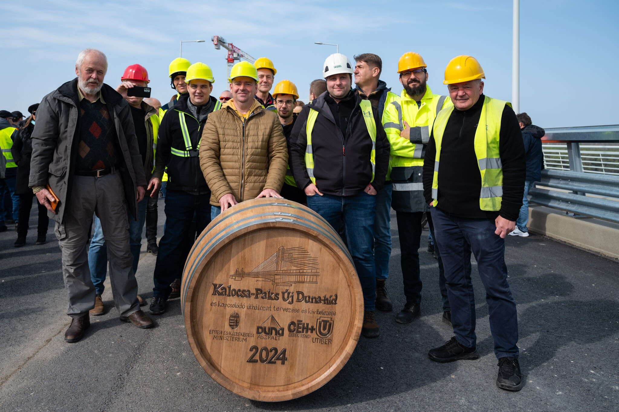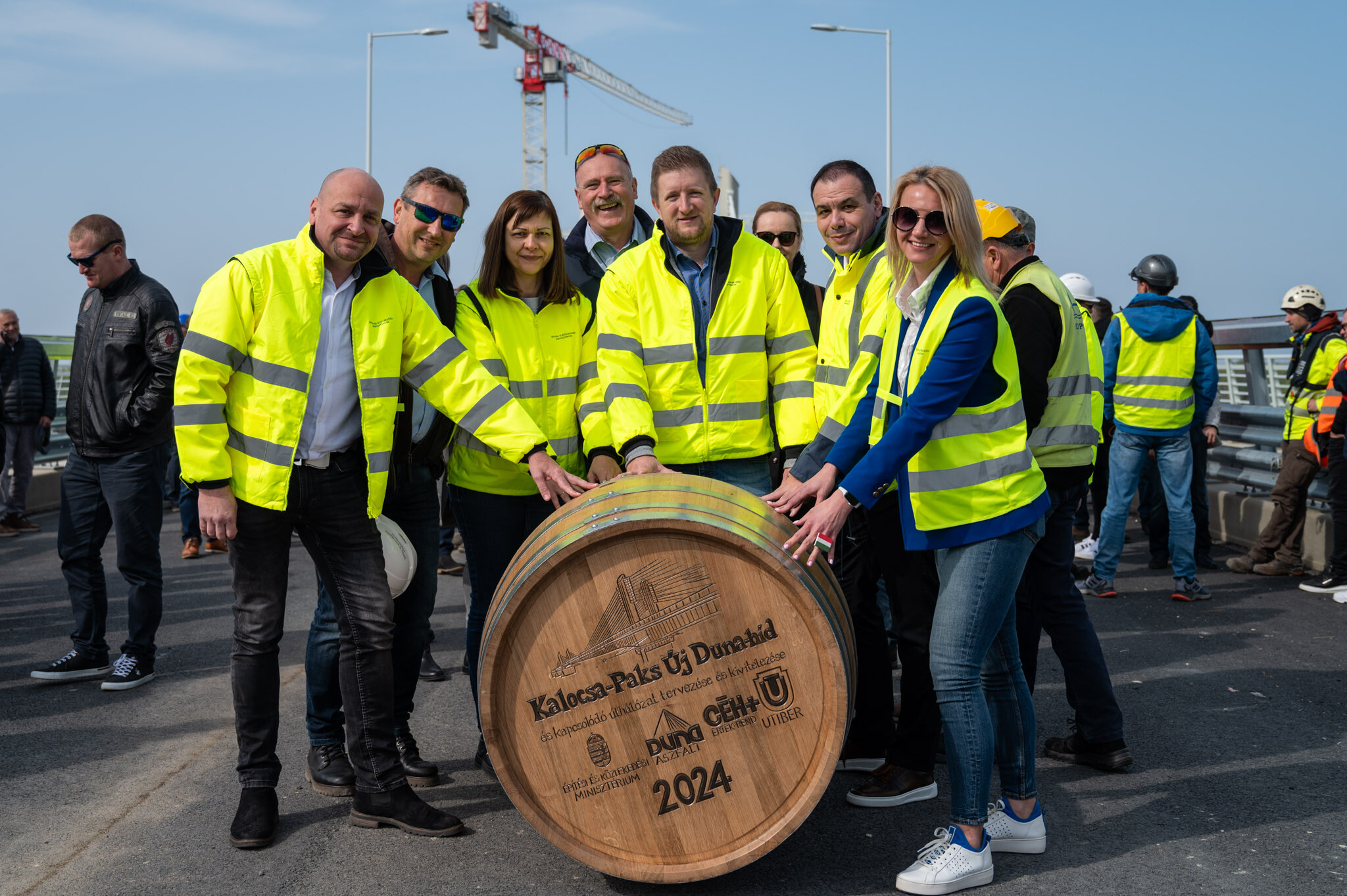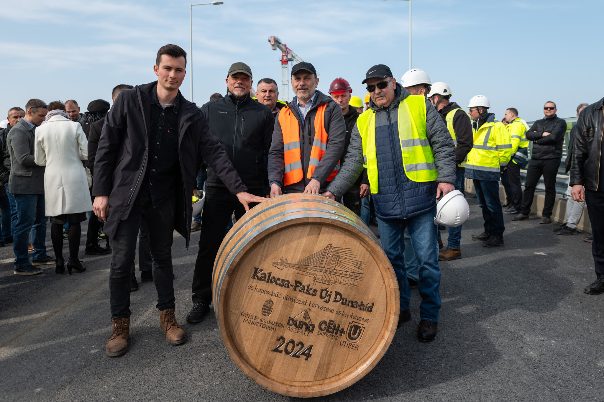 Foktő térségében március 14-én megtartották a Duna Aszfalt Zrt. kivitelezésében épülő Kalocsa-Paks Duna-híd hordógurítását. Az építőipari hagyományokat követő eseményre azt követően kerülhetett sor, hogy idén januárban a közel 1 kilométeres építményen teljessé vált a pályalemez. Ahogy azt az akkor beszámolónkban is jeleztük, ezt az tette lehetővé, hogy a balparti ártéri híd, majd a jobbparti ártéri híd szerkezetének betolását követően január 26-án a középső elemet képező mederhíd is bezárult.
