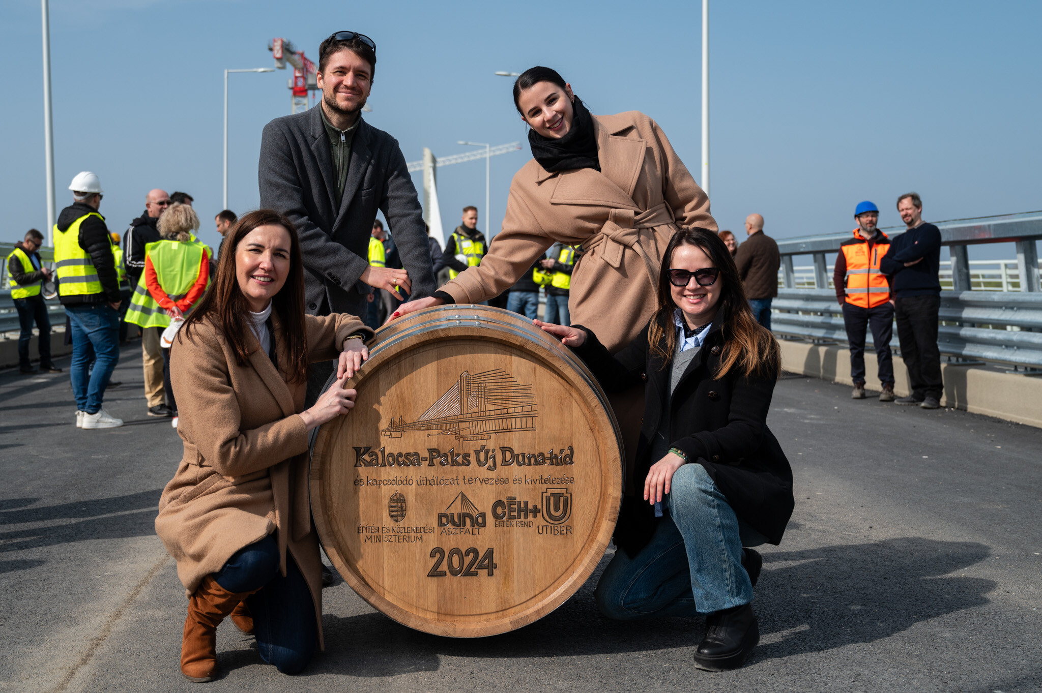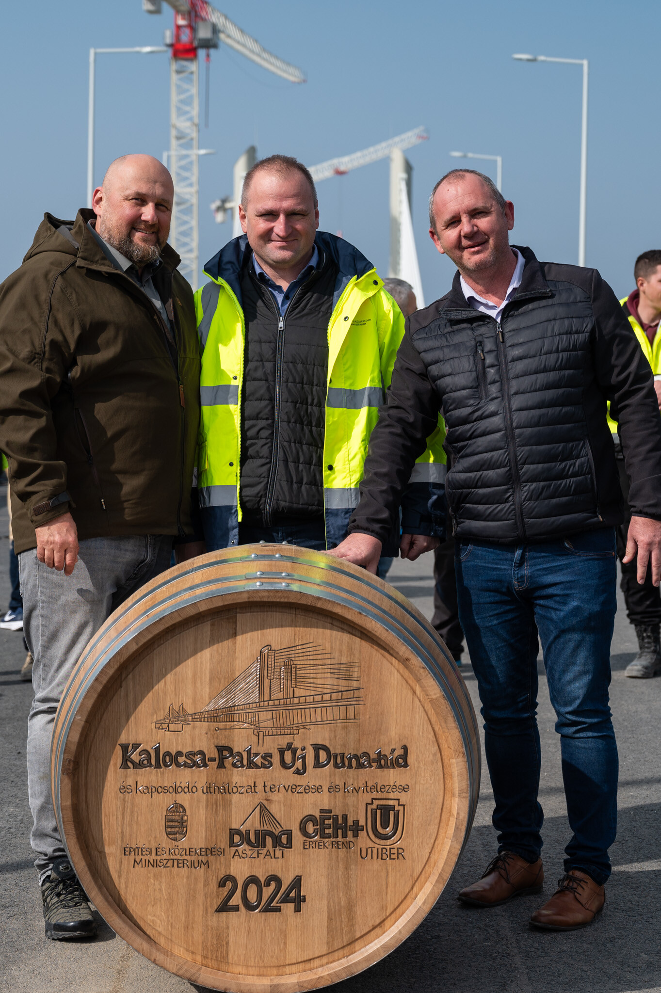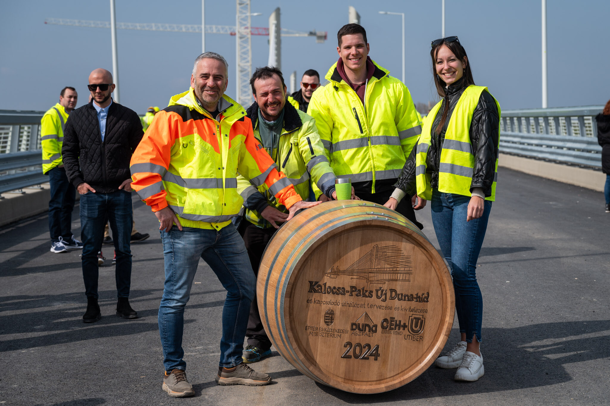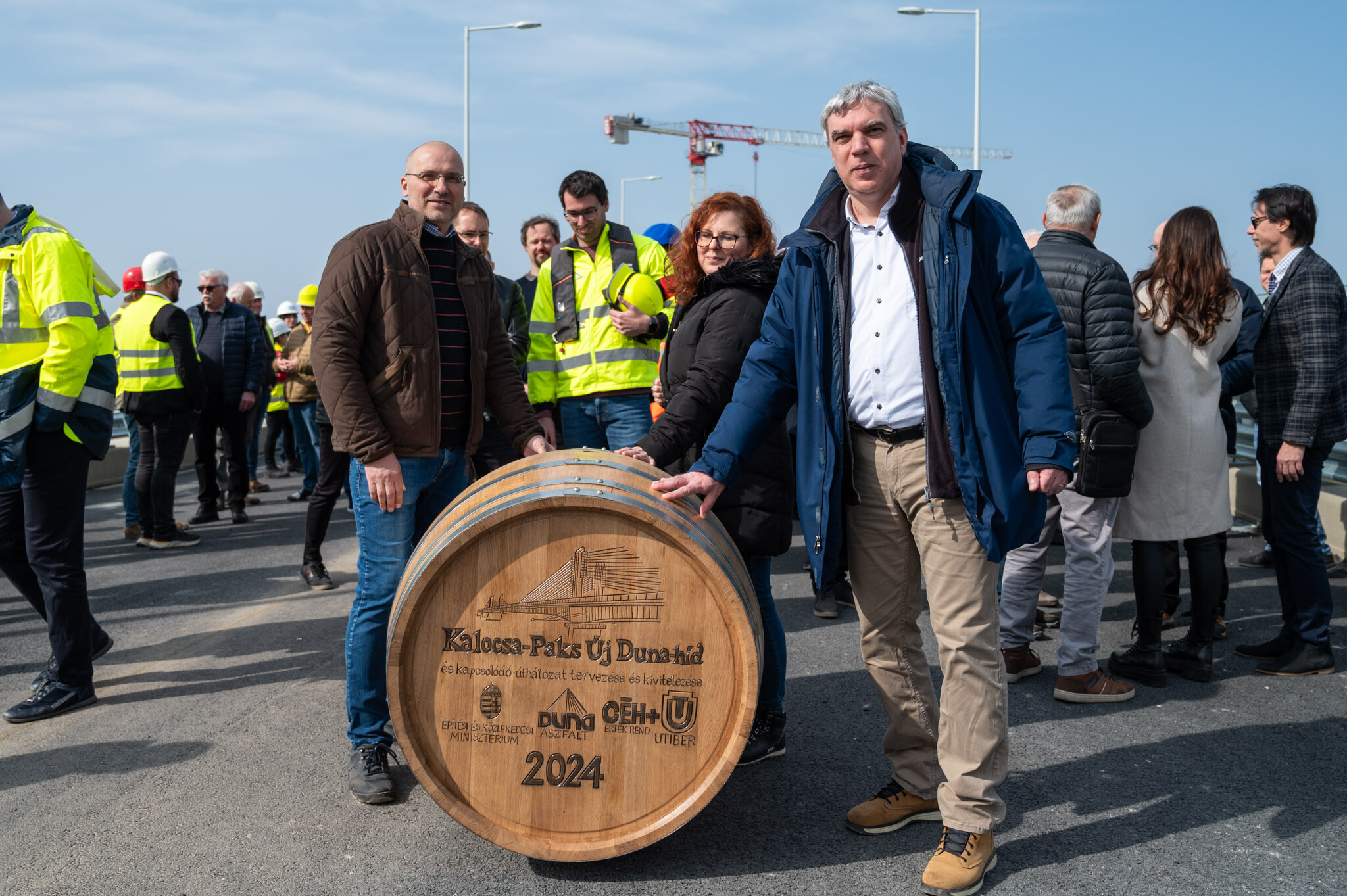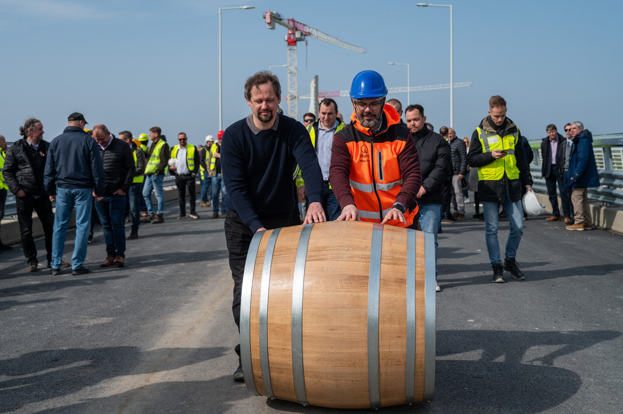 Foktő térségében március 14-én megtartották a Duna Aszfalt Zrt. kivitelezésében épülő Kalocsa-Paks Duna-híd hordógurítását. Az építőipari hagyományokat követő eseményre azt követően kerülhetett sor, hogy idén januárban a közel 1 kilométeres építményen teljessé vált a pályalemez. Ahogy azt az akkor beszámolónkban is jeleztük, ezt az tette lehetővé, hogy a balparti ártéri híd, majd a jobbparti ártéri híd szerkezetének betolását követően január 26-án a középső elemet képező mederhíd is bezárult.