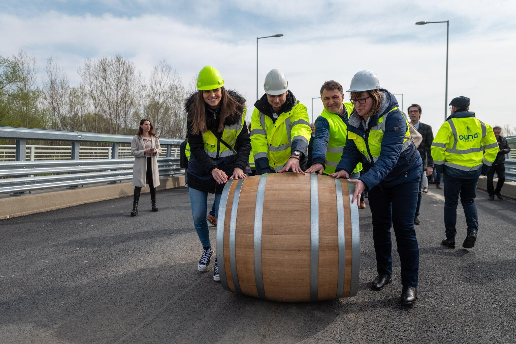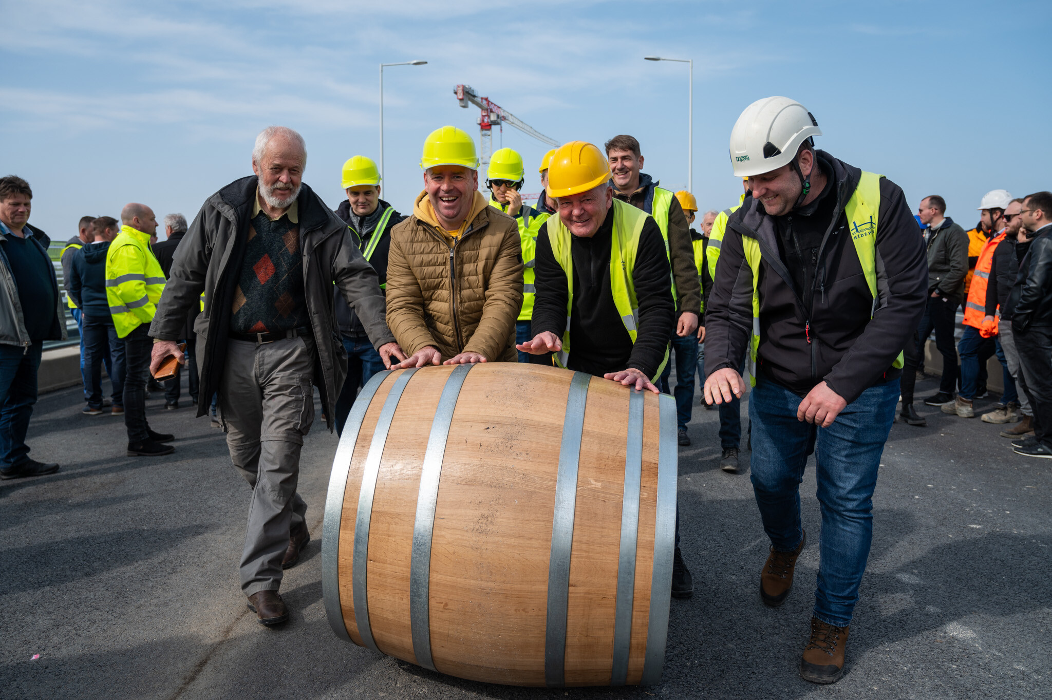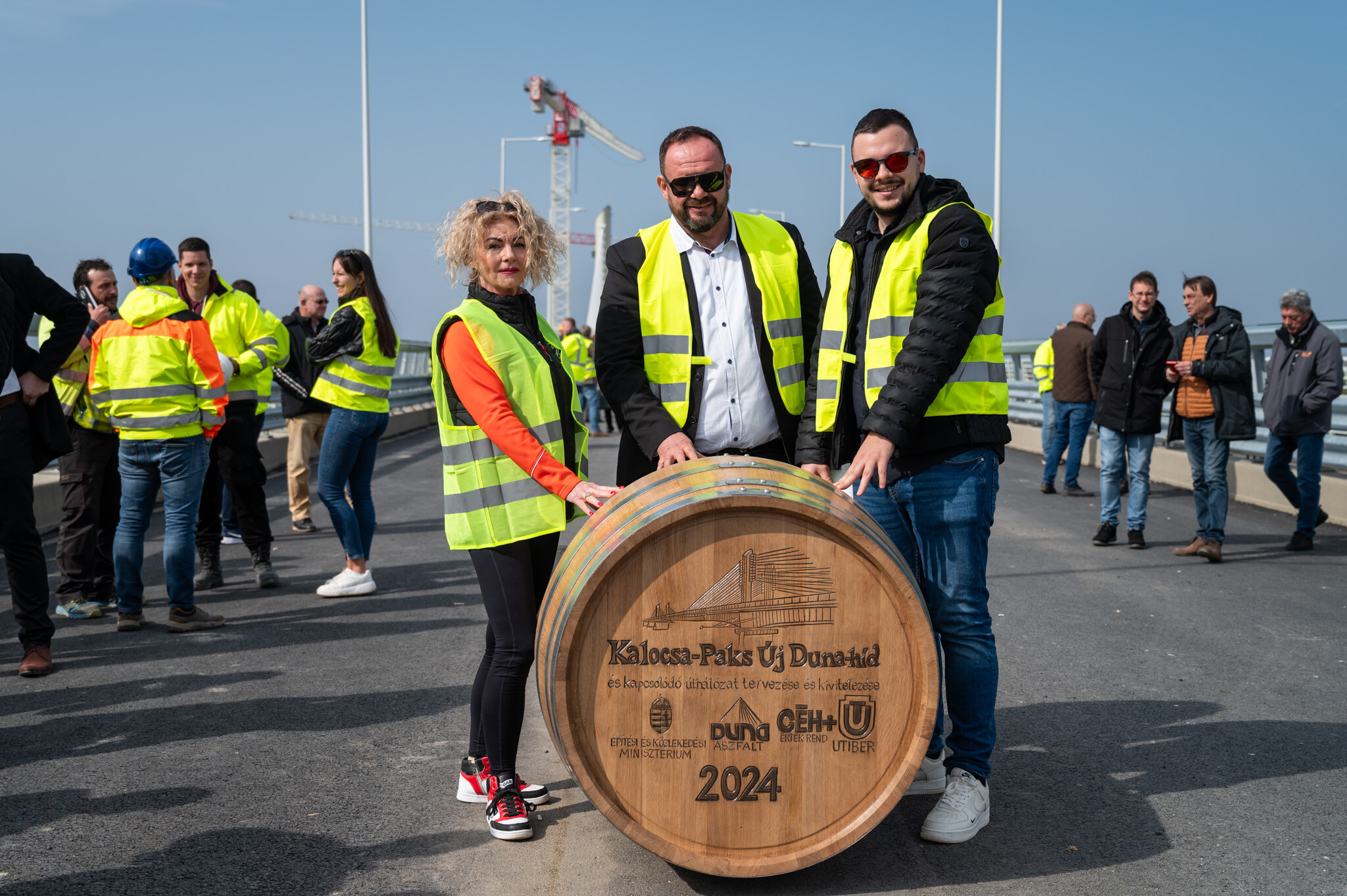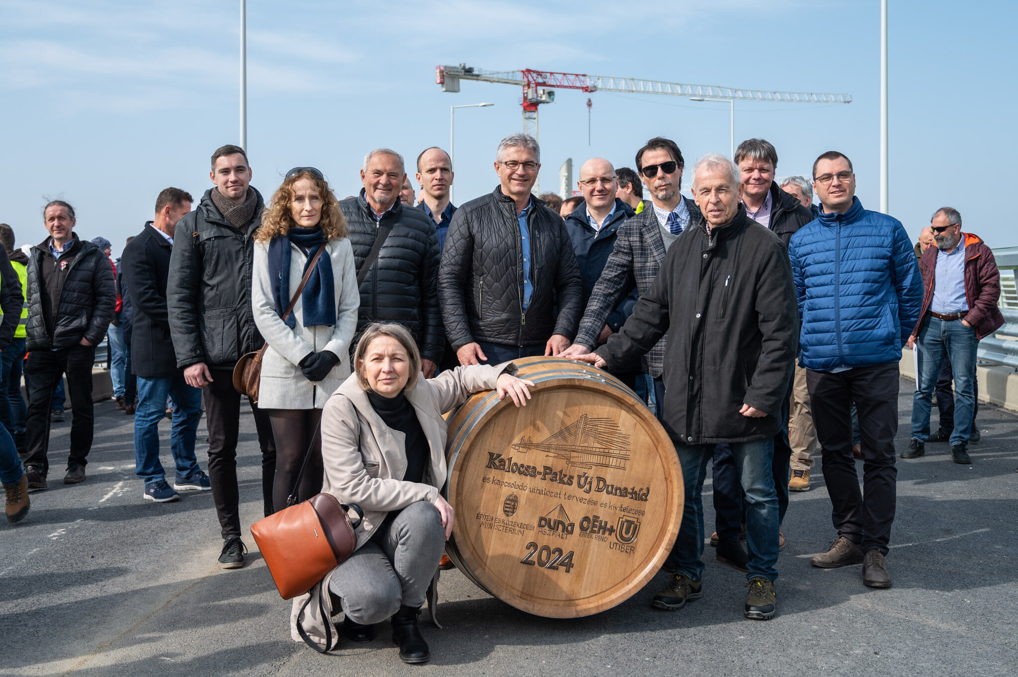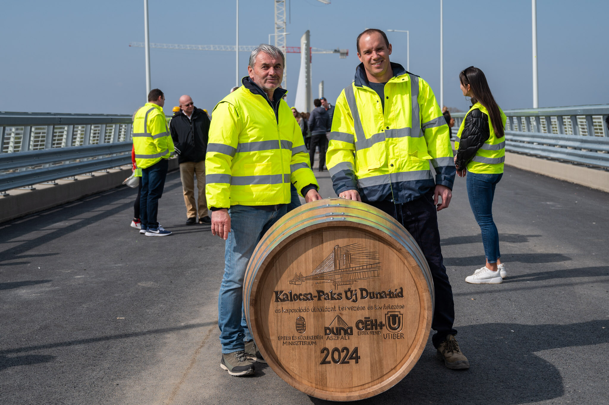 Foktő térségében március 14-én megtartották a Duna Aszfalt Zrt. kivitelezésében épülő Kalocsa-Paks Duna-híd hordógurítását. Az építőipari hagyományokat követő eseményre azt követően kerülhetett sor, hogy idén januárban a közel 1 kilométeres építményen teljessé vált a pályalemez. Ahogy azt az akkor beszámolónkban is jeleztük, ezt az tette lehetővé, hogy a balparti ártéri híd, majd a jobbparti ártéri híd szerkezetének betolását követően január 26-án a középső elemet képező mederhíd is bezárult.