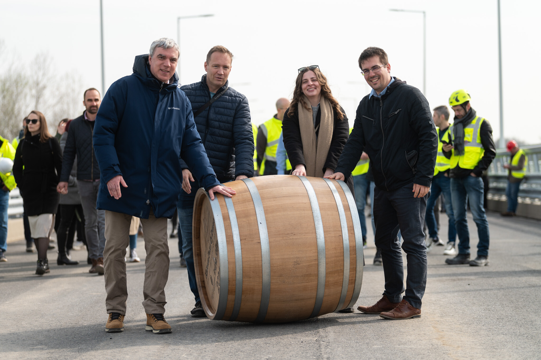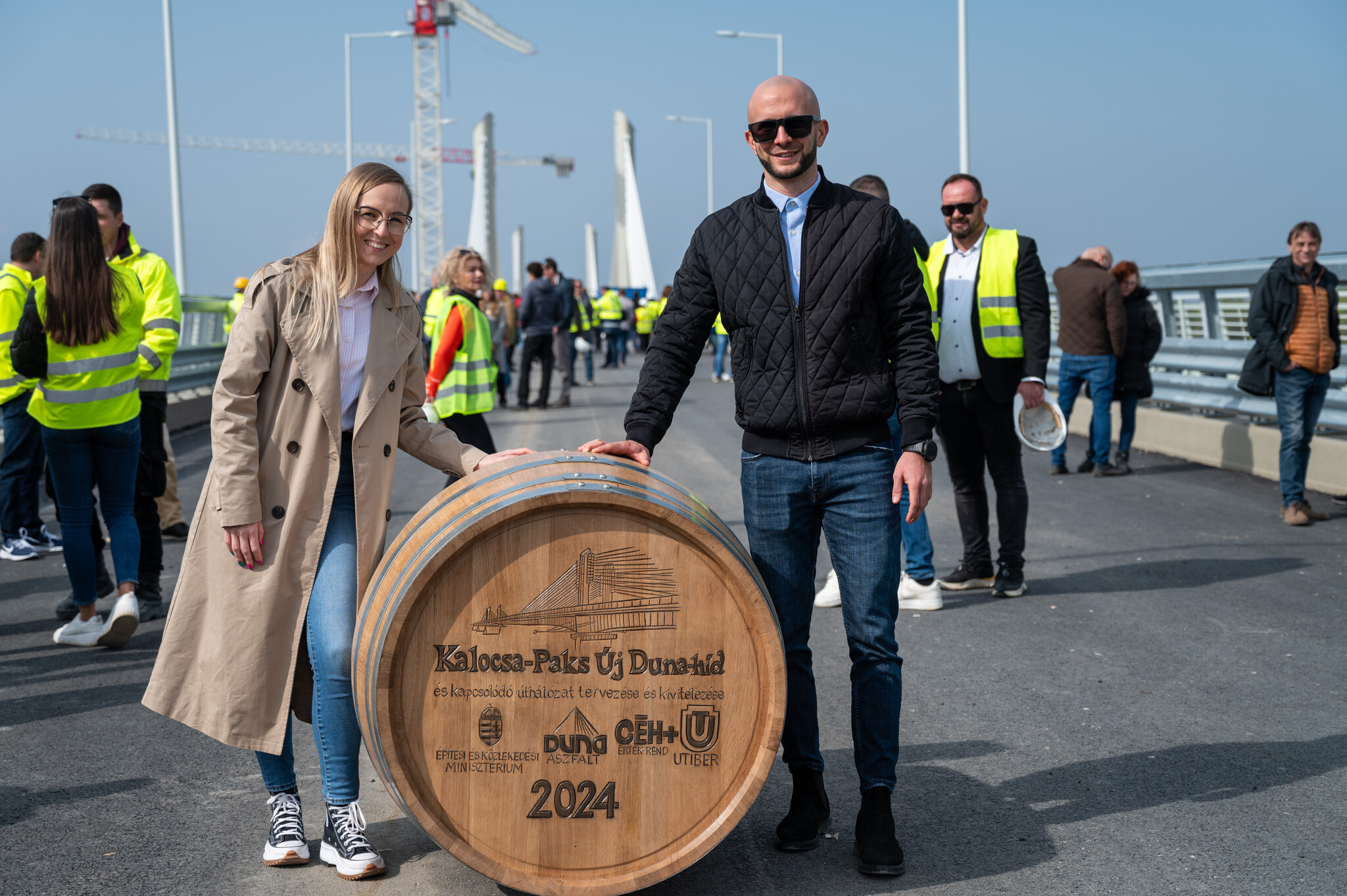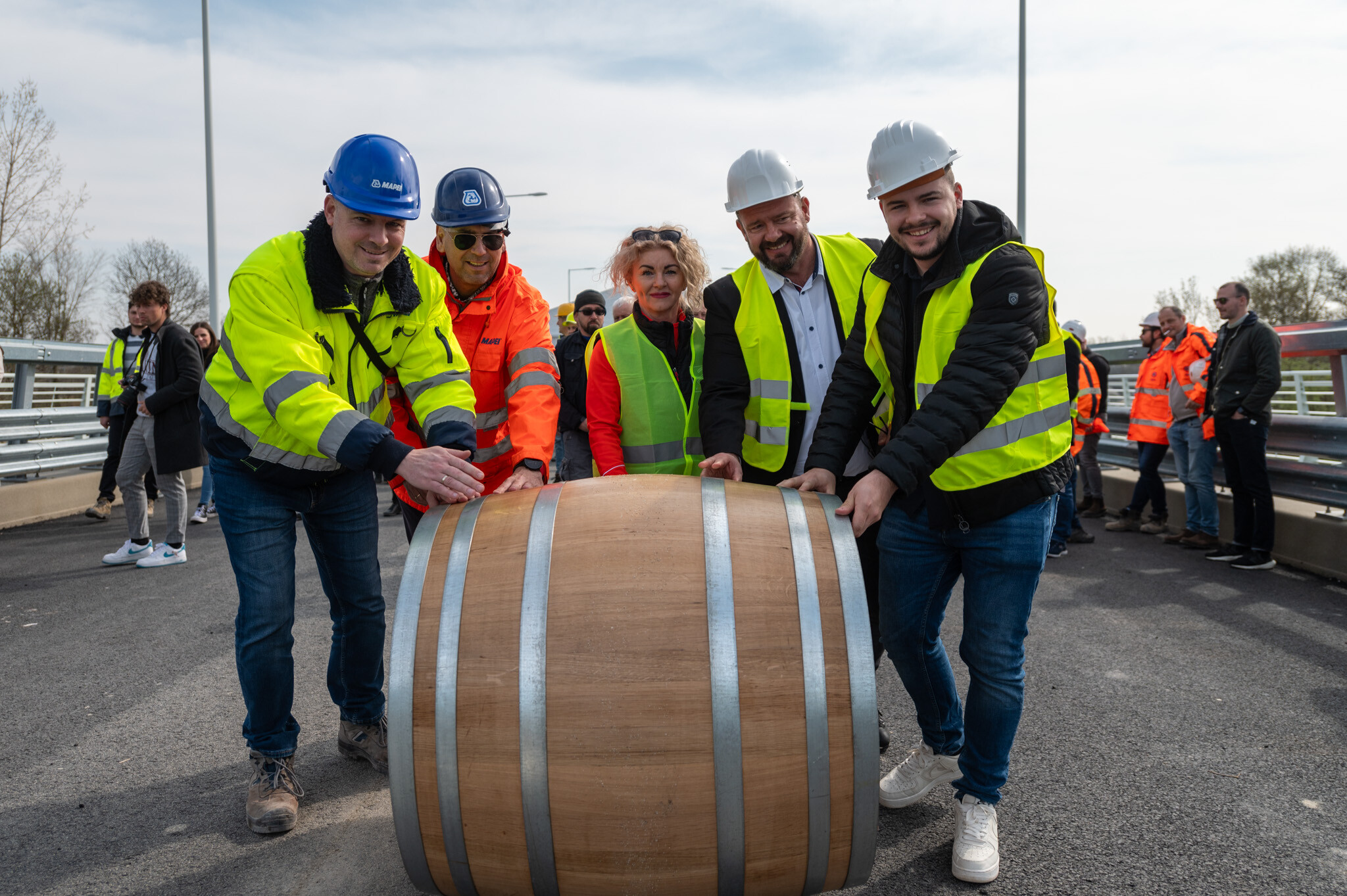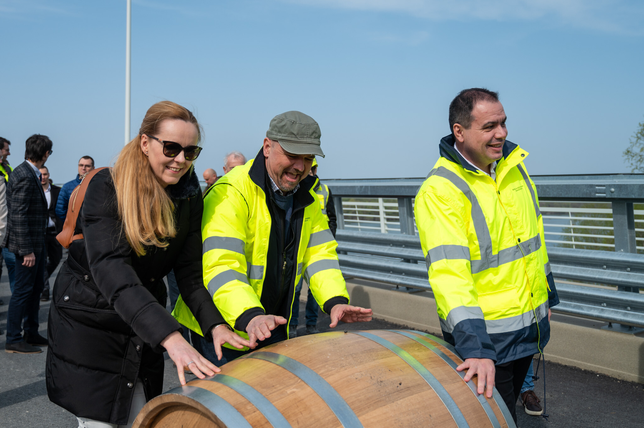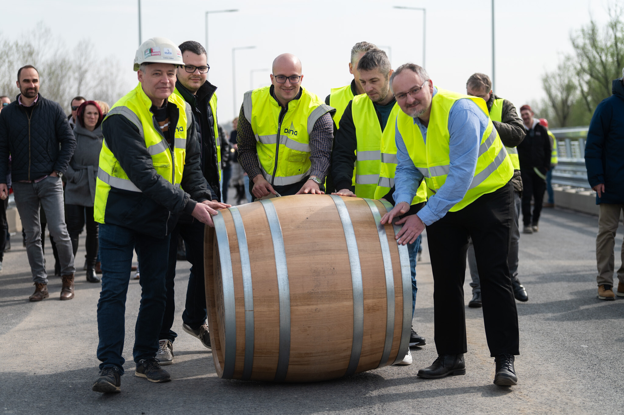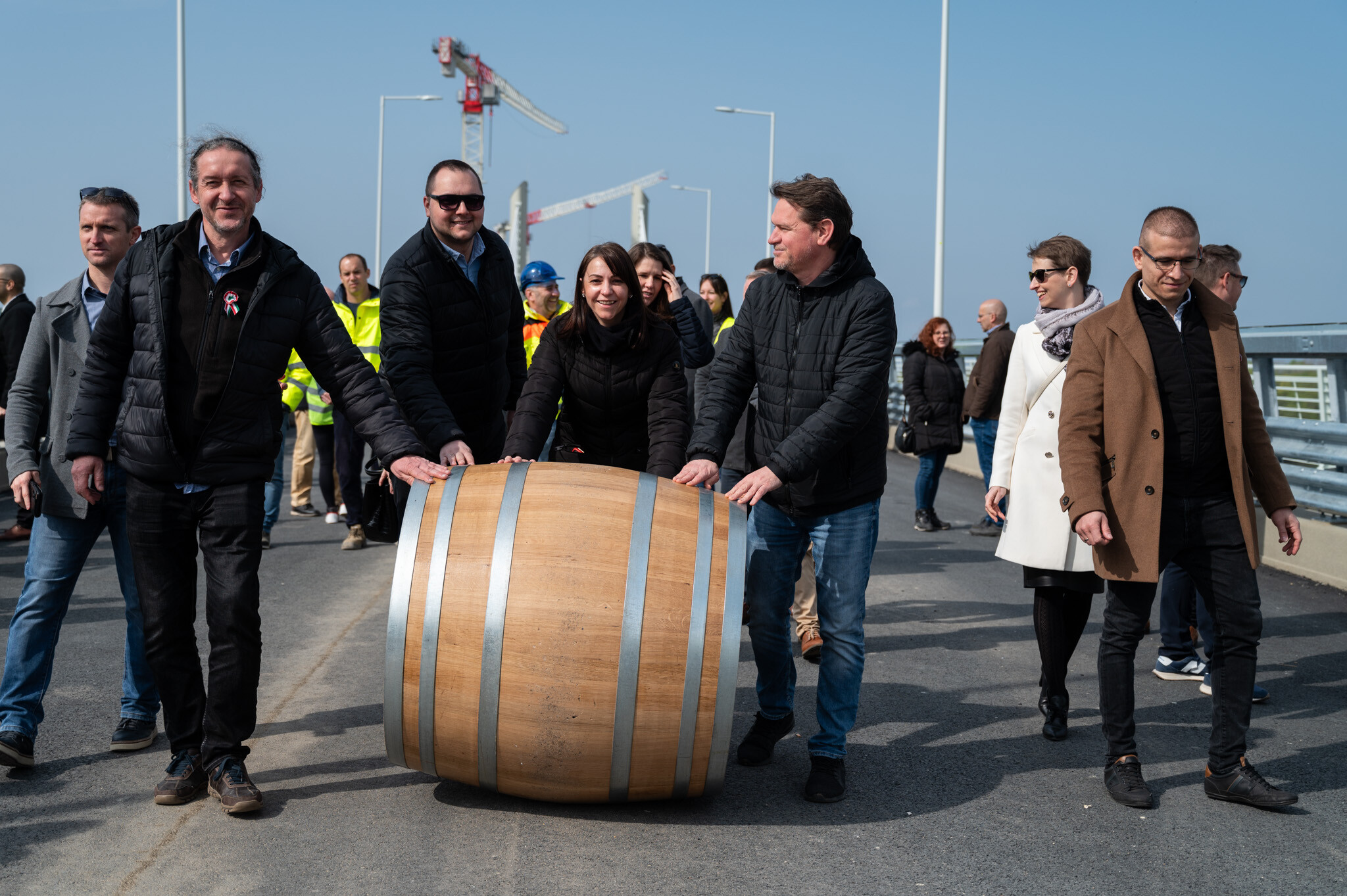 Foktő térségében március 14-én megtartották a Duna Aszfalt Zrt. kivitelezésében épülő Kalocsa-Paks Duna-híd hordógurítását. Az építőipari hagyományokat követő eseményre azt követően kerülhetett sor, hogy idén januárban a közel 1 kilométeres építményen teljessé vált a pályalemez. Ahogy azt az akkor beszámolónkban is jeleztük, ezt az tette lehetővé, hogy a balparti ártéri híd, majd a jobbparti ártéri híd szerkezetének betolását követően január 26-án a középső elemet képező mederhíd is bezárult.