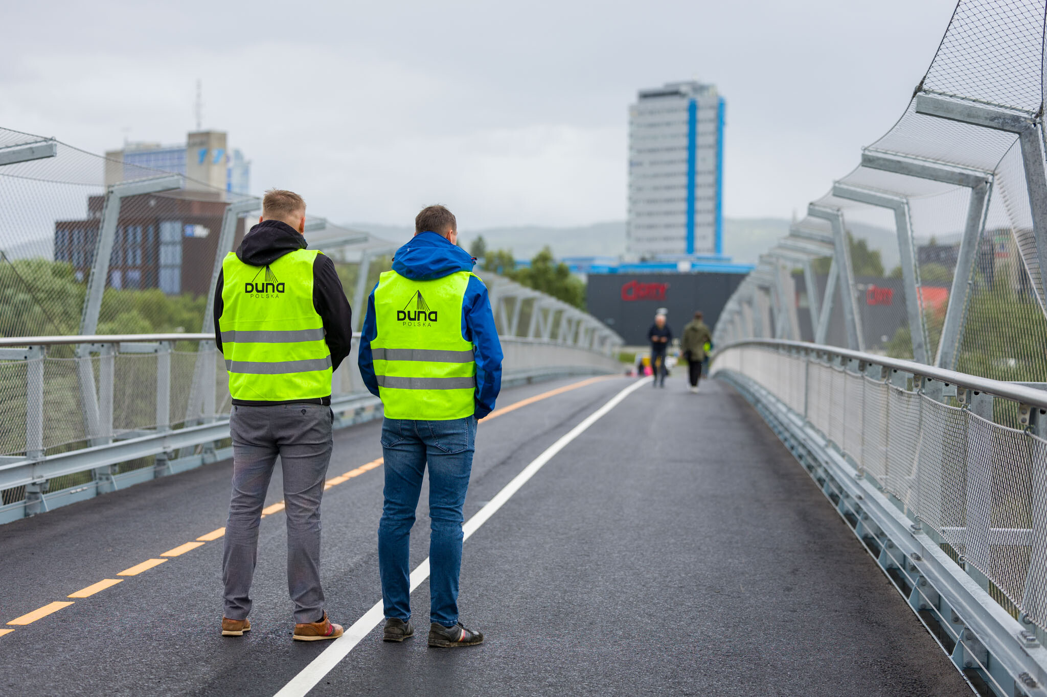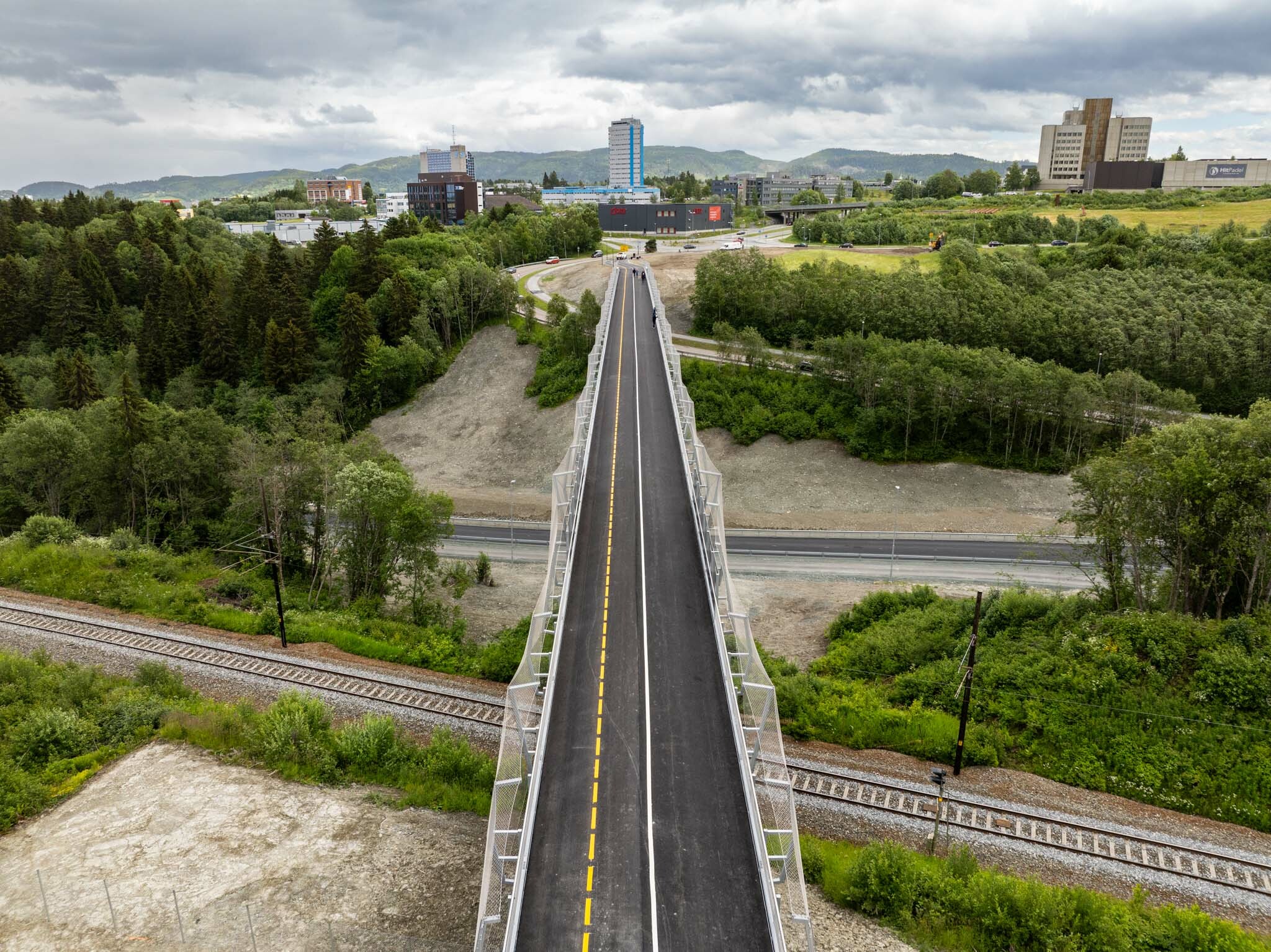A Duna Group lengyelországi üzemében gyártott 400 tonnás híd egy vasúti pálya és egy autóút felett ível át, két városrészt összekötve.
