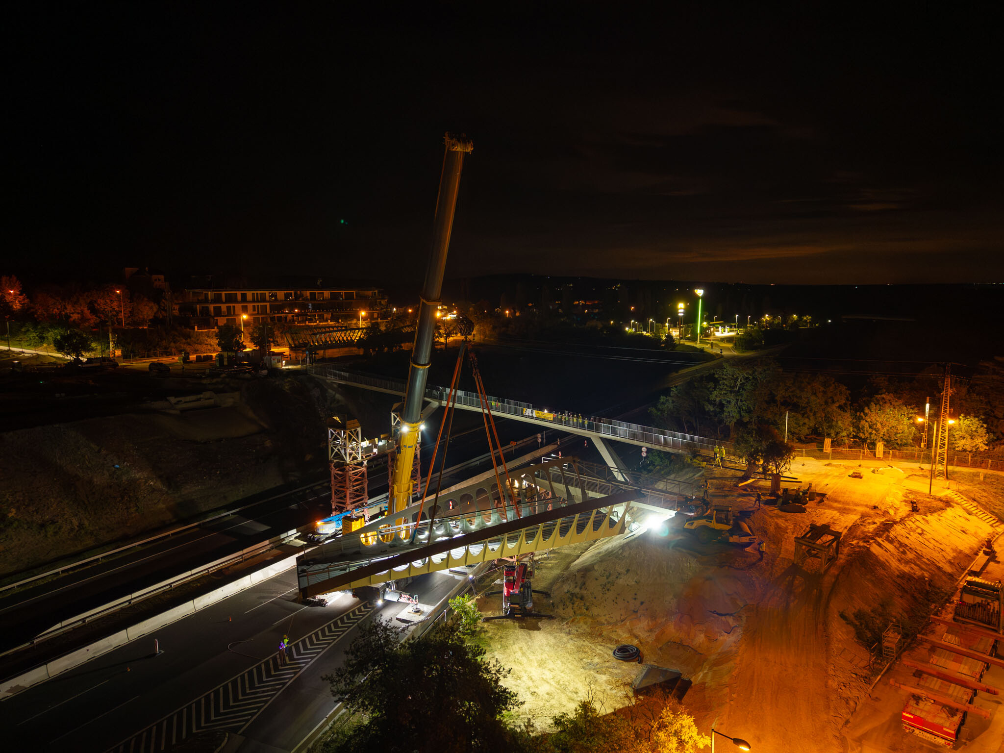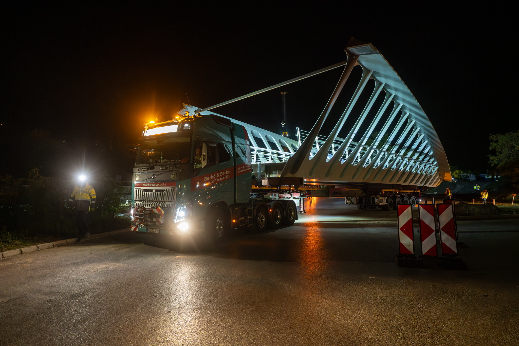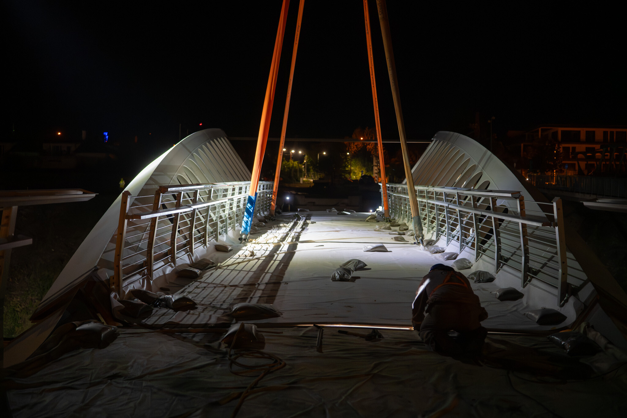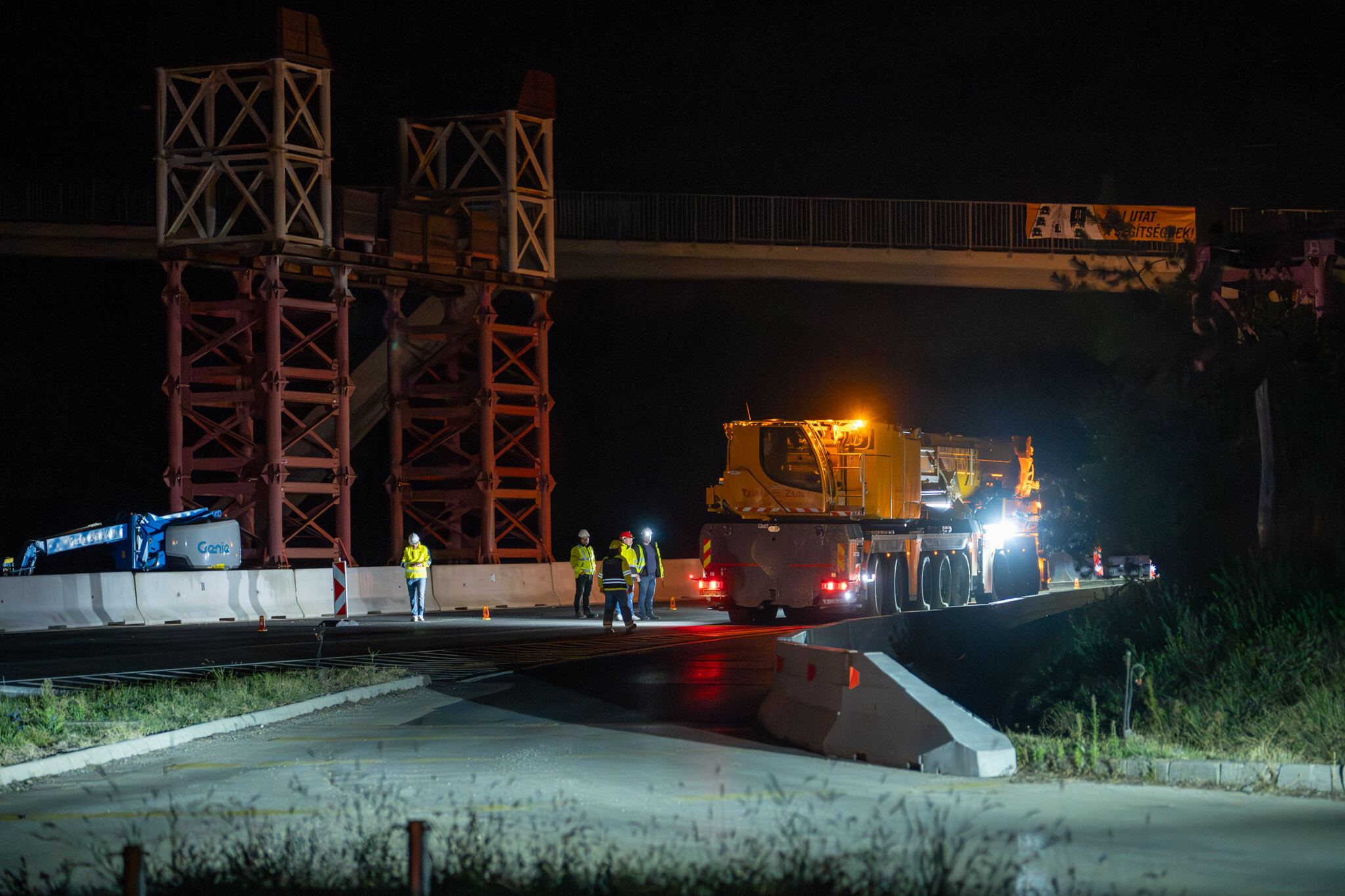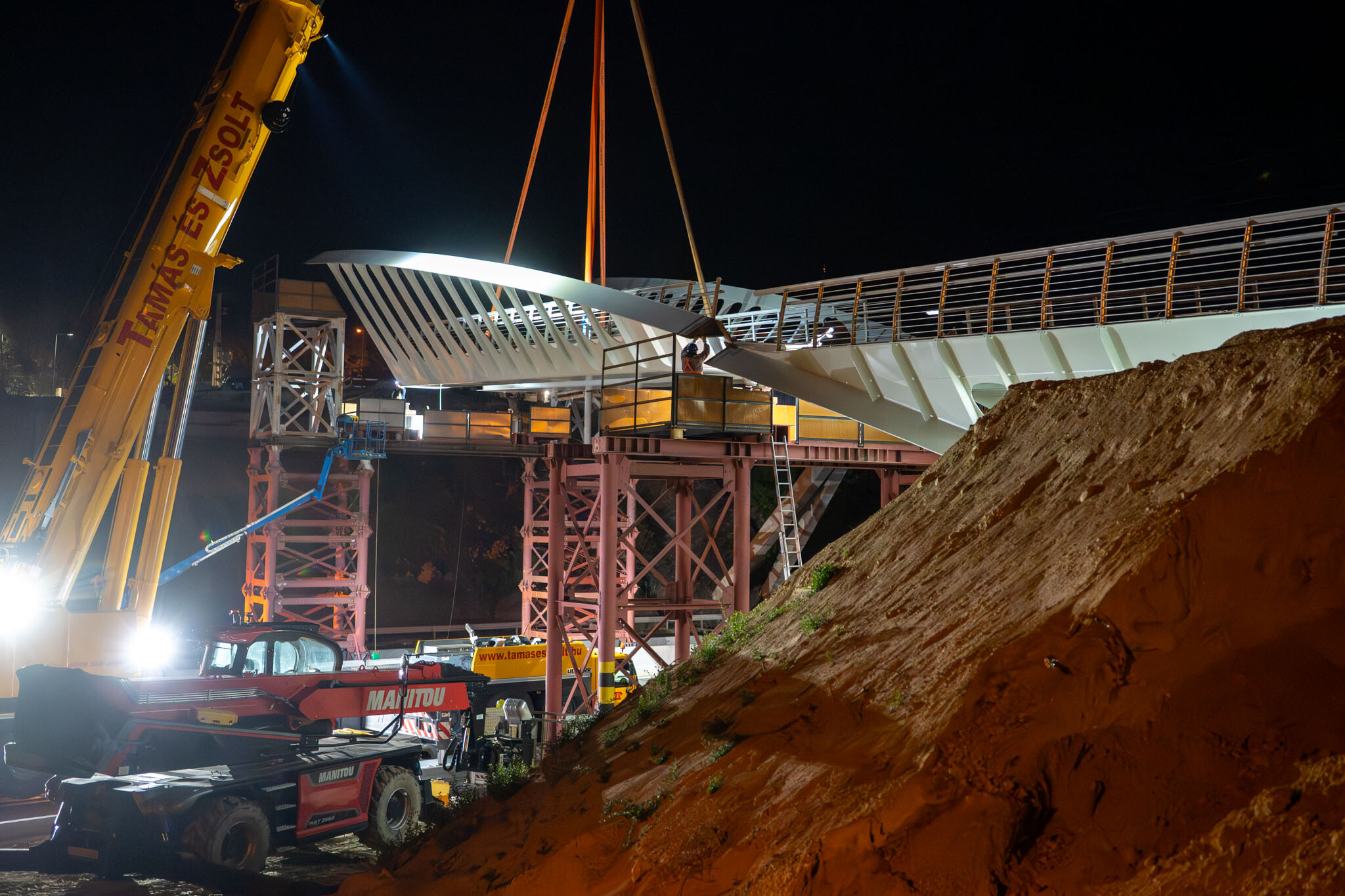 Mint arról korábban beszámoltunk, a 193 tonnás, 80 méter hosszú híd szerkezetét nyolc elemben szállították a helyszínre. Ezeket kettesével összeillesztették, így a beemelések alkalmával két-két, azaz összesen négy elemet kellett daruval a helyére tenni.