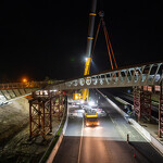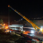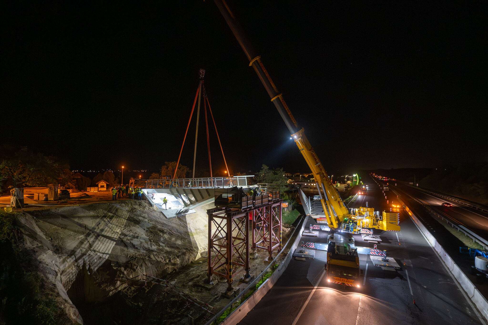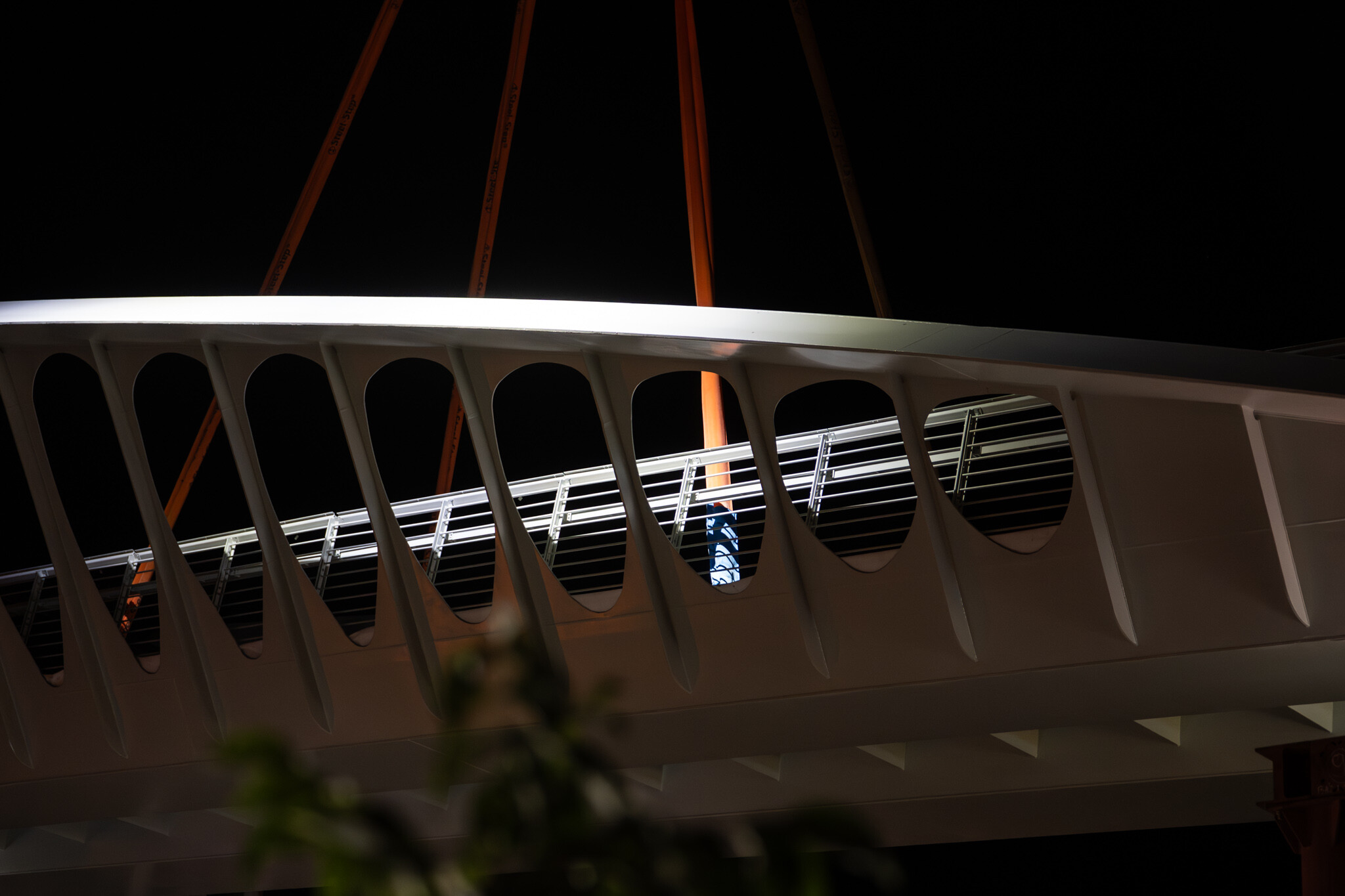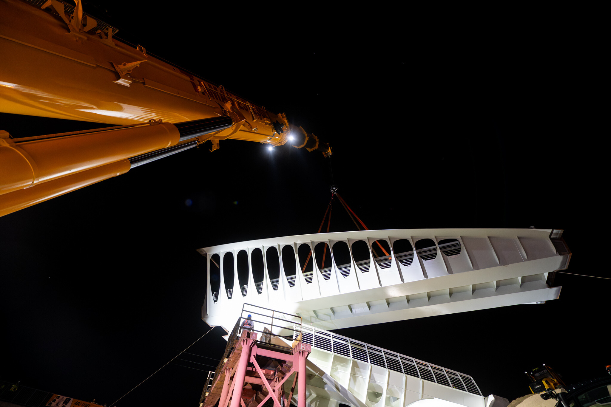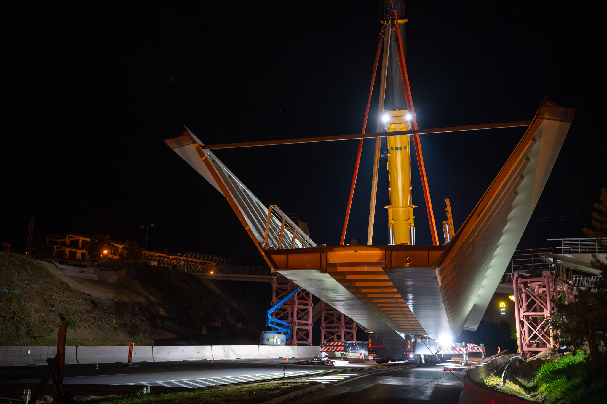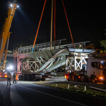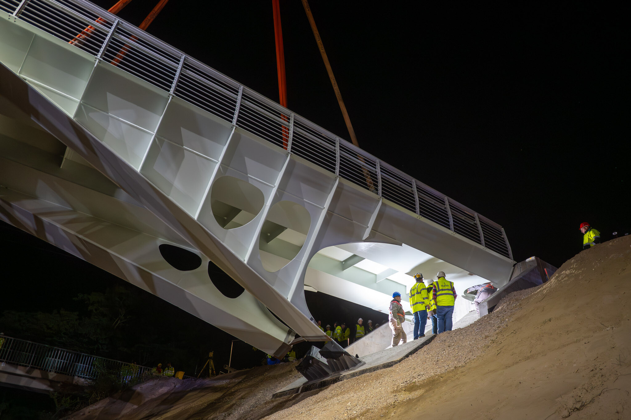 Mint arról korábban beszámoltunk, a 193 tonnás, 80 méter hosszú híd szerkezetét nyolc elemben szállították a helyszínre. Ezeket kettesével összeillesztették, így a beemelések alkalmával két-két, azaz összesen négy elemet kellett daruval a helyére tenni.