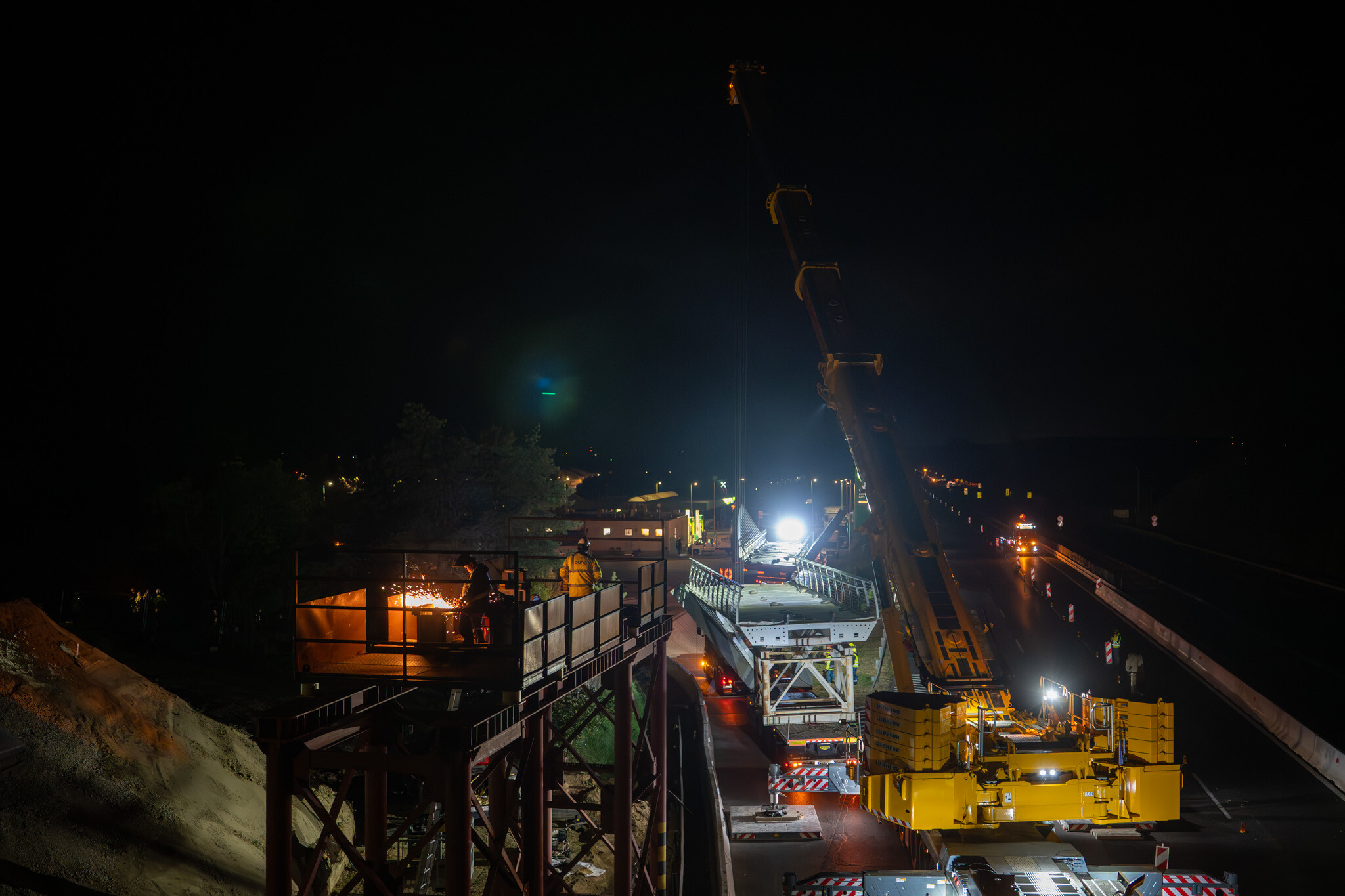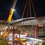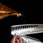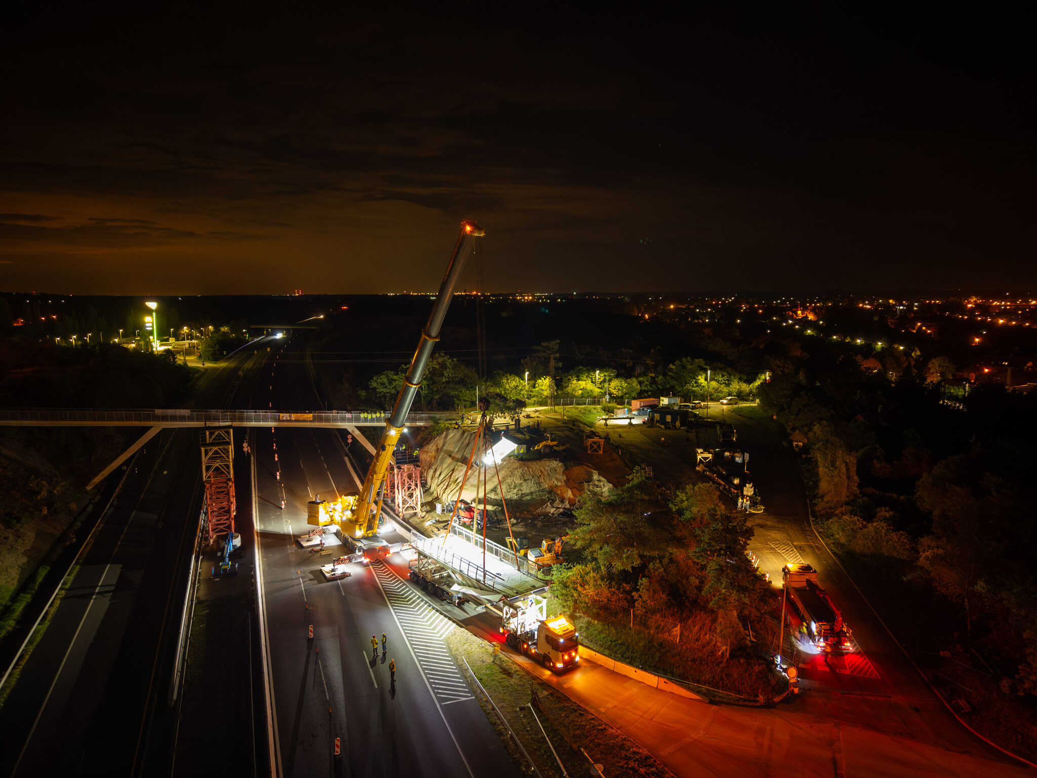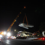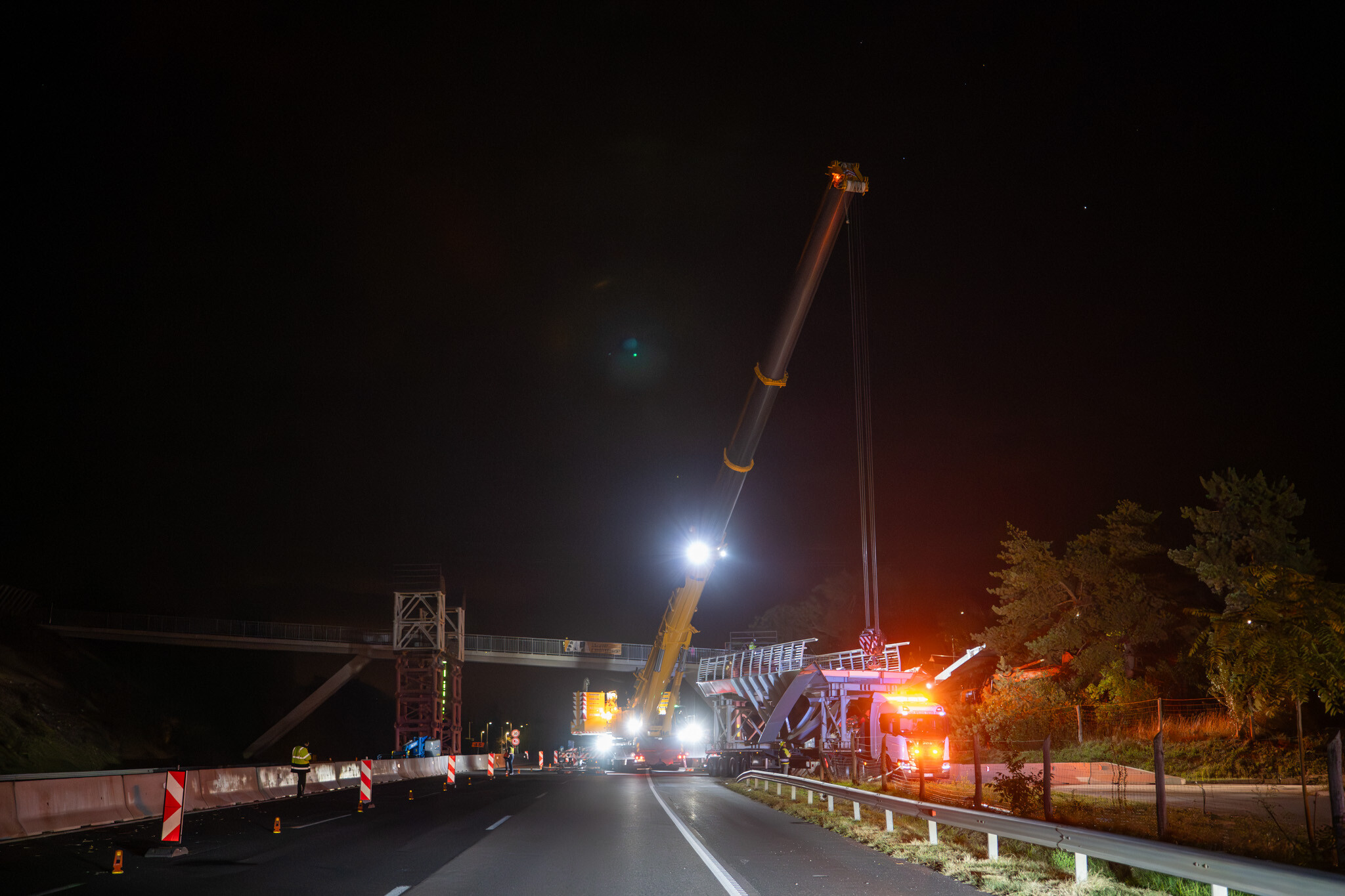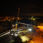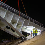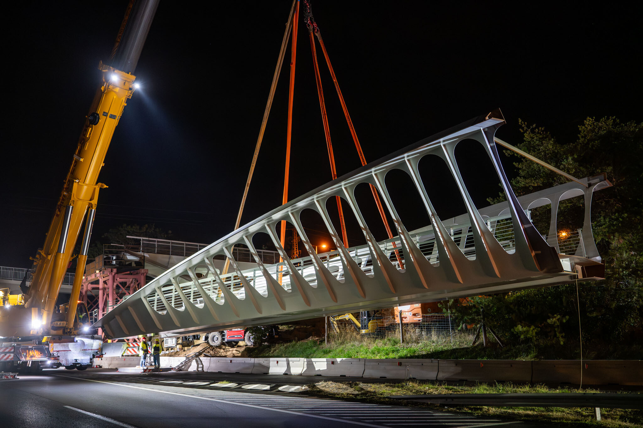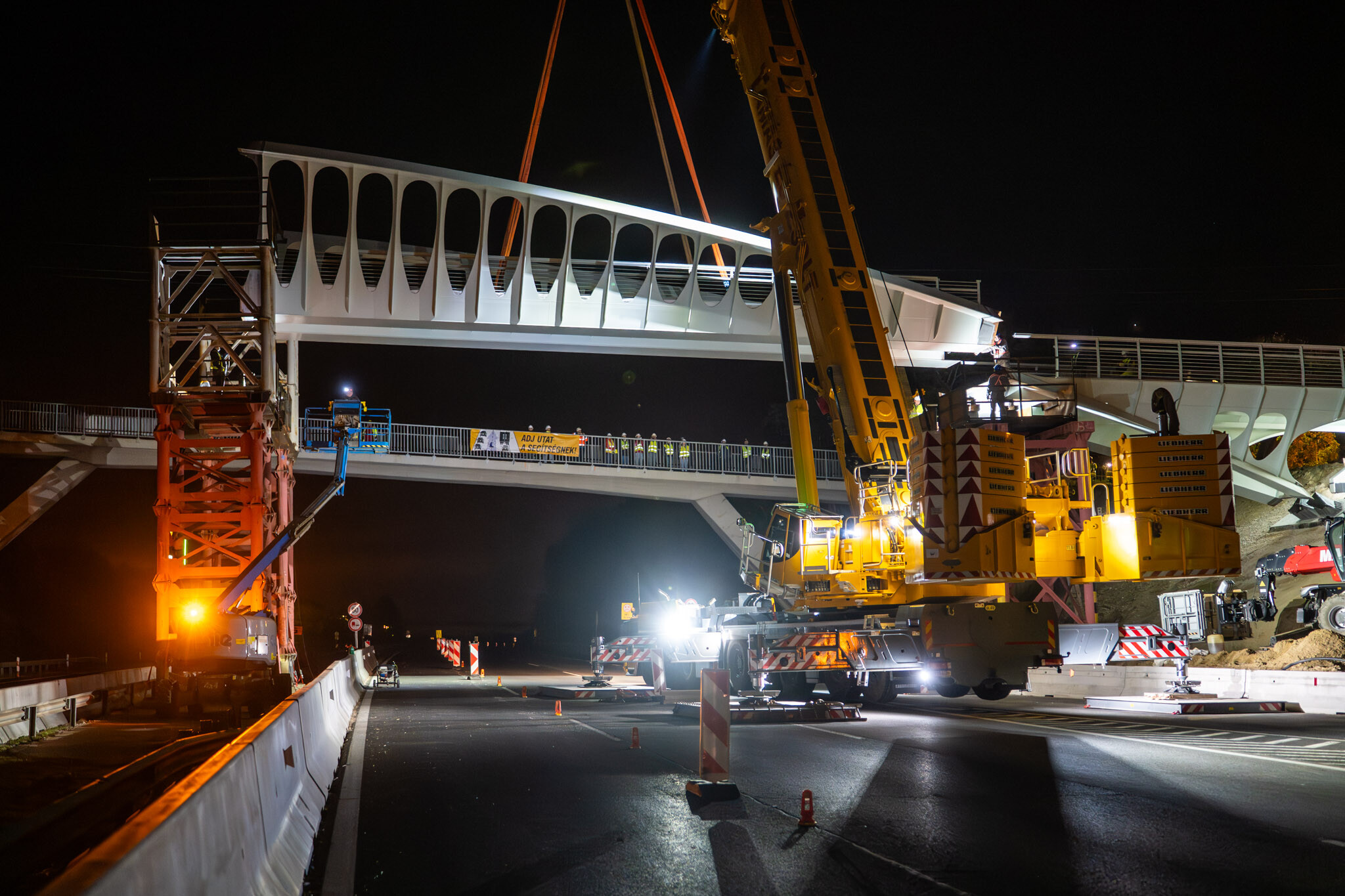 Mint arról korábban beszámoltunk, a 193 tonnás, 80 méter hosszú híd szerkezetét nyolc elemben szállították a helyszínre. Ezeket kettesével összeillesztették, így a beemelések alkalmával két-két, azaz összesen négy elemet kellett daruval a helyére tenni.