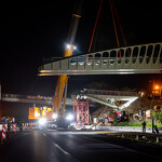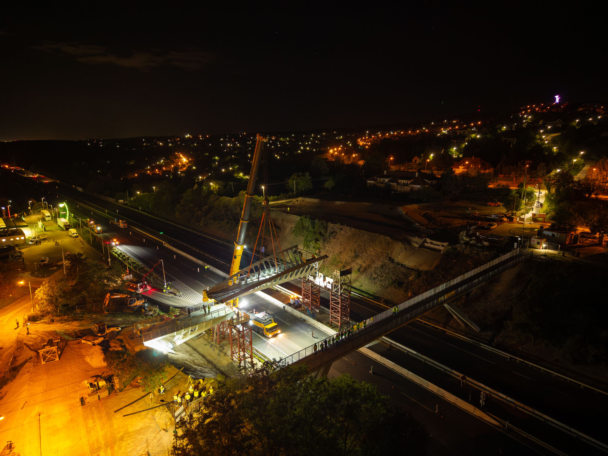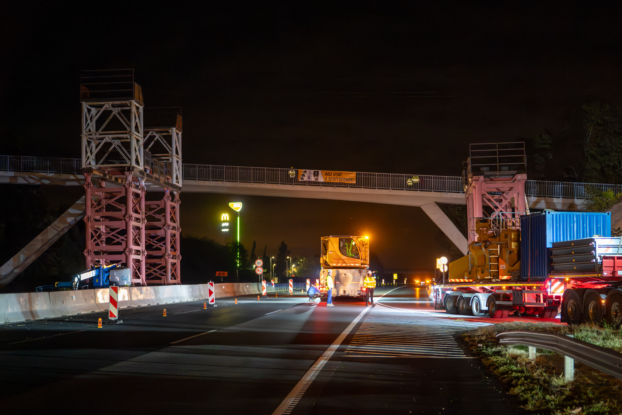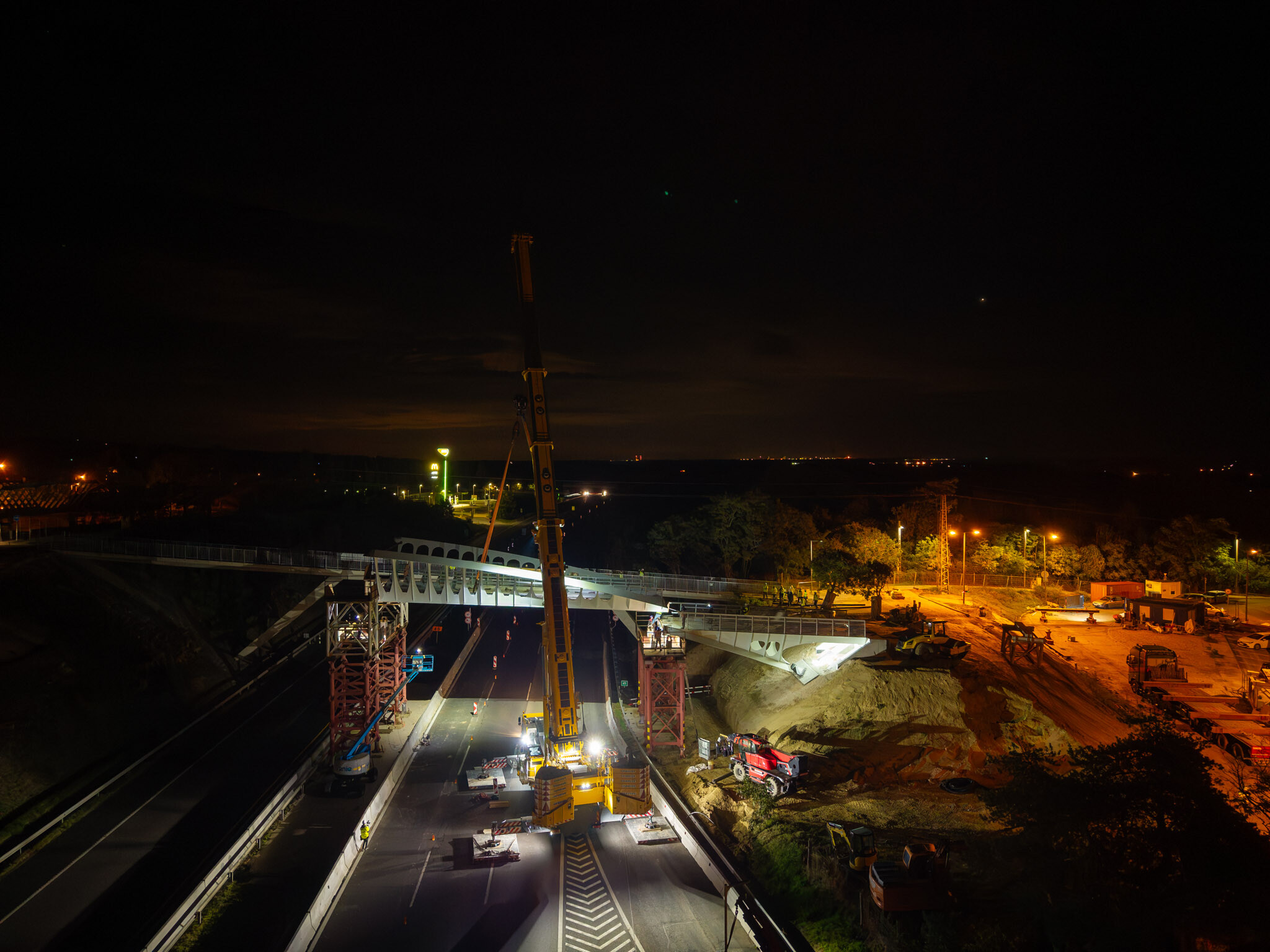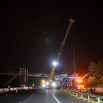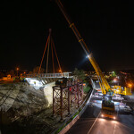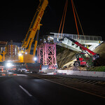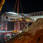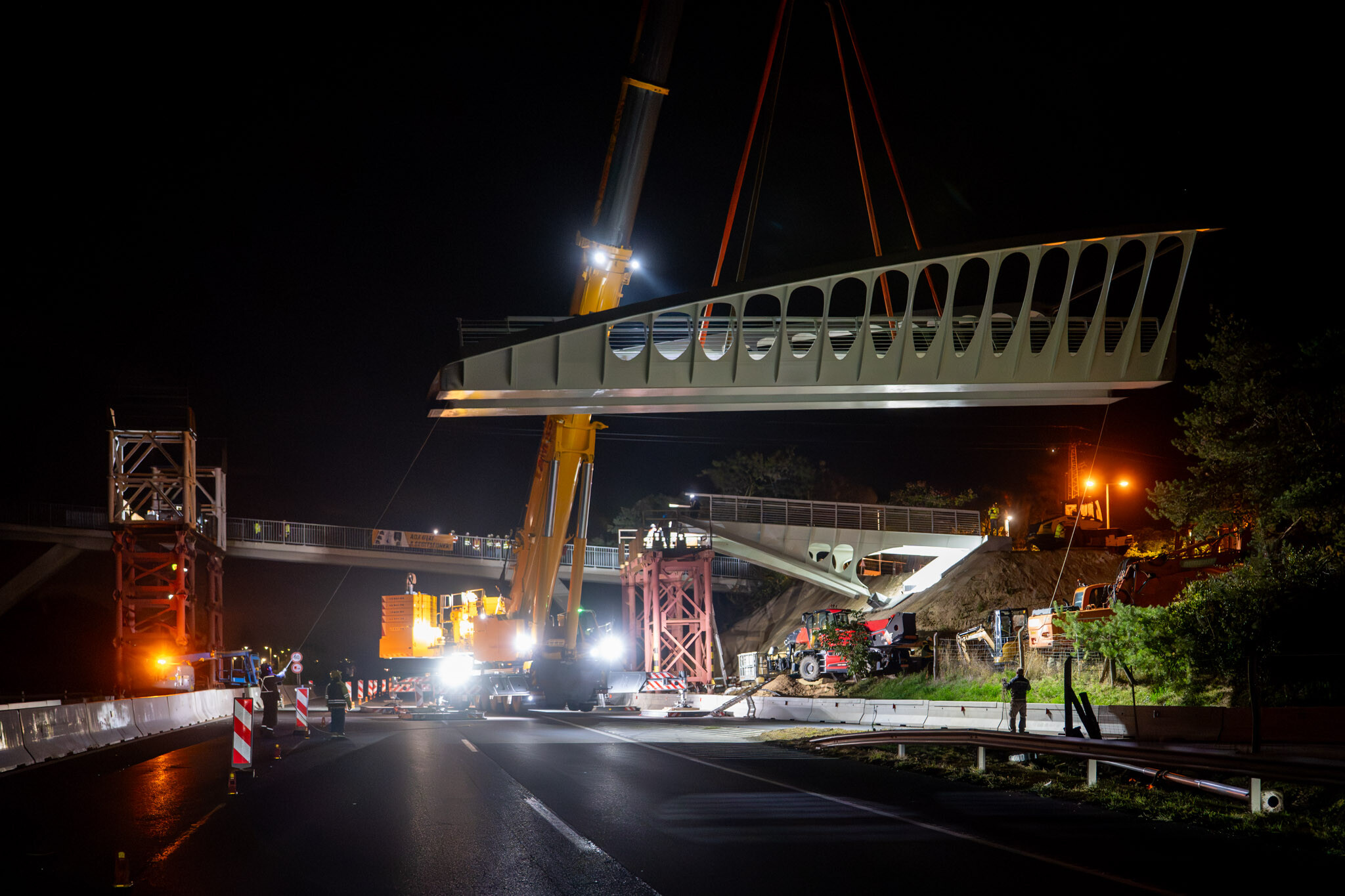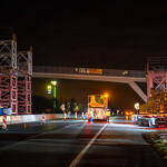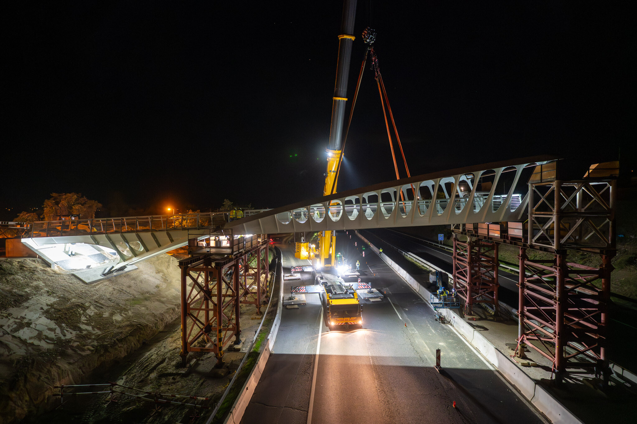 Mint arról korábban beszámoltunk, a 193 tonnás, 80 méter hosszú híd szerkezetét nyolc elemben szállították a helyszínre. Ezeket kettesével összeillesztették, így a beemelések alkalmával két-két, azaz összesen négy elemet kellett daruval a helyére tenni.