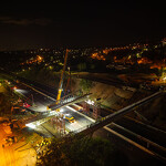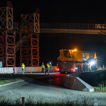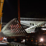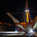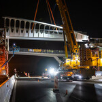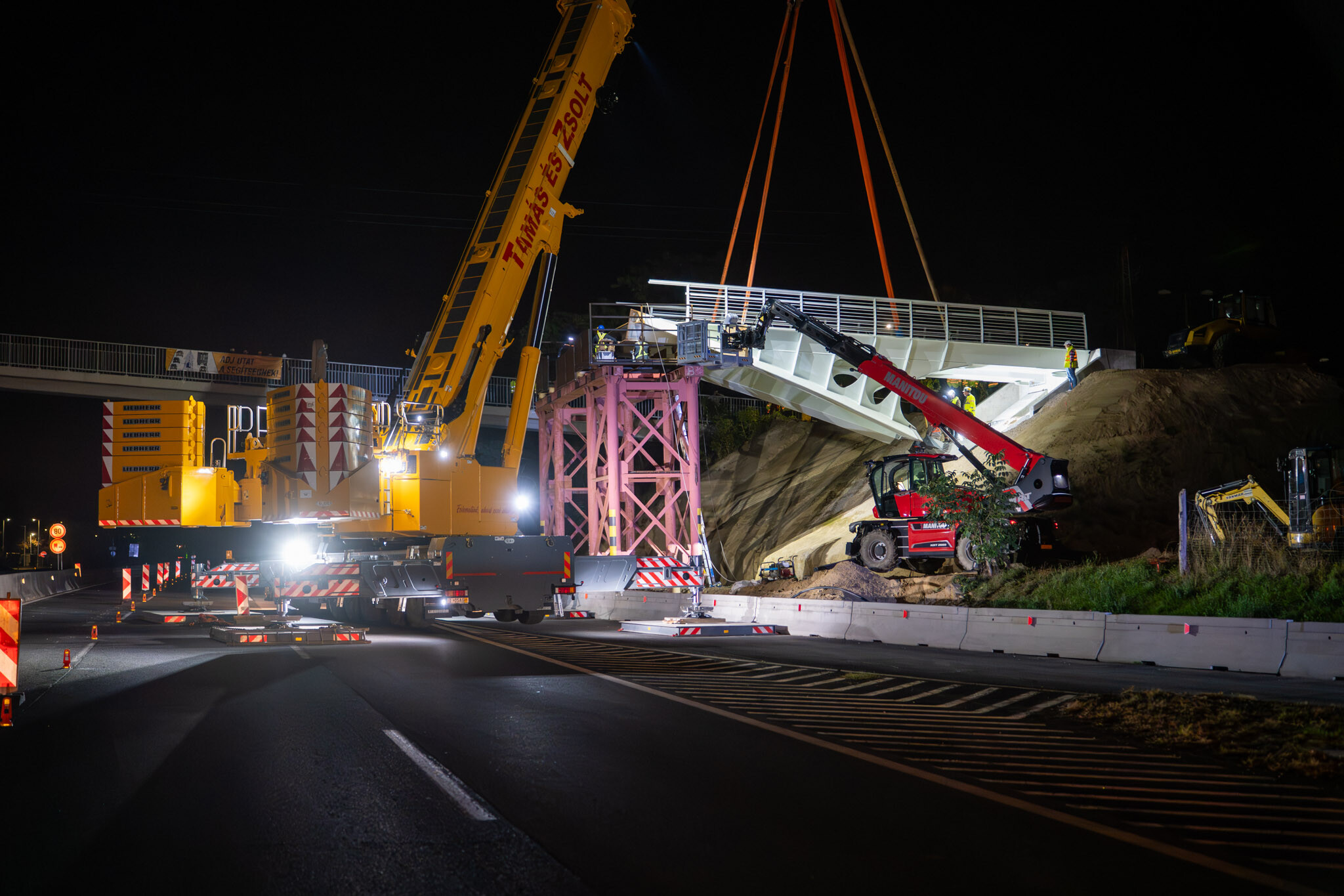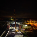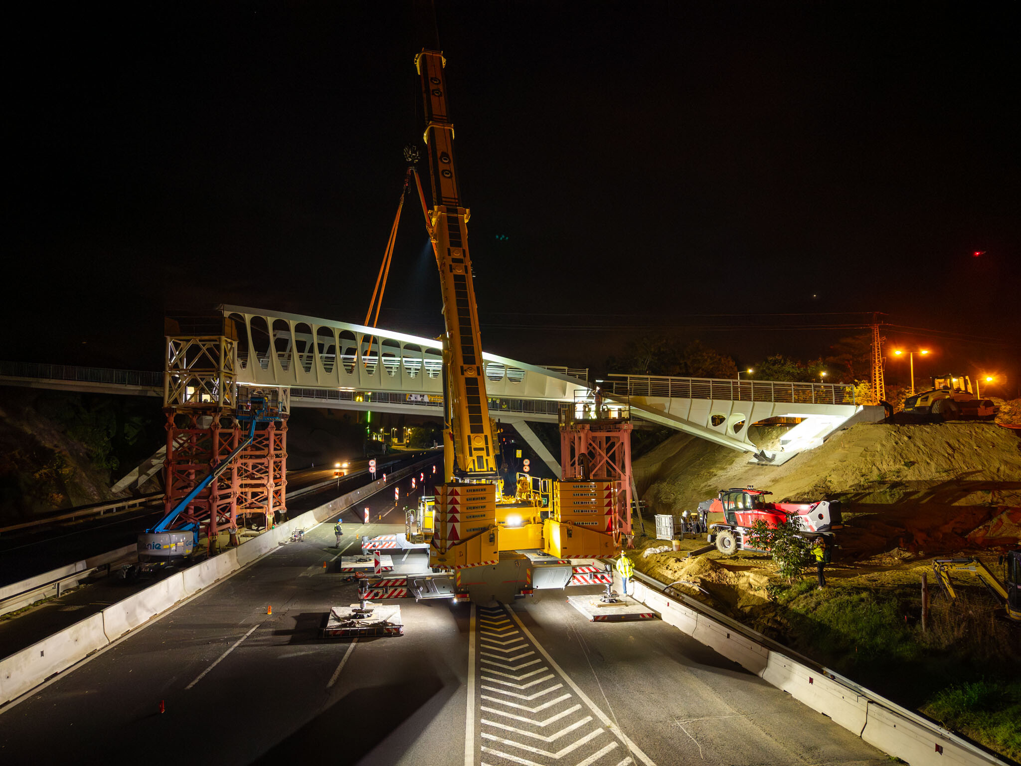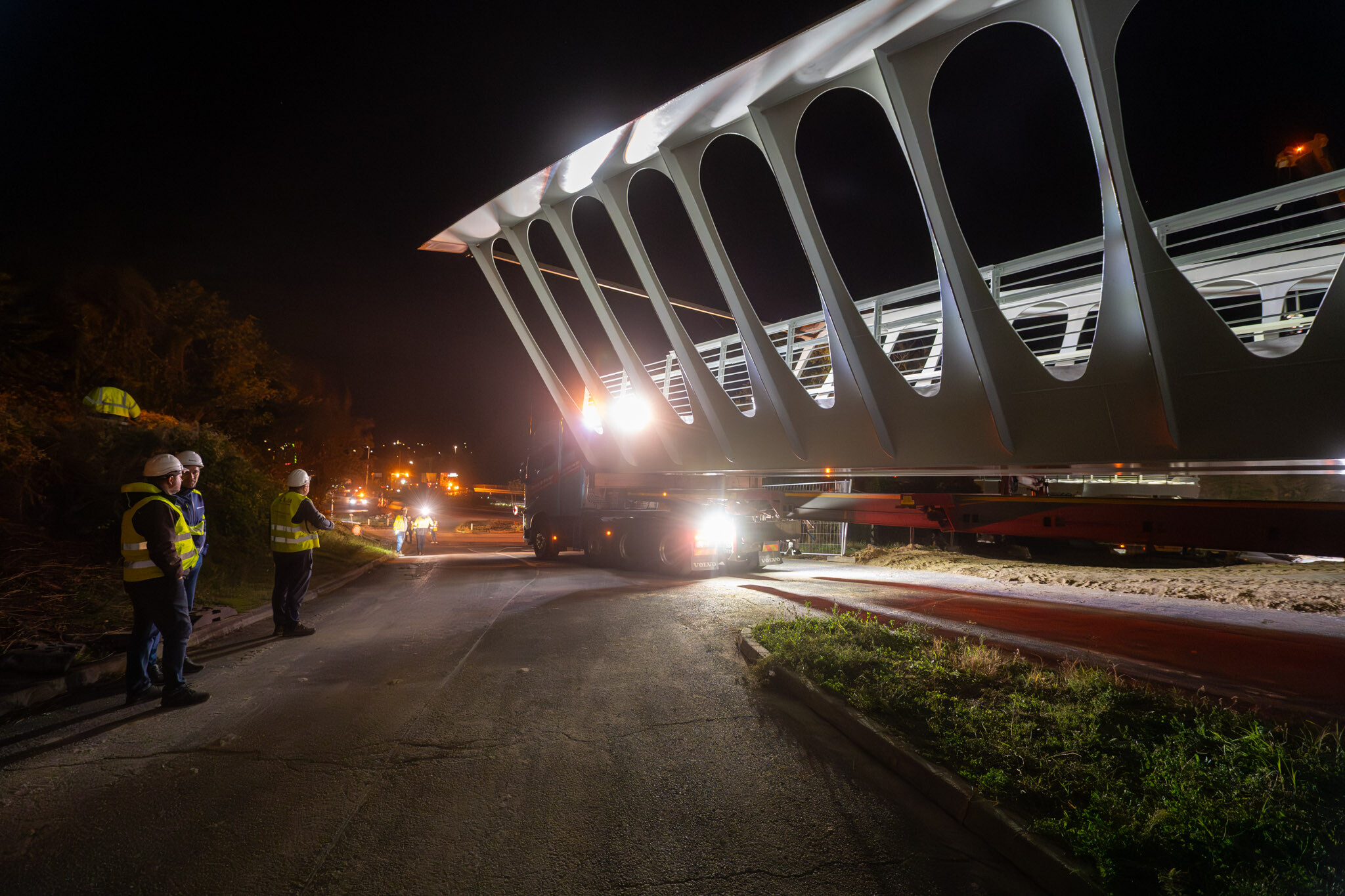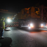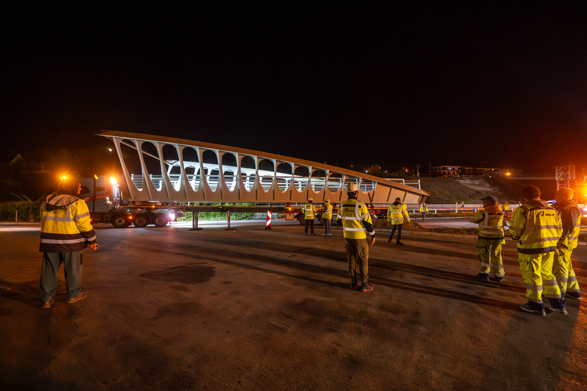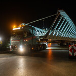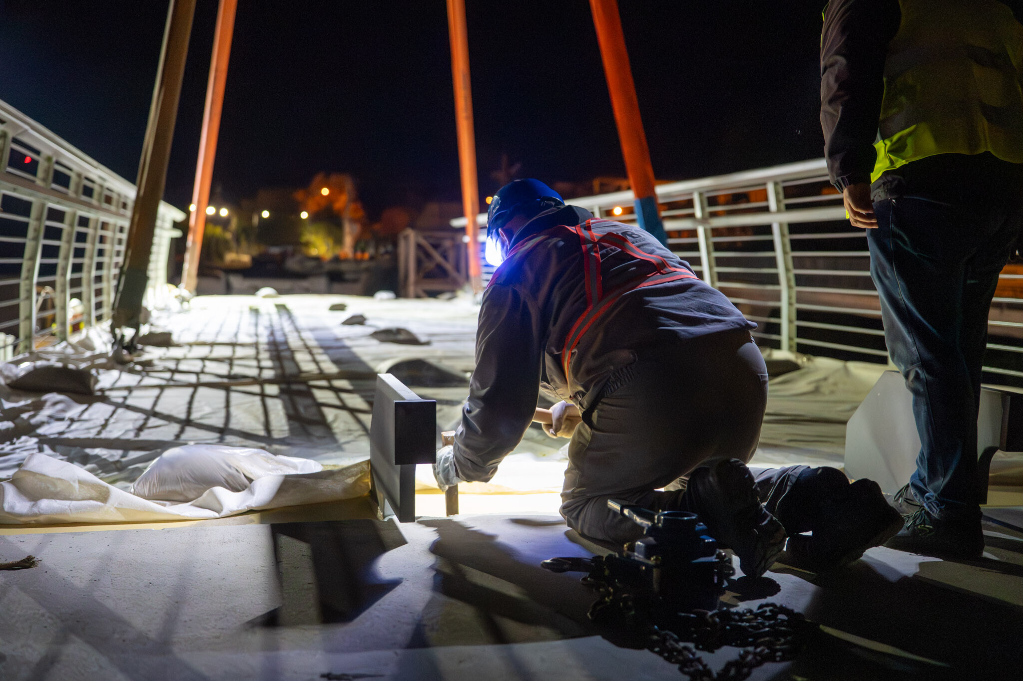 Mint arról korábban beszámoltunk, a 193 tonnás, 80 méter hosszú híd szerkezetét nyolc elemben szállították a helyszínre. Ezeket kettesével összeillesztették, így a beemelések alkalmával két-két, azaz összesen négy elemet kellett daruval a helyére tenni.