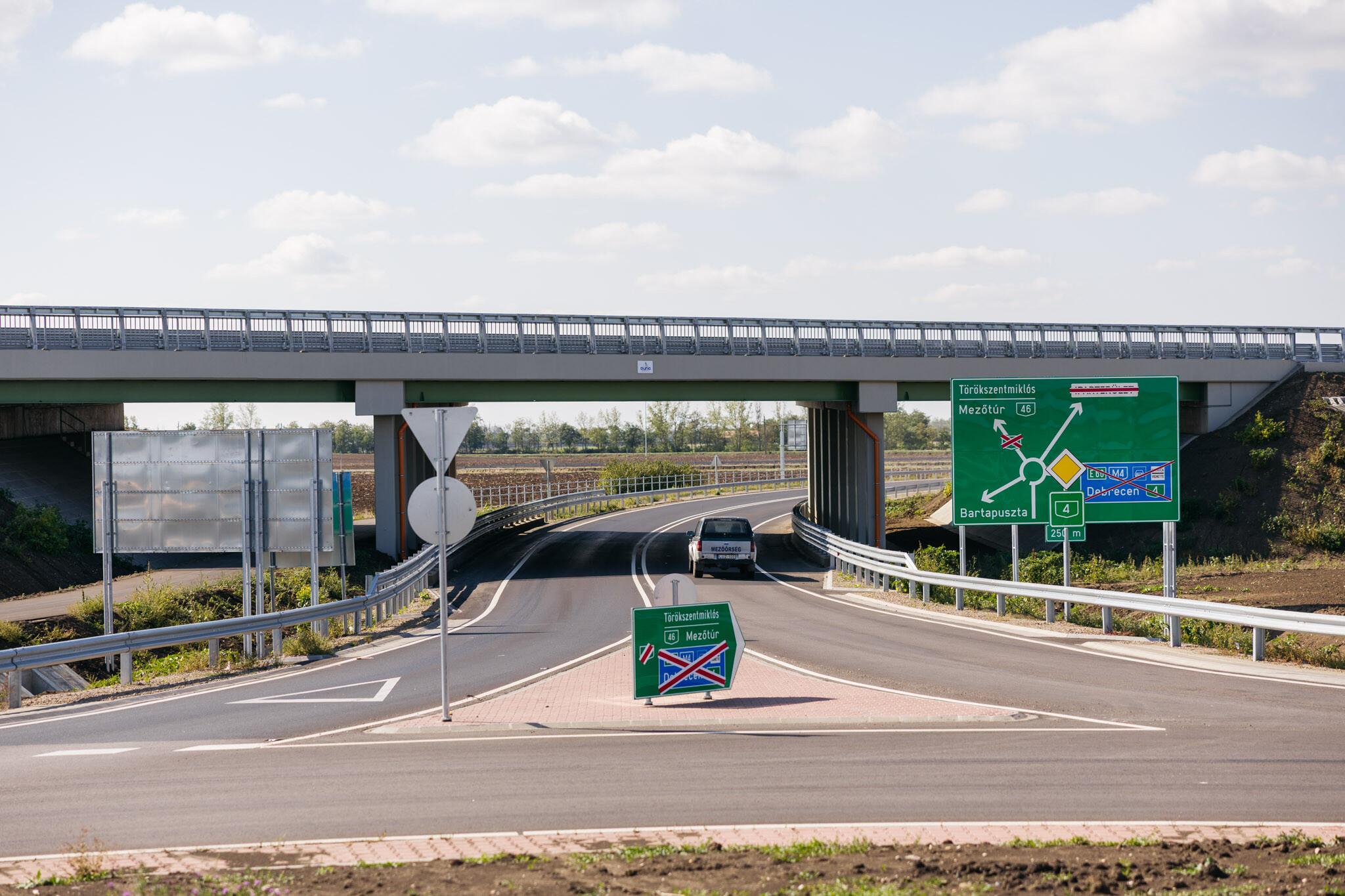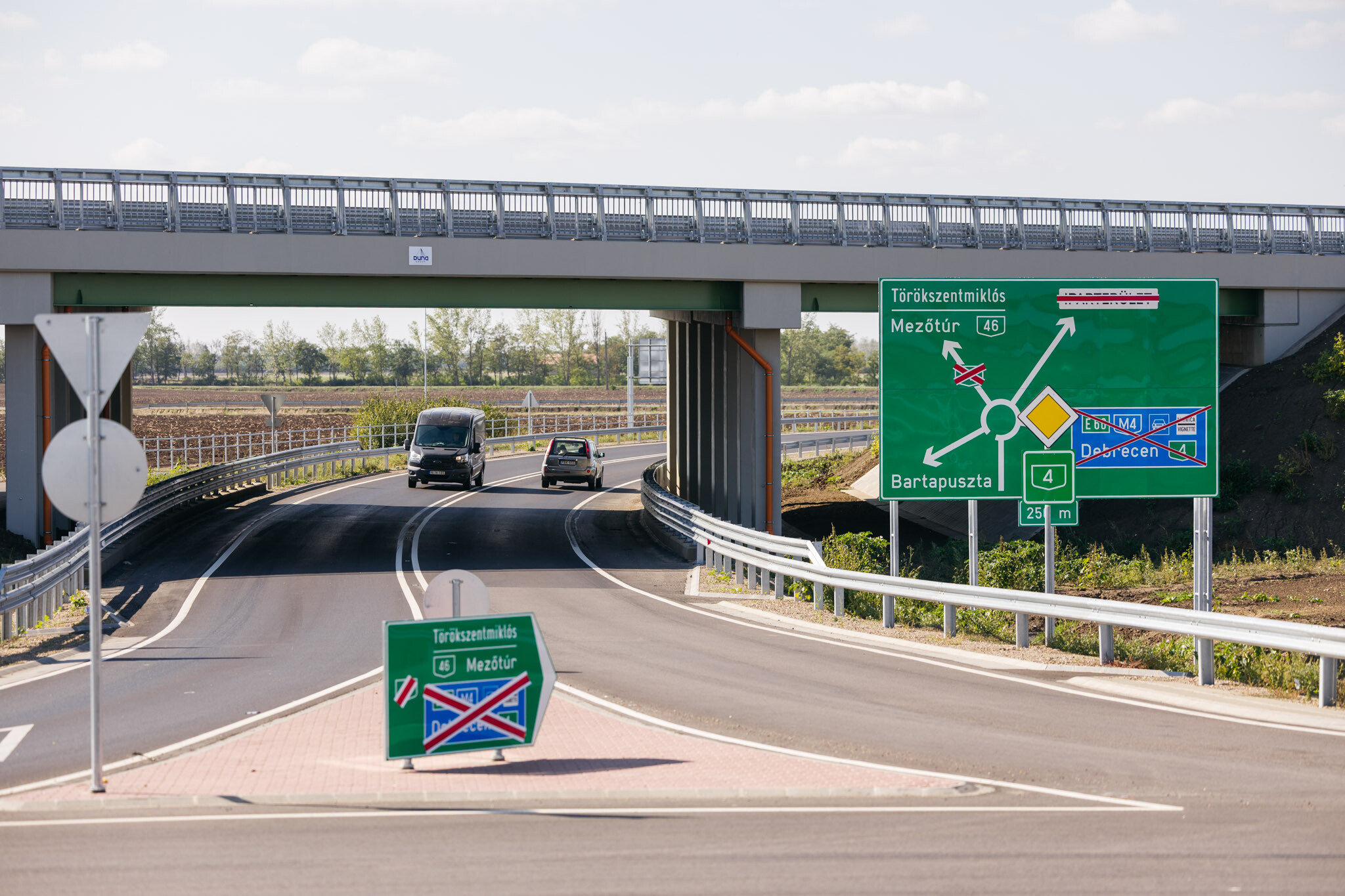 A Törökszentmiklós és Kisújszállás közötti 17,5 kilométeres új nyomvonalon szintén befejeződtek az aszfaltburkolat-építési munkák. Már csak egy vadátjáróval kombinált földút aszfaltozása van hátra. A rézsűk humuszolása és füvesítése folyamatban van, a forgalomtechnikai munkák 75 százalékos készültségűek, befejezésük októberre várható. A vadvédő kerítés, kapuk és vadkiugró rámpák építése 70 százaléknál tart.