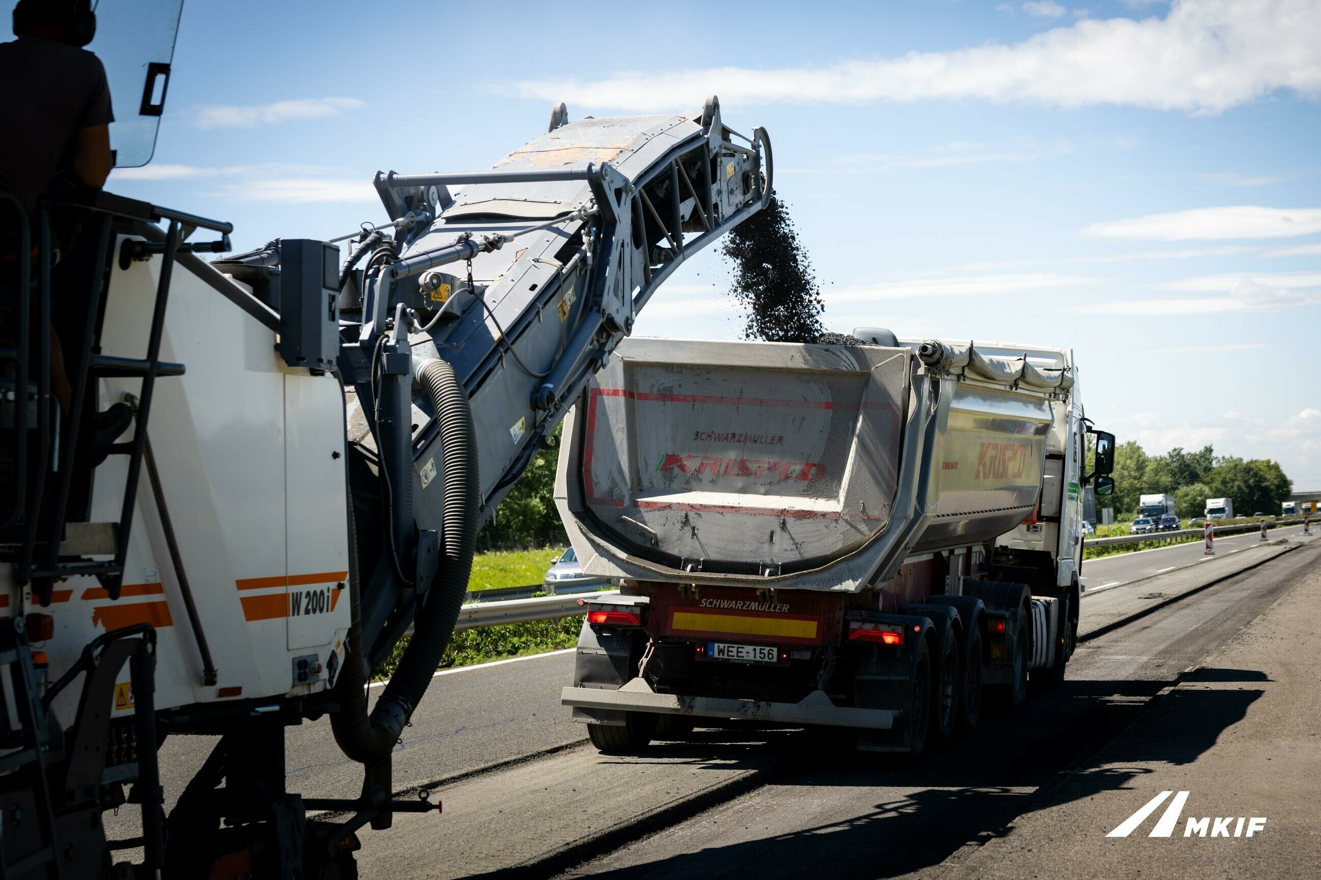 Az autópálya-szerkezet több rétegből épül fel, és a felújítás során kulcskérdés, hogy elegendő-e a kopóréteg cseréje, vagy mélyebb rétegekhez is hozzá kell nyúlni. A lezárás után az első látványos lépés a marás: a géplánc a terv szerinti vastagságban távolítja el a régi, repedezett aszfaltot.