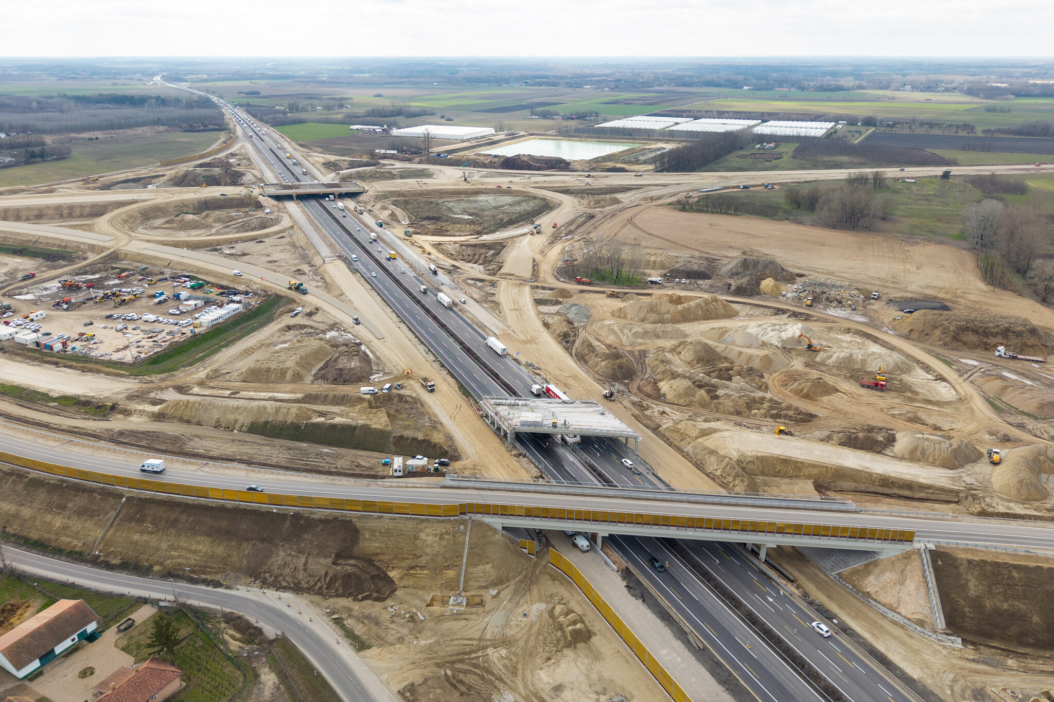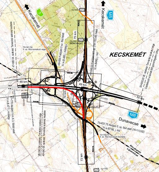 Az M5-ös autópálya keresztezésében épülő M44-es (M8-as) autópálya jobb oldali gyűjtő-elosztó pályájának a pályalemez betonozása még a tavalyi évben, a bal oldali gyűjtő-elosztó pályájának a pályalemez betonozása február 24-én elkészült. Jelenleg a beton utógondozás, illetve a főpályán a pályalemez betonacélszerelése történik. A már forgalom számára átadott, az M5-ös autópálya keresztezésében lévő 5-ös főútnál a jövőhét folyamán kezdődnek a sóvédelmi bevonatok előkészítő munkálatai a híd alépítményi részein.