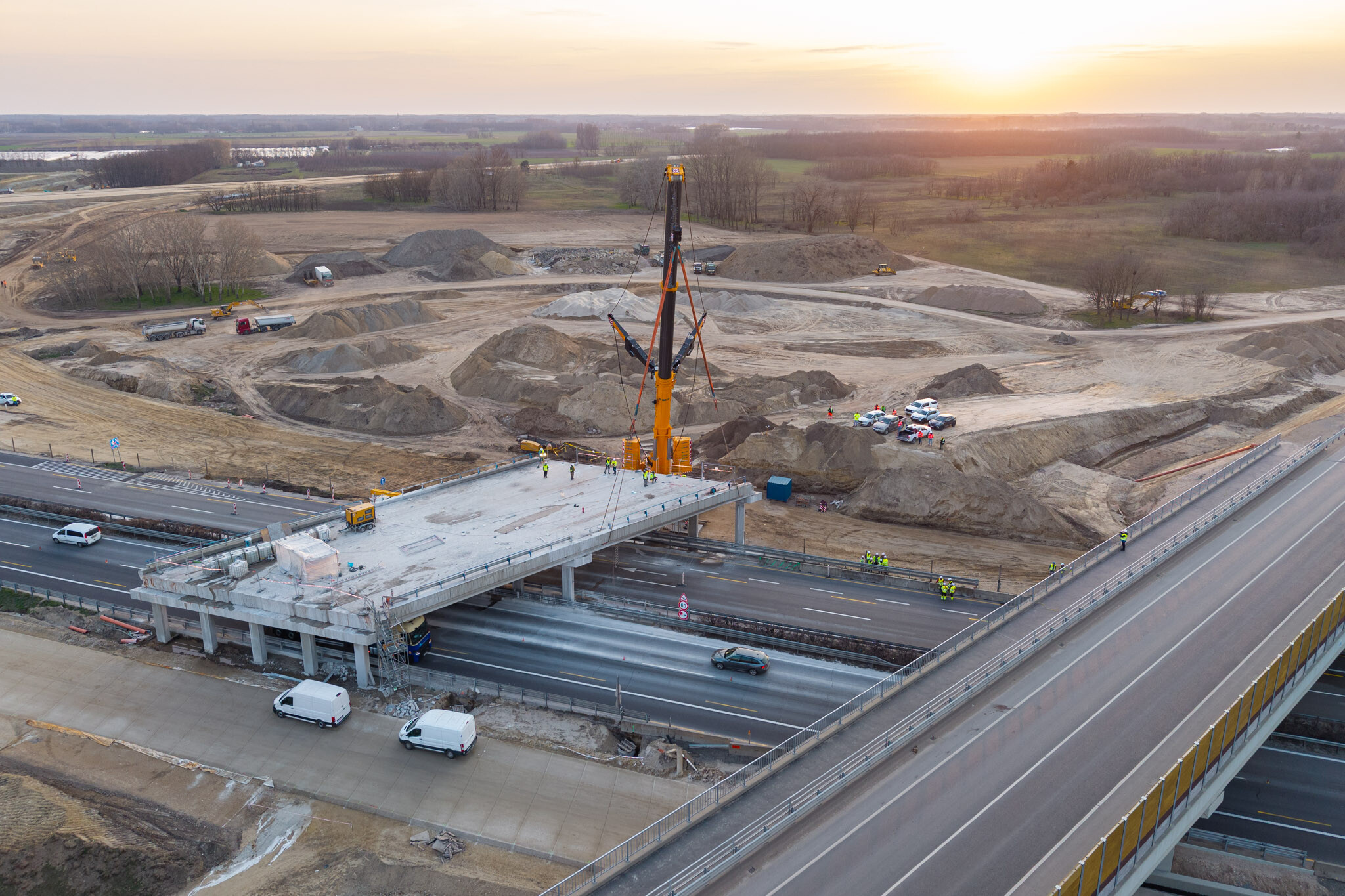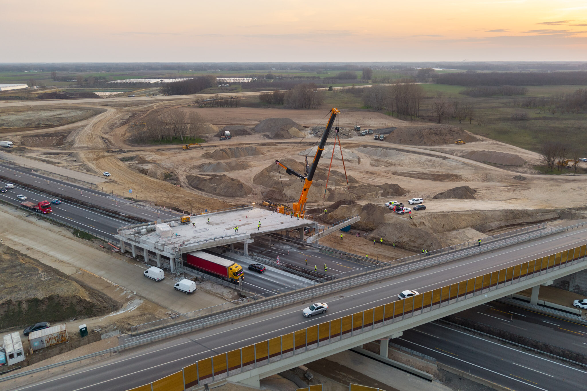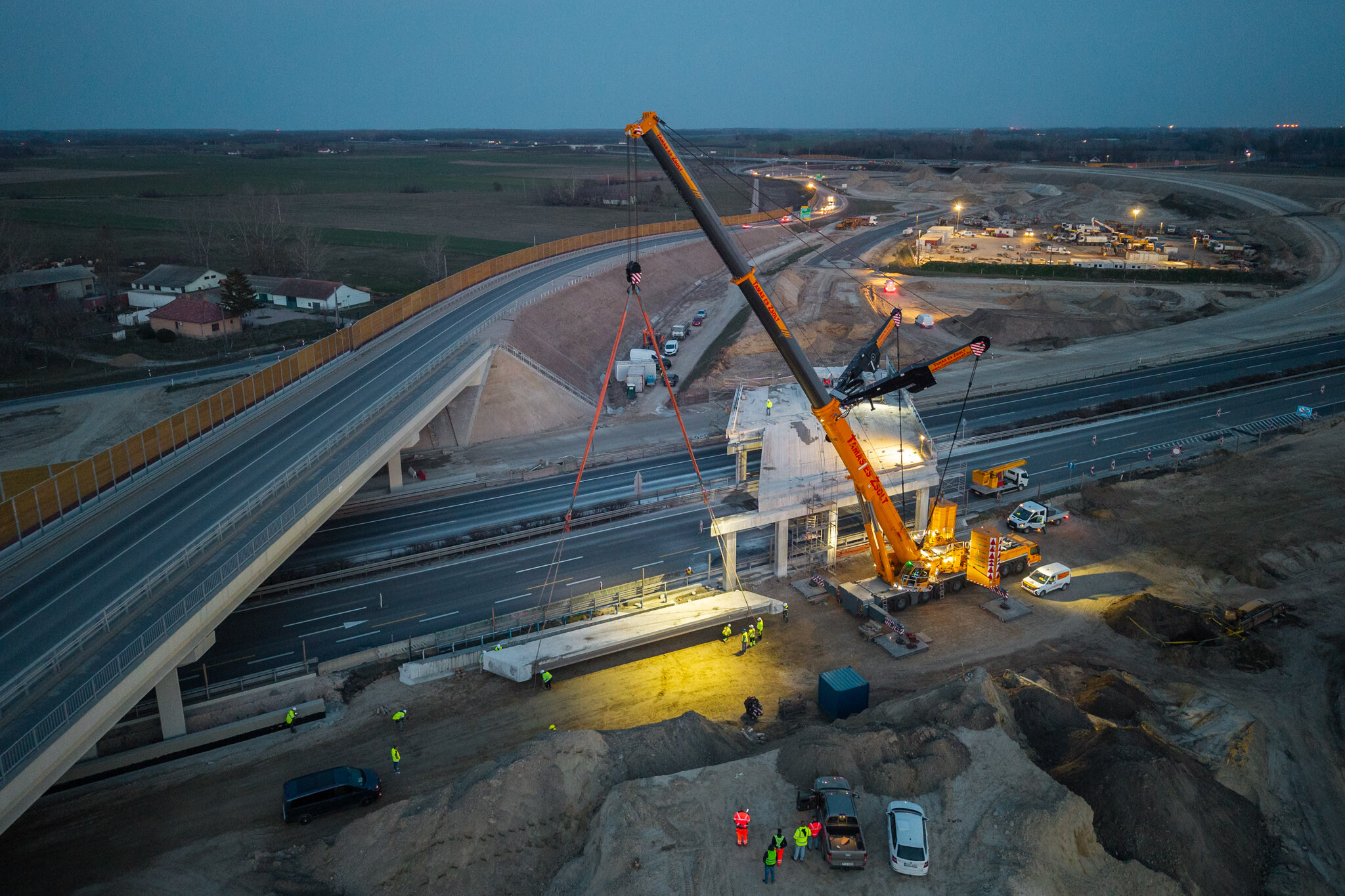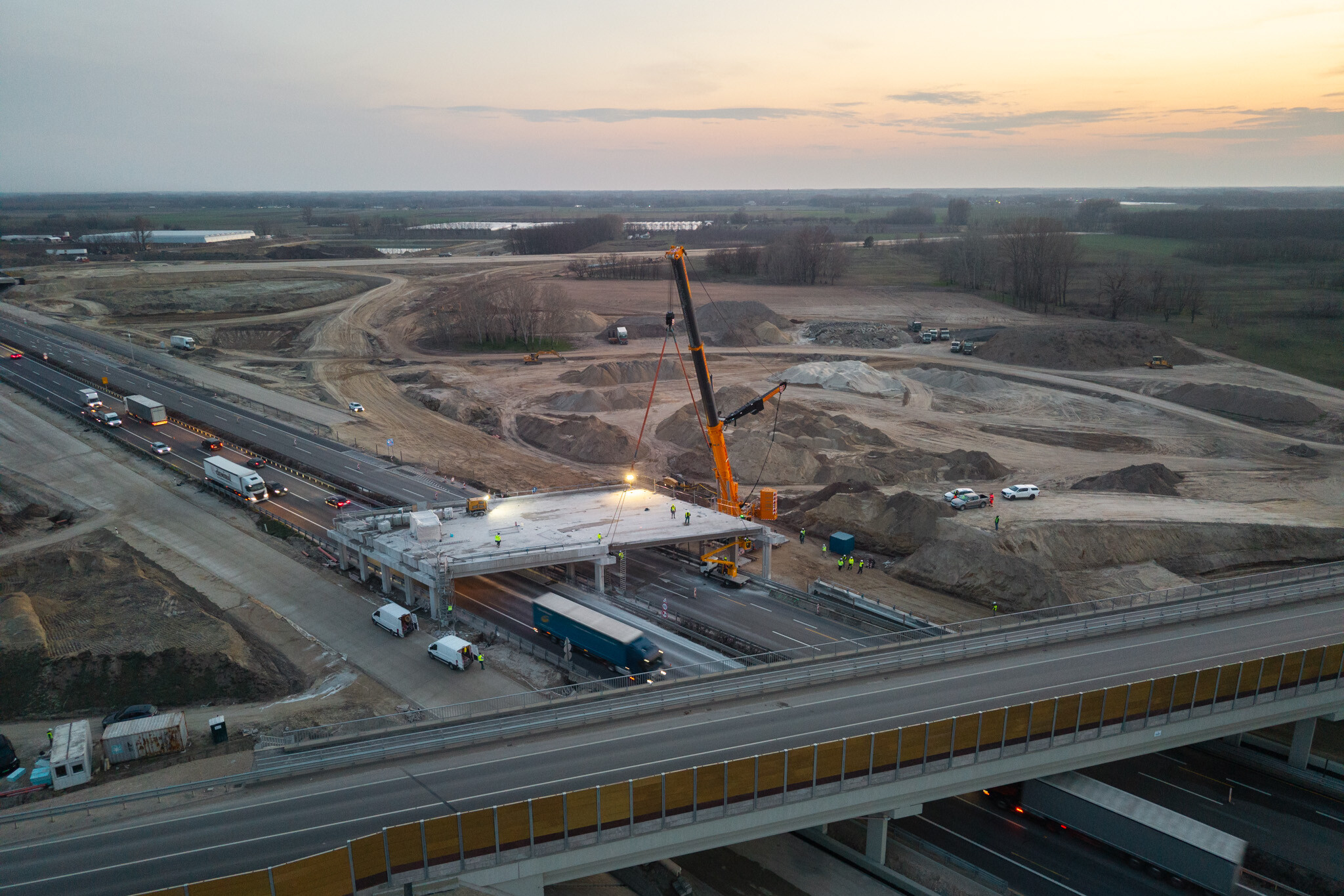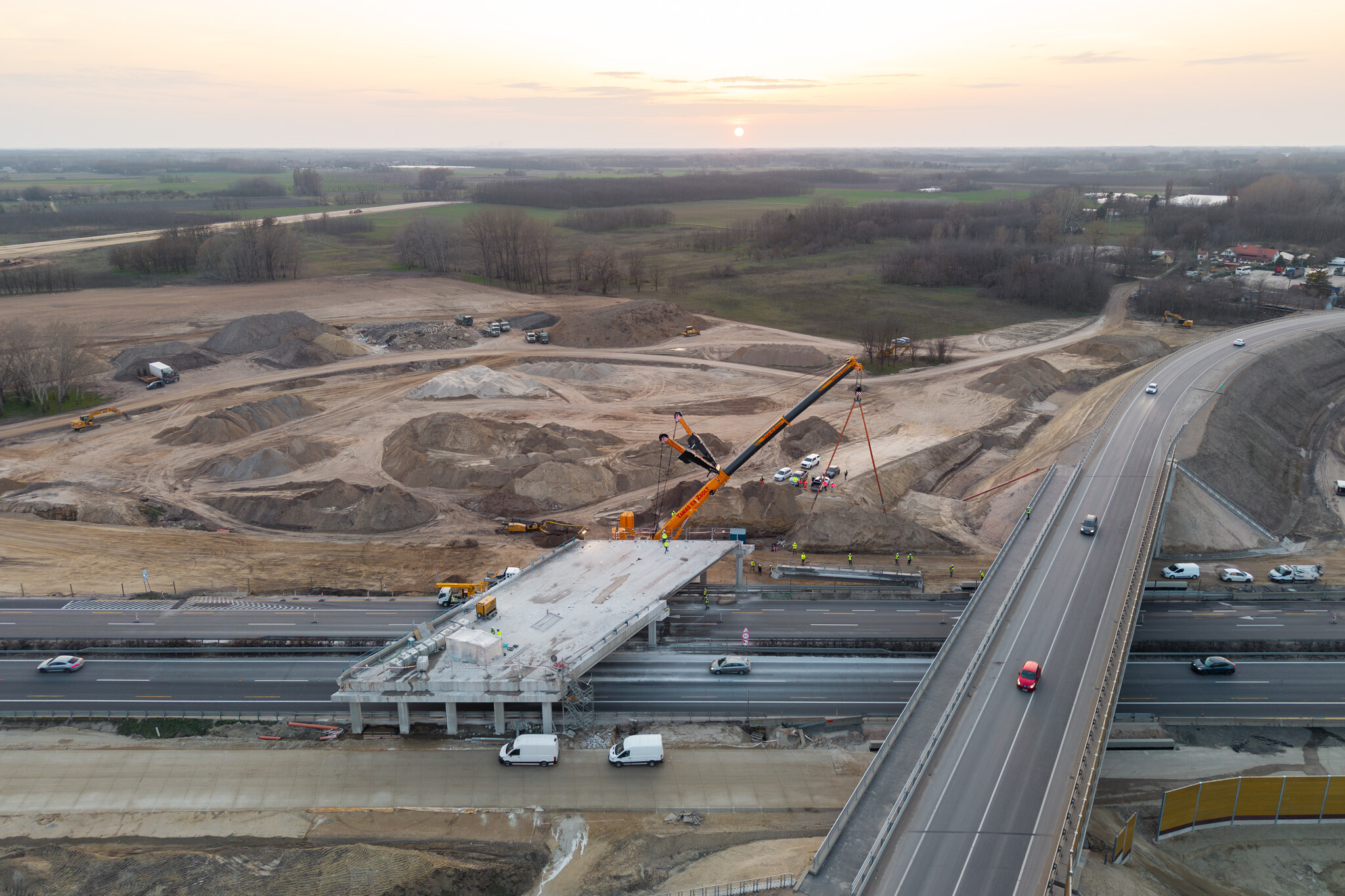 A gyors kivitelezésnek köszönhetően március 10-én még aznap elkészültek a hídgerendák leemelésével az M44-es gyorsforgalmi út fejlesztésének egyik kulcsmozzanatában. Lapunk rendszeresen beszámol az Építési és Közlekedési Minisztérium beruházásában és a Hódút Építő Kft. kivitelezésében épülő csomópontról, amely az M44-es, az M5-ös autópálya és az 5-ös főút találkozásánál jön létre Kecskemét térségében.