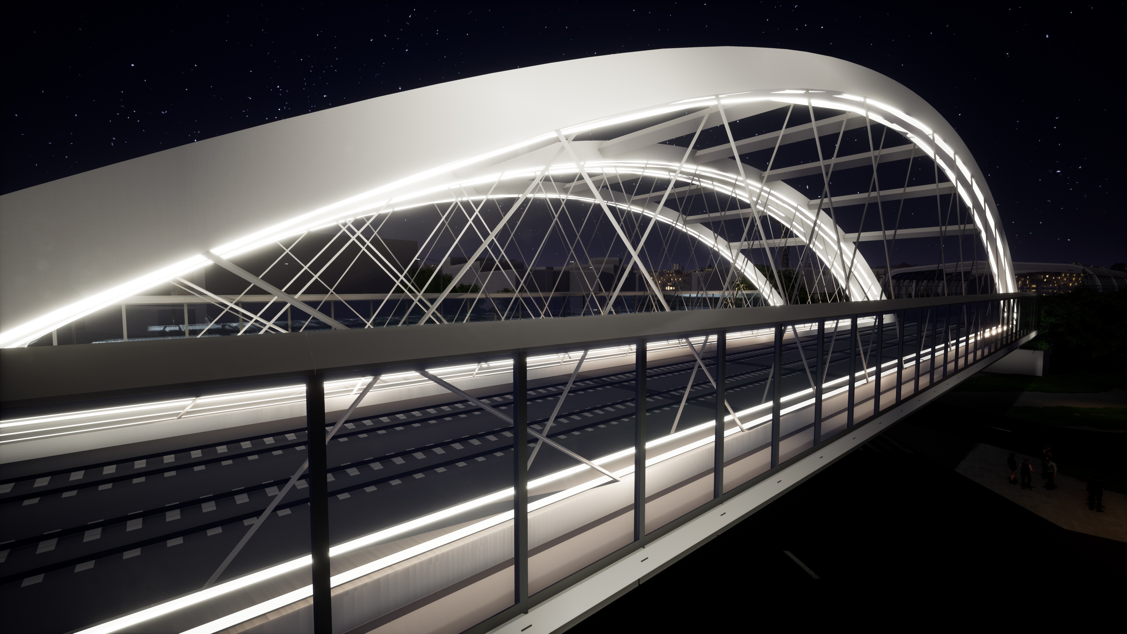 A főtartó ívek és a merevítőtartók zártszelvényűek. A merevítőtartót és az íves főtartót zárt szelvényű, hálós kialakítású rácsozás köti össze. Az integrált lefedés peremtartója, illetve a peremtartók között kialakított hálós rácsozás szintén zárt szelvényű elemekből áll. Az integrált lefedés a végkereszttartóba köt bele és egy „Y”elágazás után elliptikus görbe mentén éri el az íves főtartót. A merevítőtartót és az íves főtartót zárt szelvényű, hálós kialakítású rácsozás köti össze.