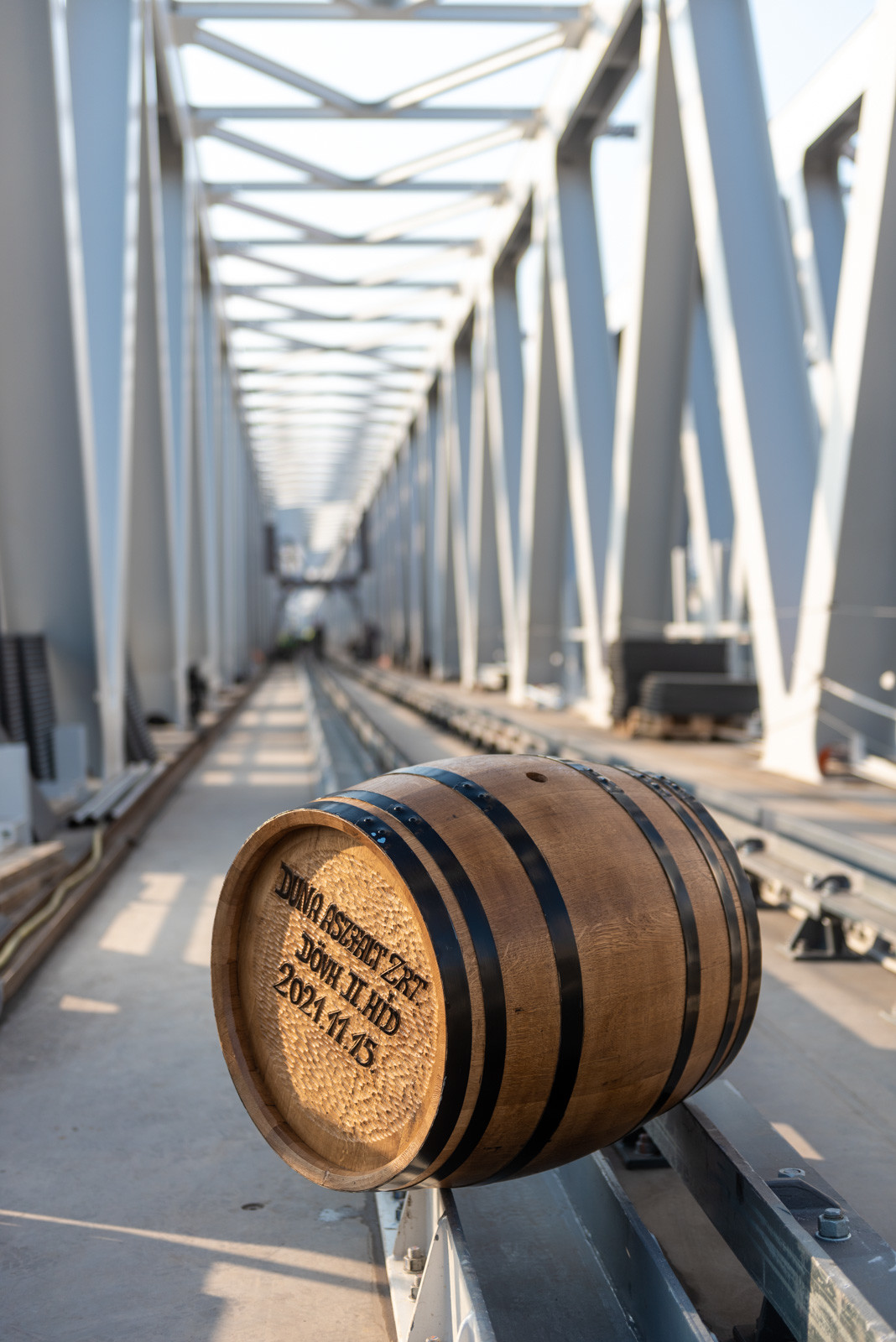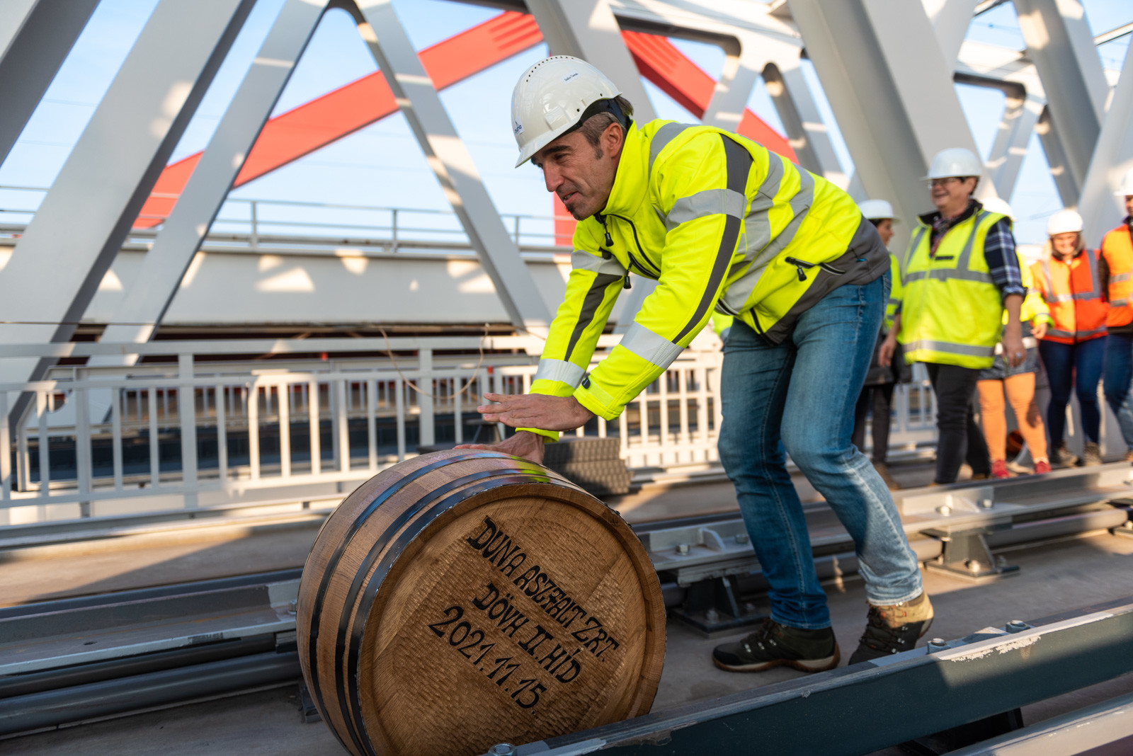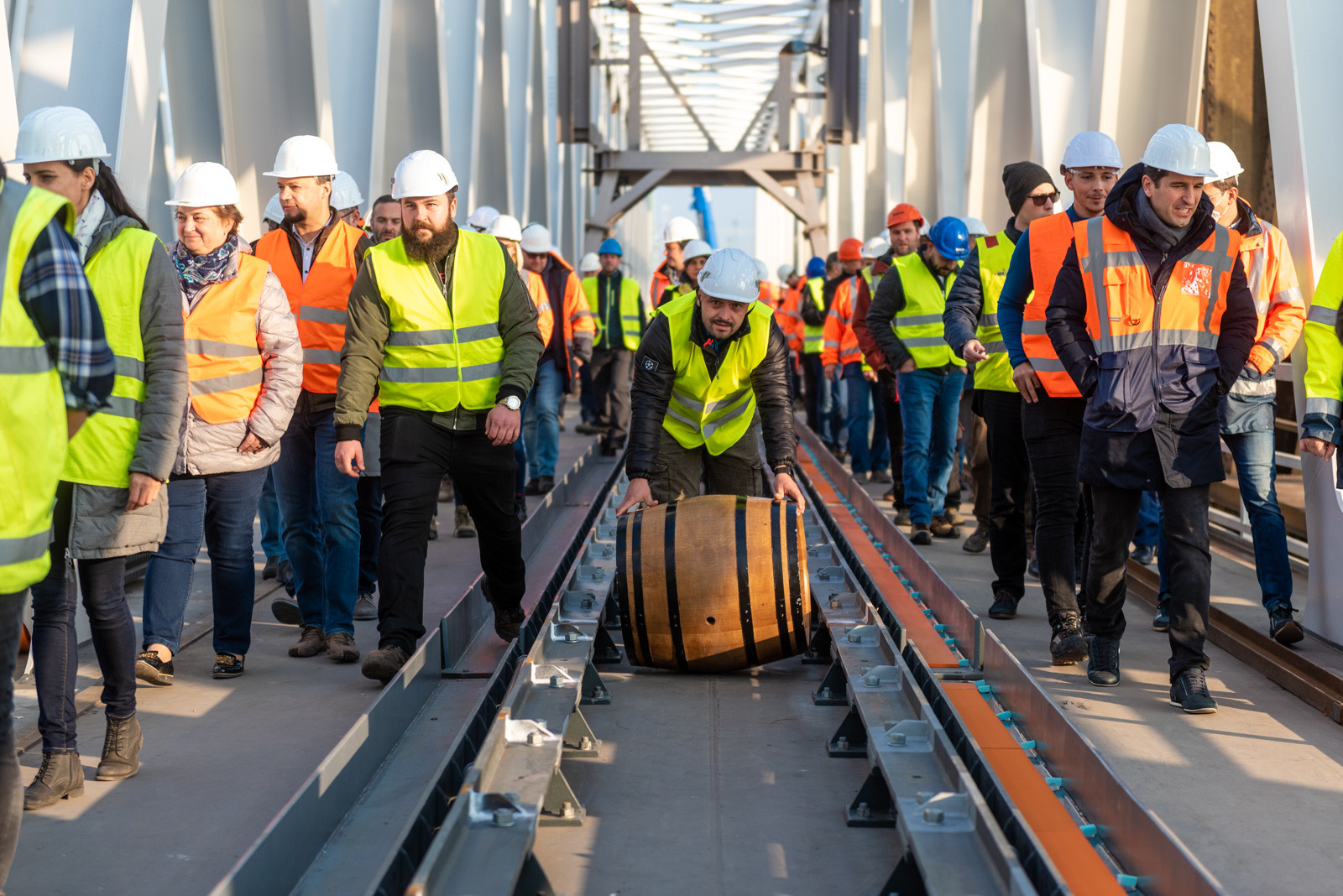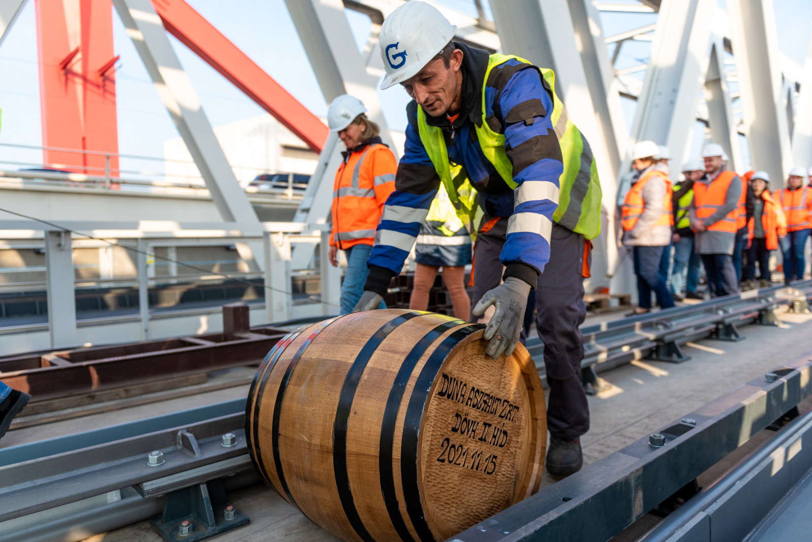 Nemrég számoltunk be arról, hogy látványosan halad a Rákóczi híd közvetlen szomszédságában lévő Déli összekötő vasúti híd projektje. Most újabb eseményről tudósíthatunk; hétfőn sor került a hídépítéseknél hagyományos hordógurításra is a DÖVH második elkészült hídján.