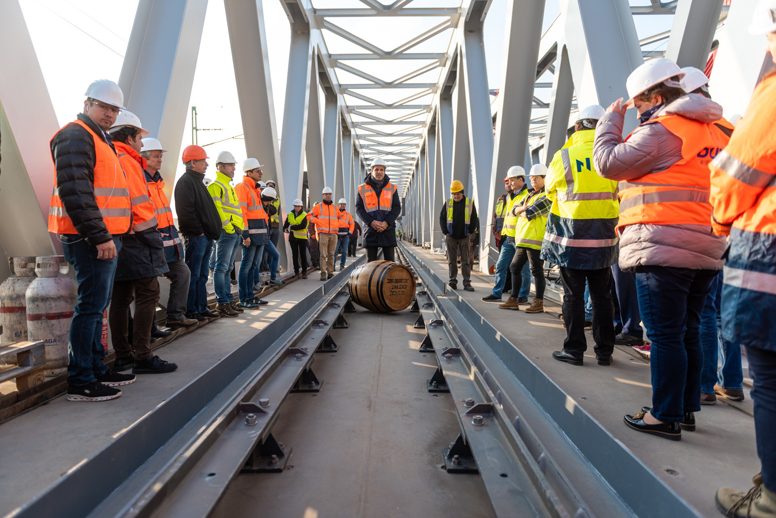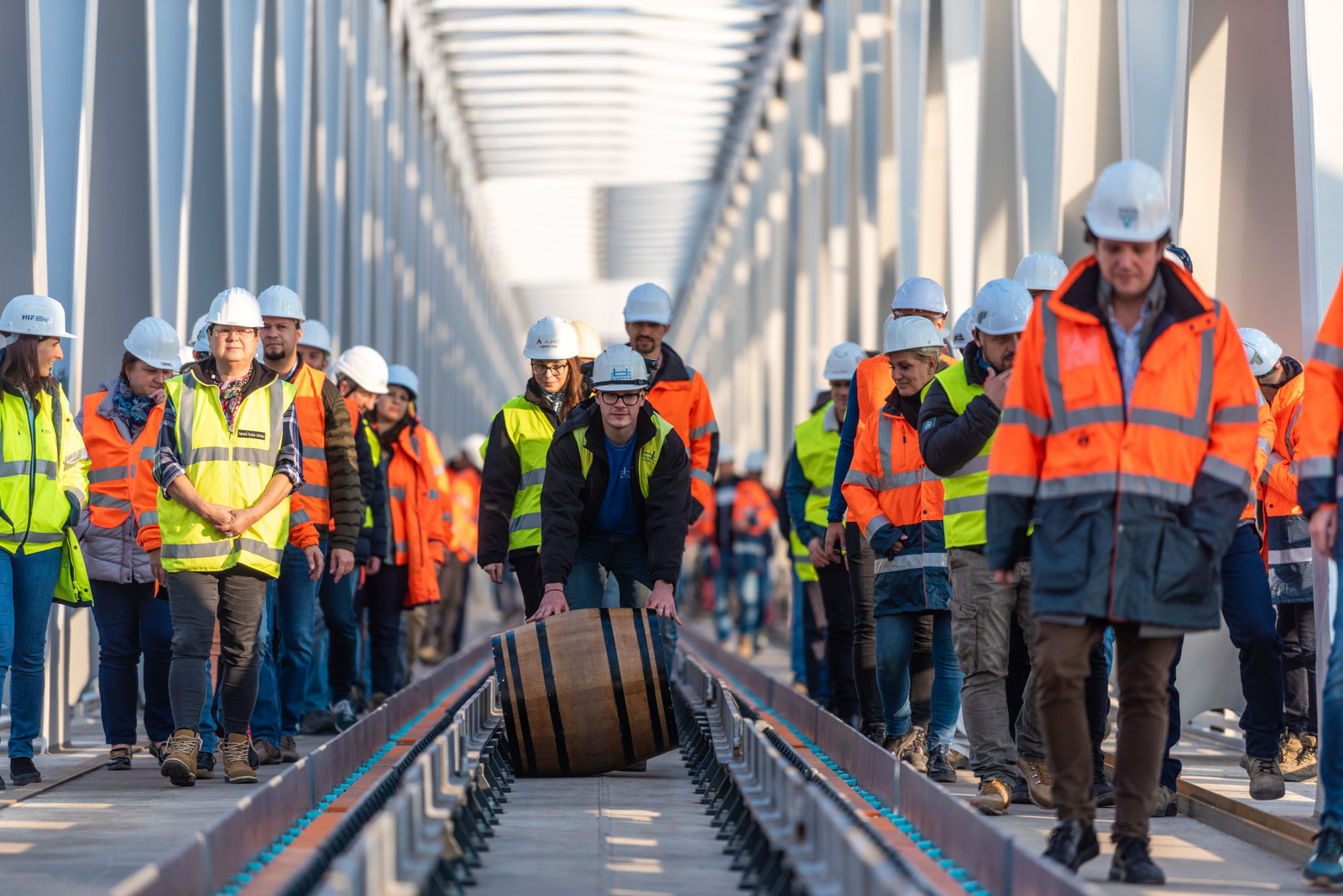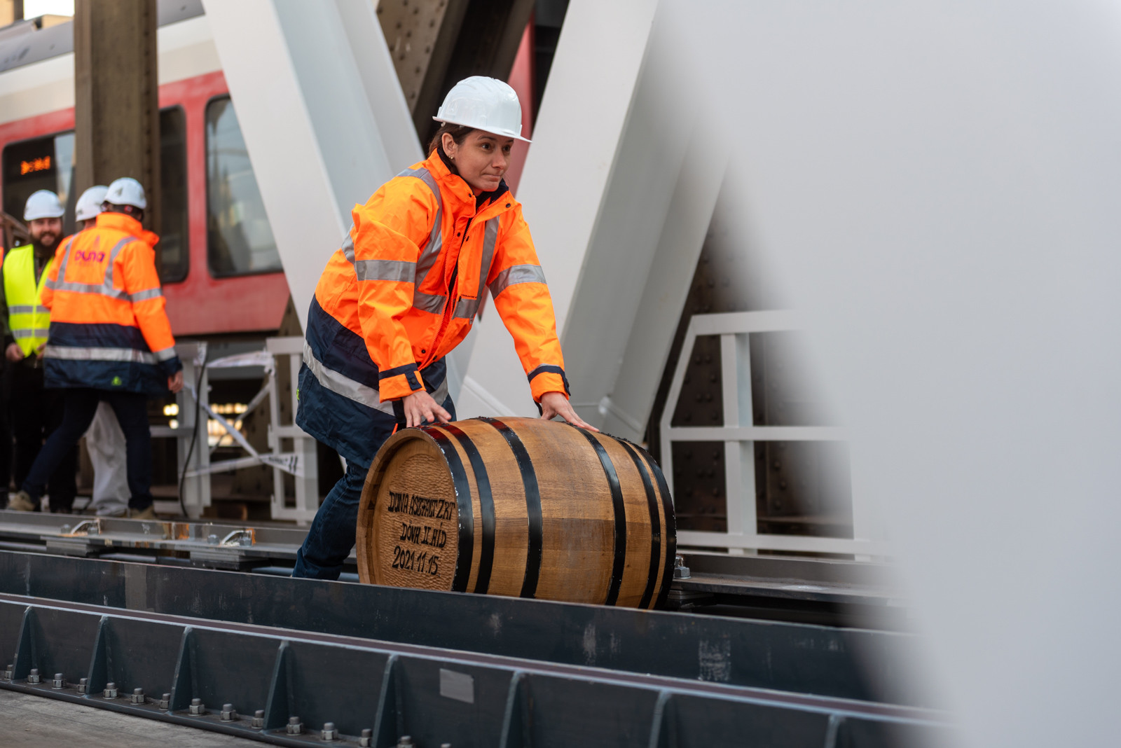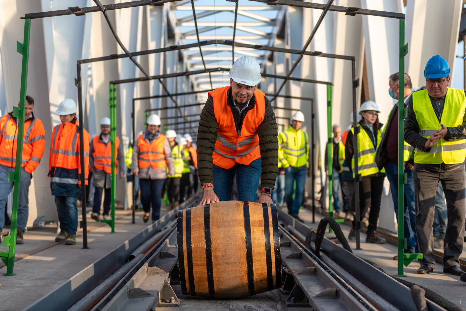 Nemrég számoltunk be arról, hogy látványosan halad a Rákóczi híd közvetlen szomszédságában lévő Déli összekötő vasúti híd projektje. Most újabb eseményről tudósíthatunk; hétfőn sor került a hídépítéseknél hagyományos hordógurításra is a DÖVH második elkészült hídján.