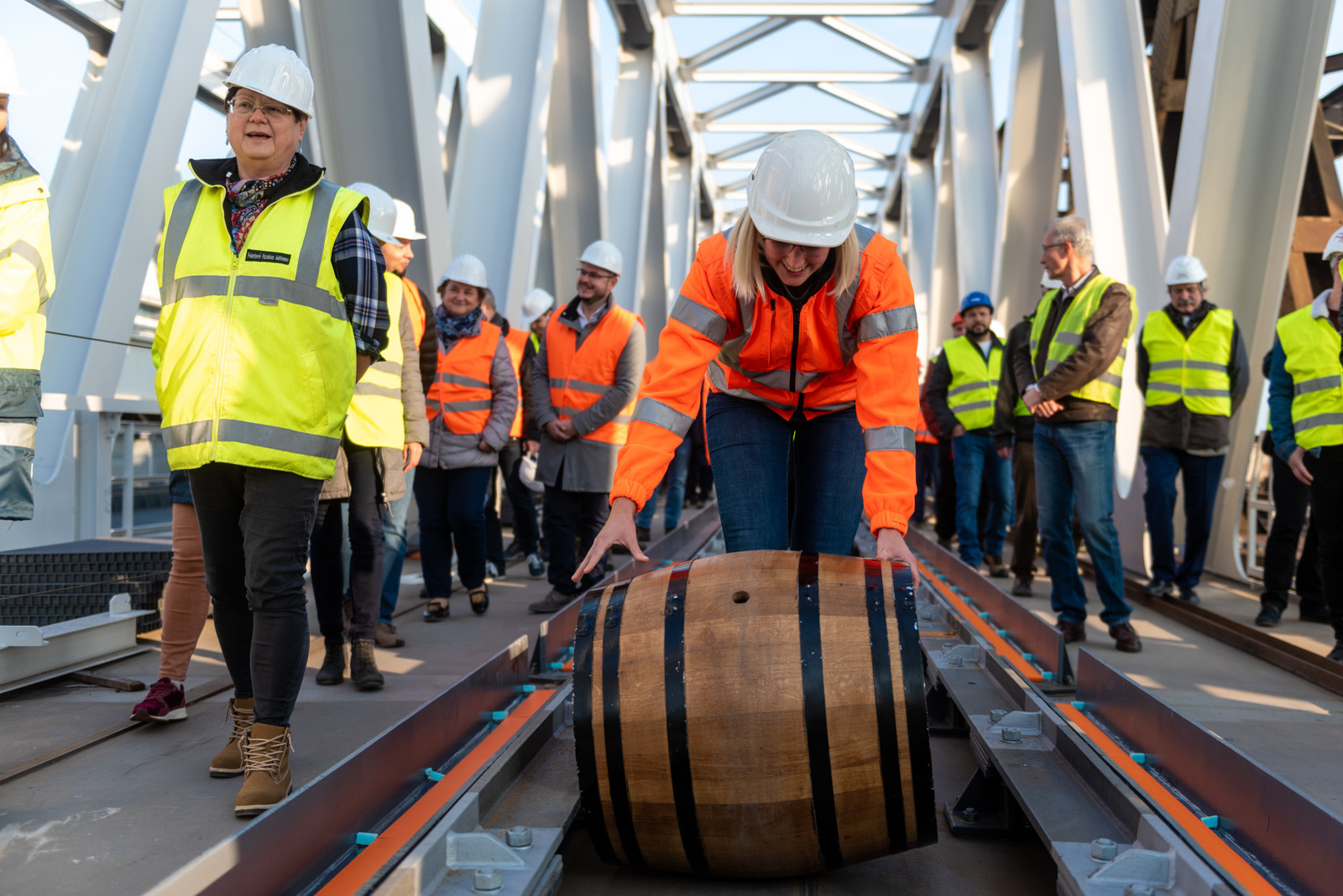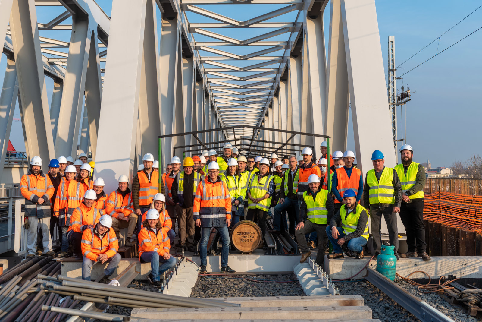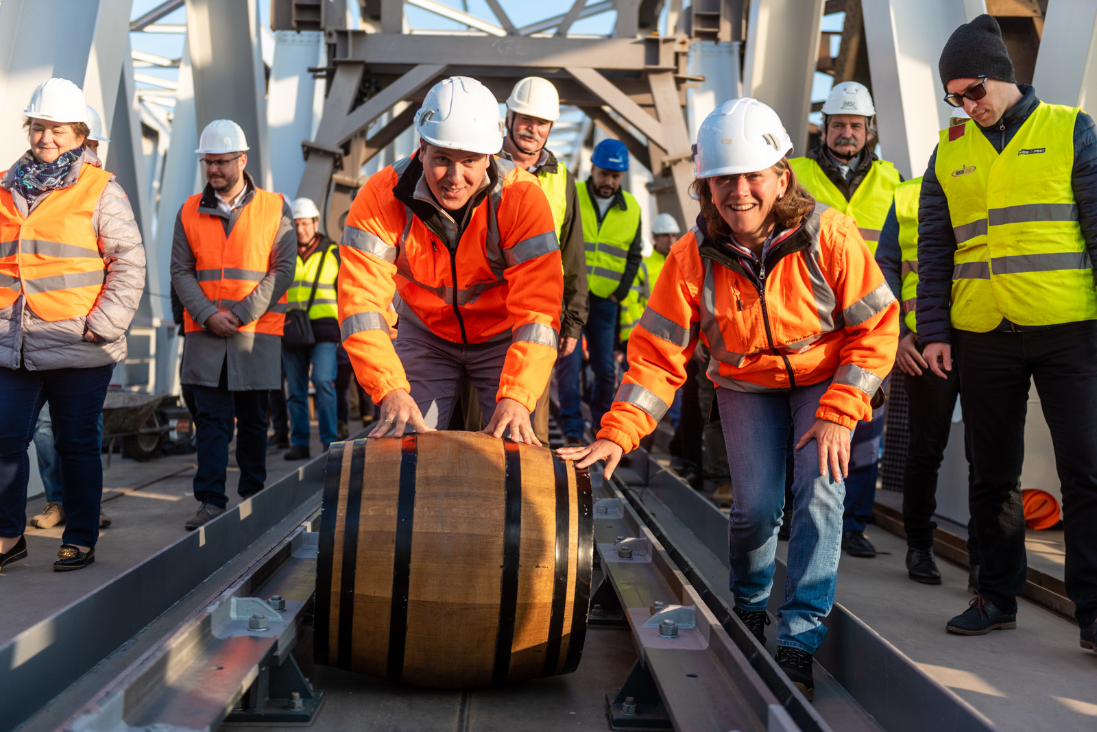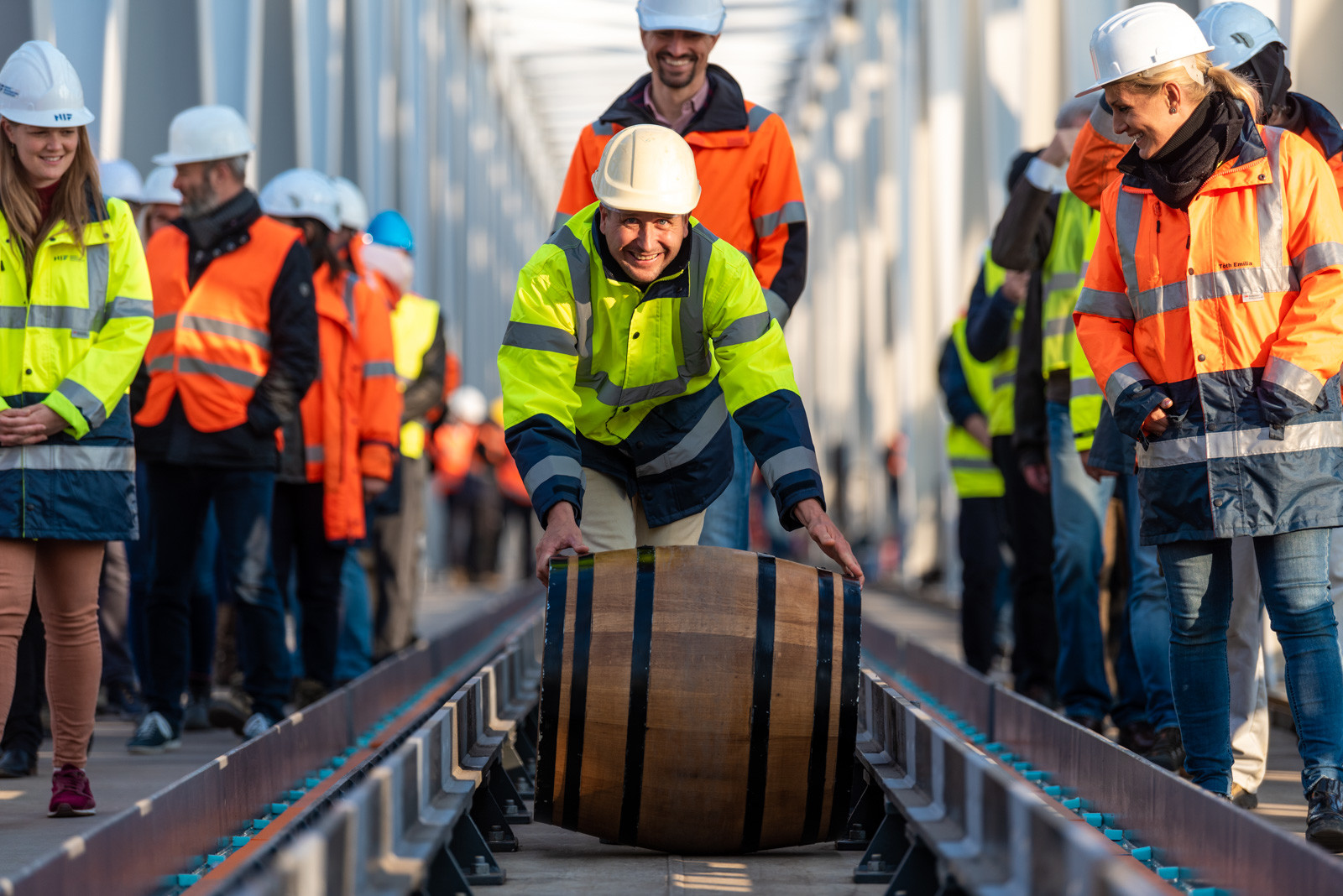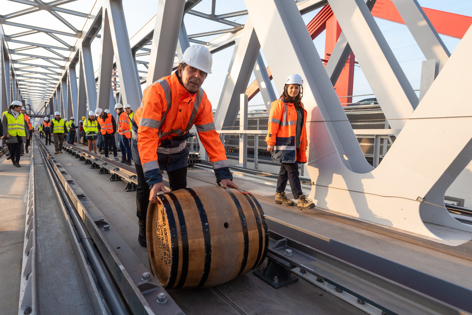 Nemrég számoltunk be arról, hogy látványosan halad a Rákóczi híd közvetlen szomszédságában lévő Déli összekötő vasúti híd projektje. Most újabb eseményről tudósíthatunk; hétfőn sor került a hídépítéseknél hagyományos hordógurításra is a DÖVH második elkészült hídján.
