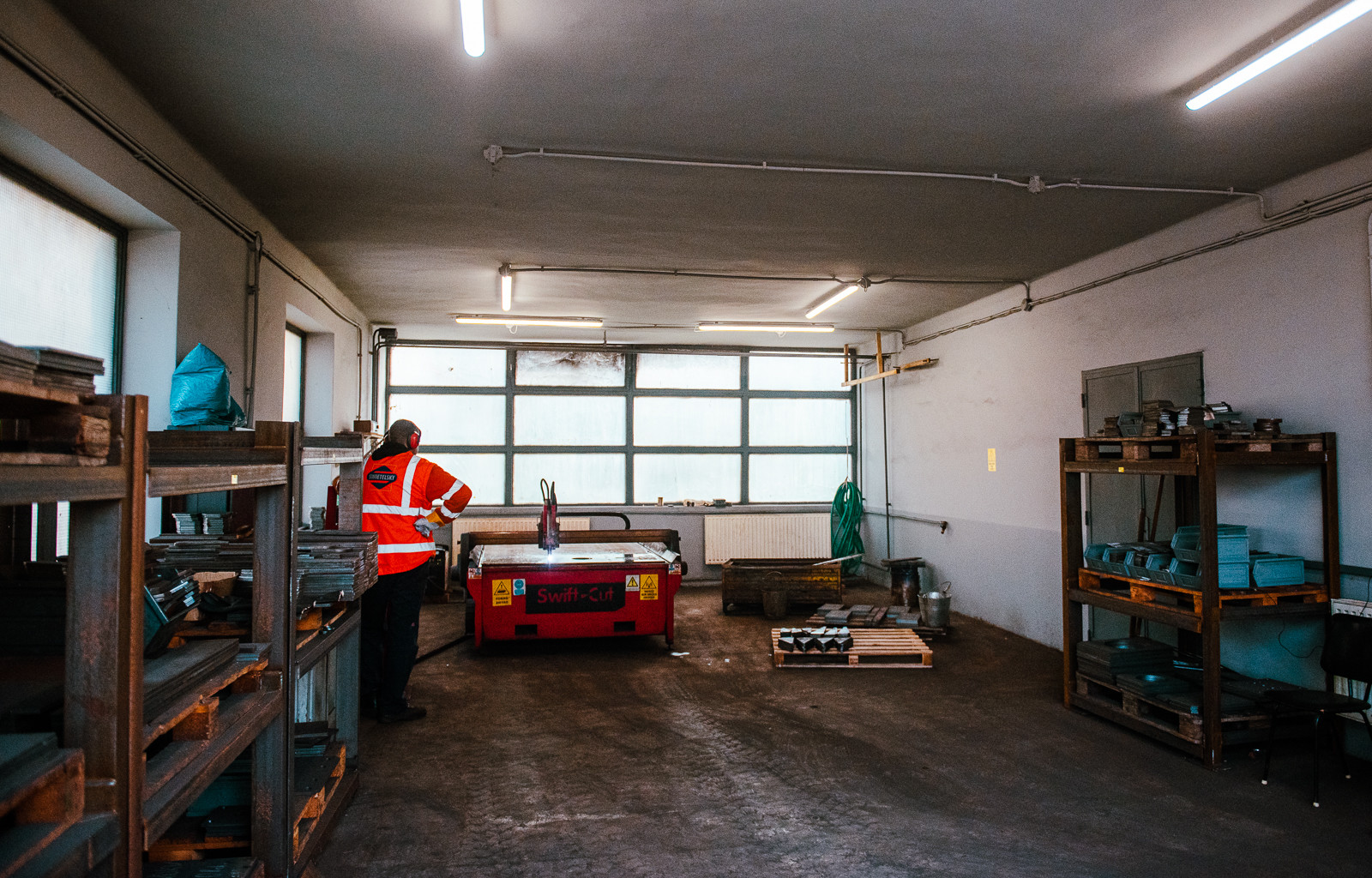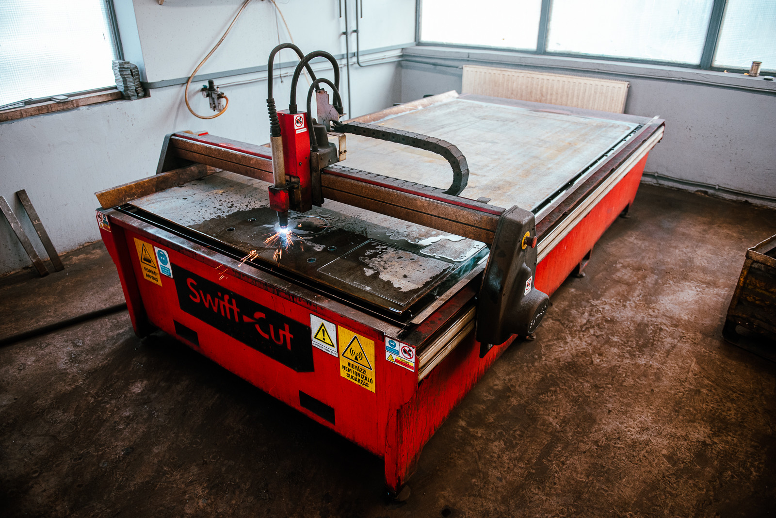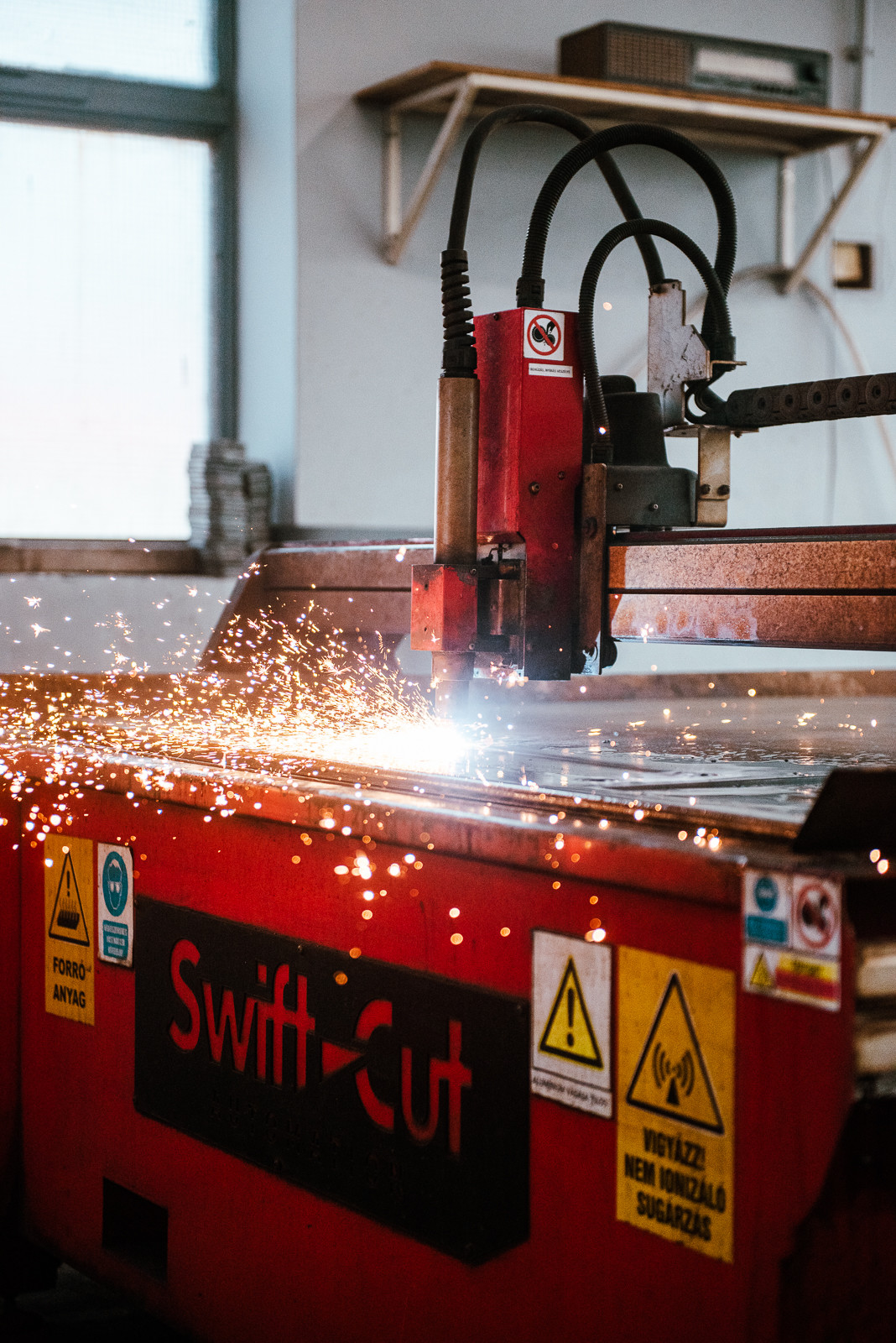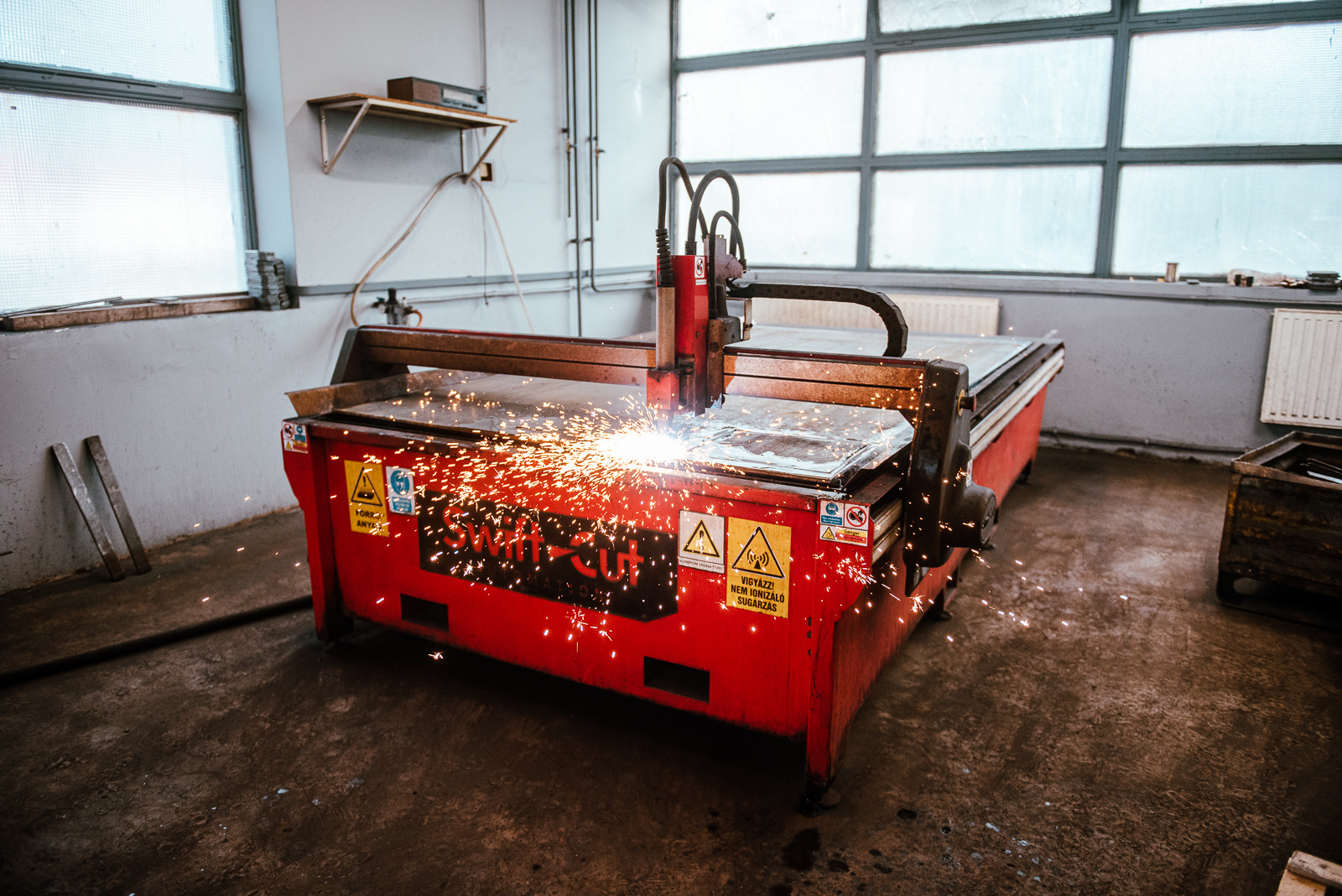 Elsőként megnéztük, hogyan vágják fel a 1,5x3 méteres acéllemezeket kisebb darabokra. A folyamatot CNC vezérlésű gép végezte, amelybe betáplálták az adott elemek méretezett terveit, majd a plazmavágó fejegységgel kivágták az elvárt méreteket.