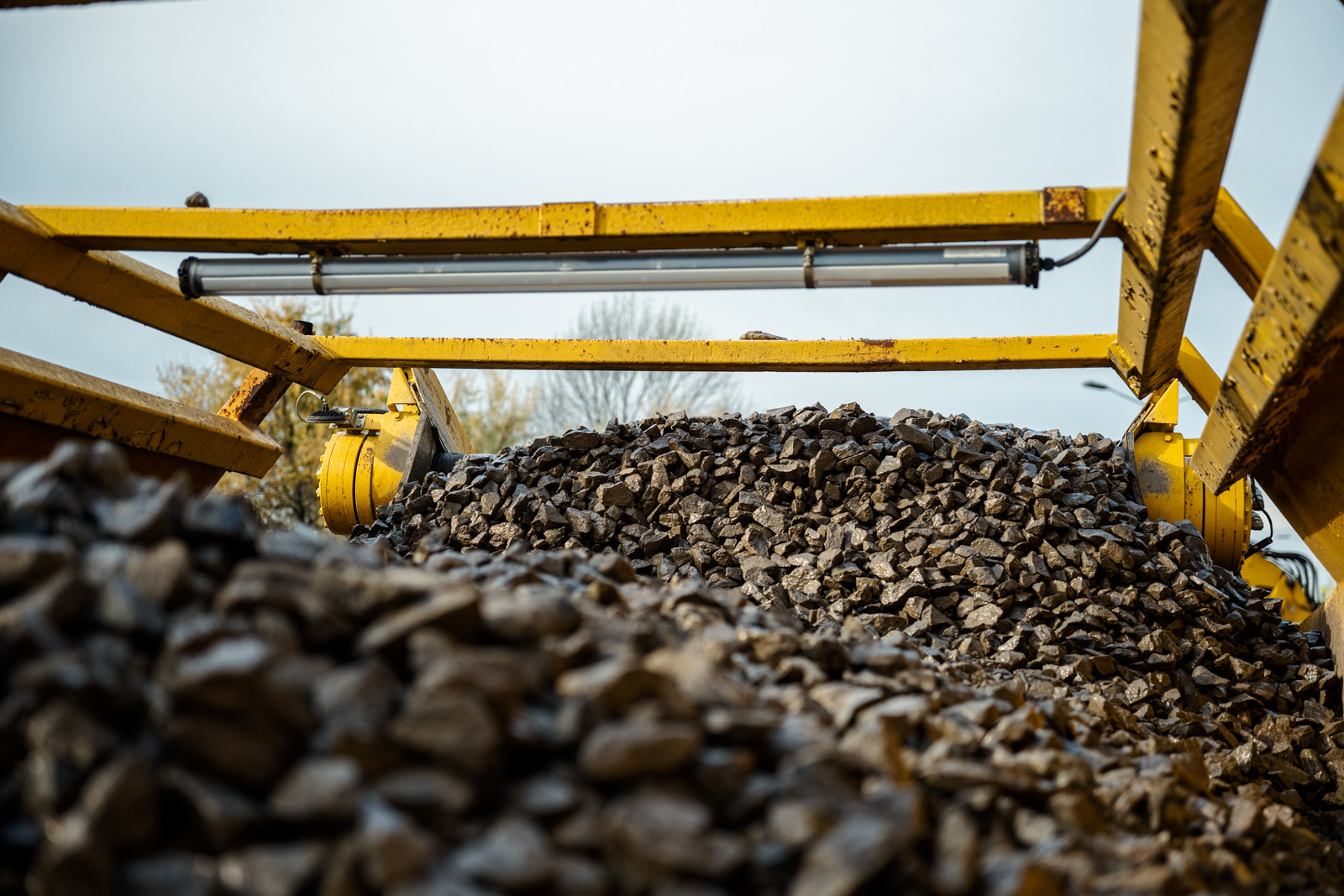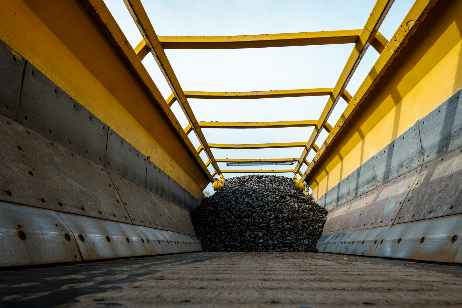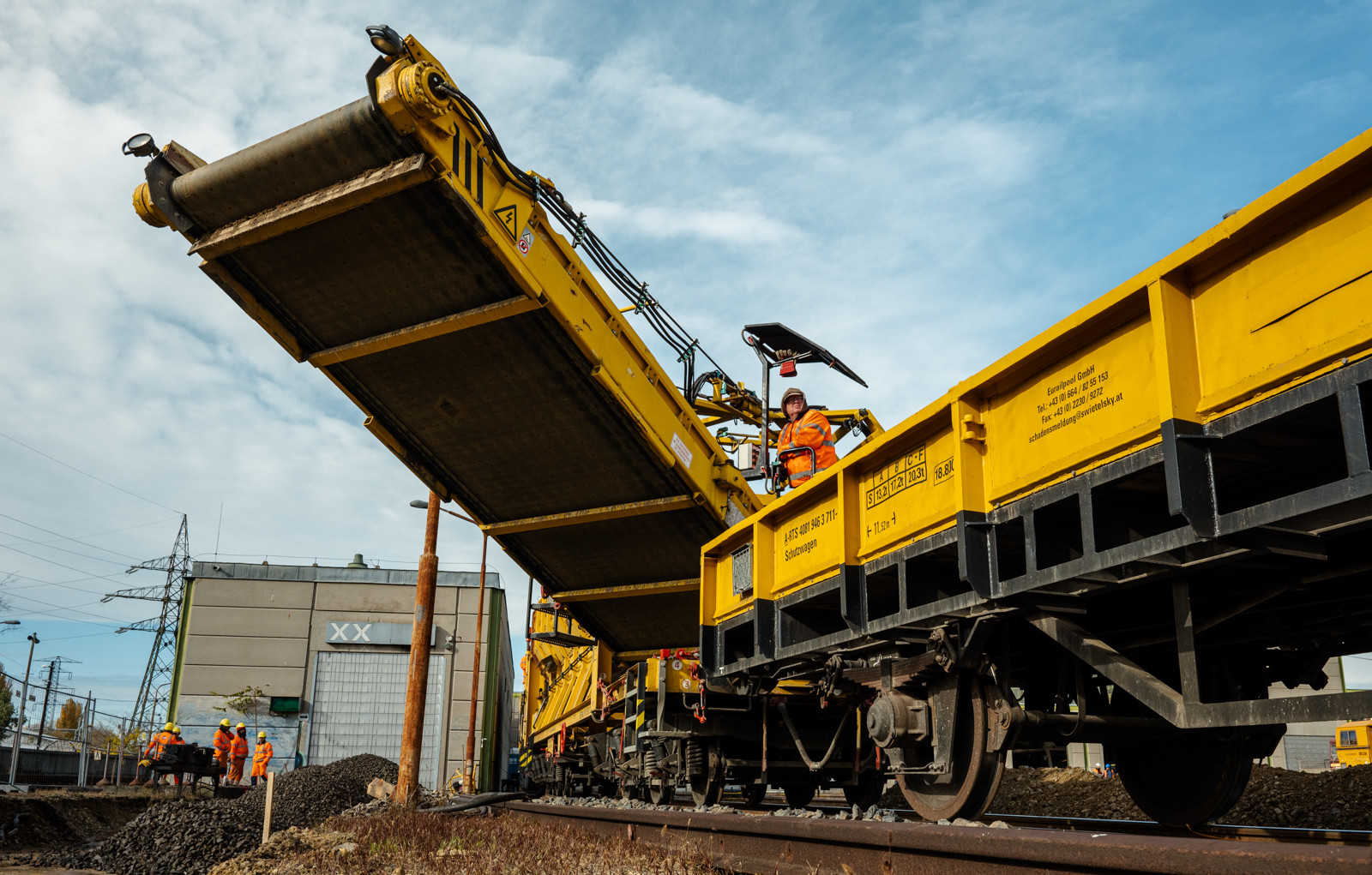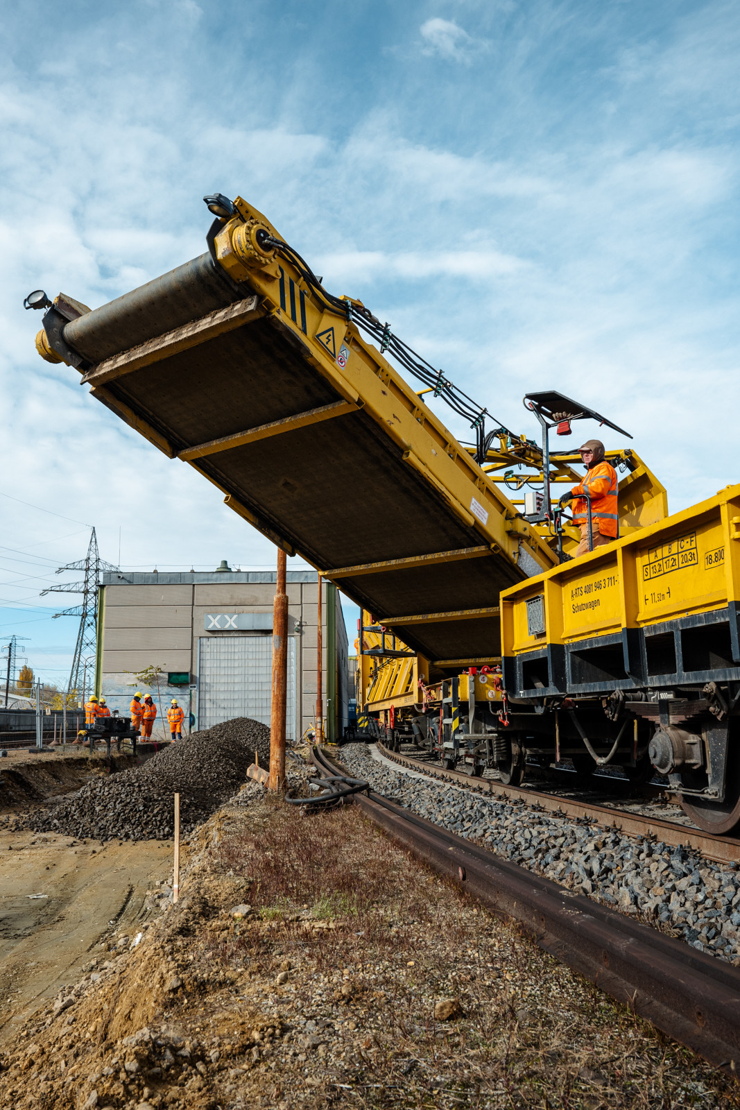 Ez egy nagyon látványos munkafázis: ottjártunkkor a XX. vágány helyéről MFS 40 (Material-, Förder- und Siloeinheit MFS 40) szalagsoros kocsikkal szállították el a zúzott követ a kijelölt depó területre.