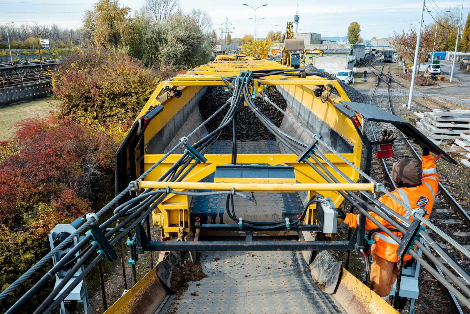 A felsőágyazat kialakításában a FACCS önürítős kocsi volt a szakemberek segítségére. Az összekötött vágányokba beanyagolták az új zúzottkövet, majd a 08- 475 UNIMAT 4S KIAG munkagéppel szintre és irányra kiszabályozták a vágányokat és kitérőket, kialakítva azokat a tervezett geometriára.