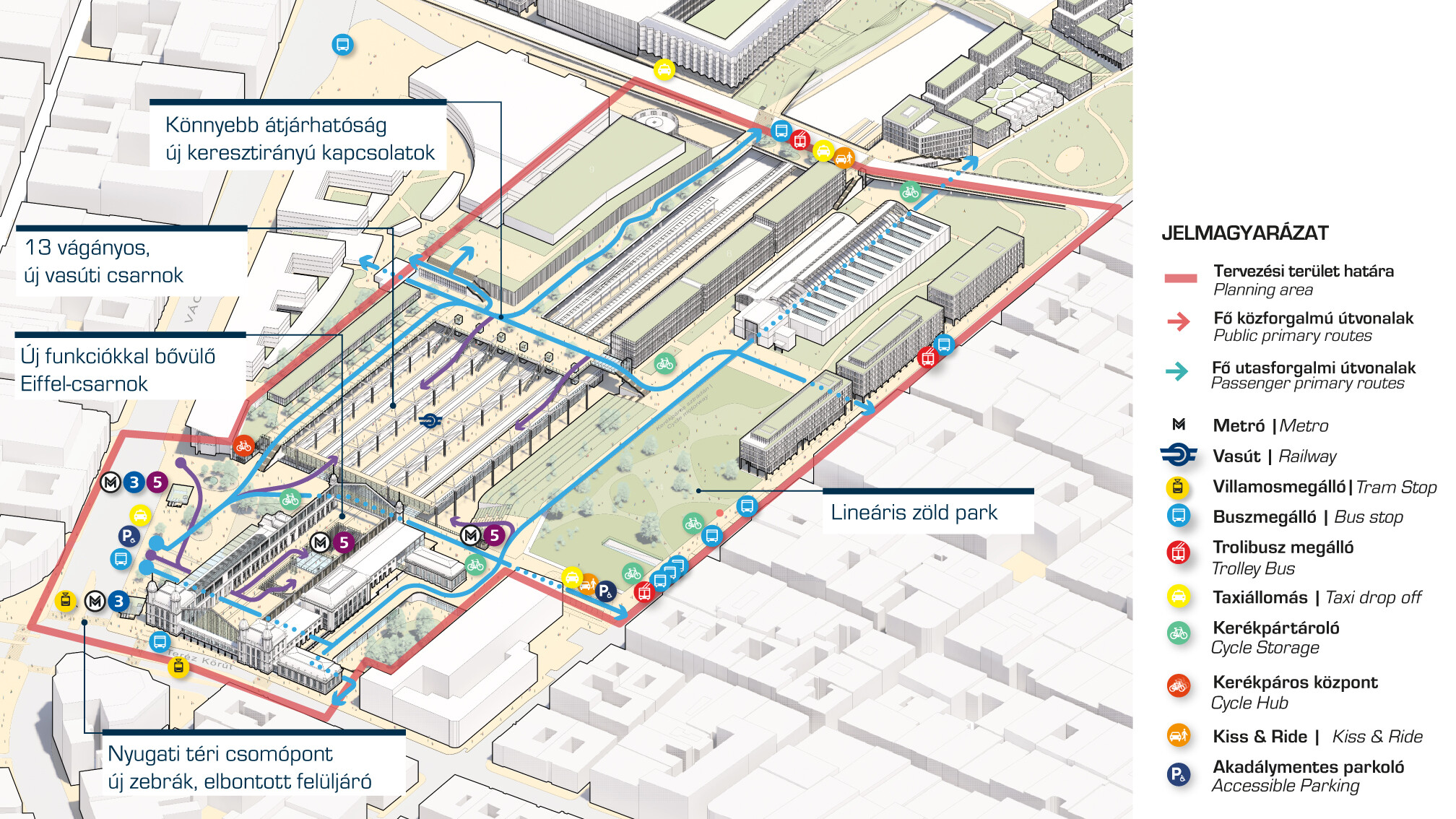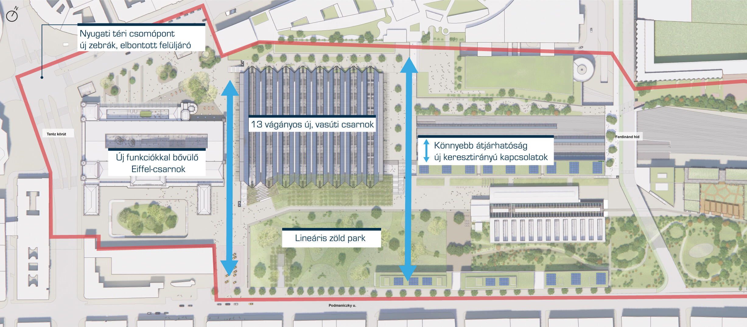 „A Nyugatit 21. századi, háromszintes, részben föld alá süllyesztett, modern pályaudvarként tervezik újjá. Az Eiffel-csarnok mögött a felszínen egy új vasúti csarnok, a föld alatt 6 vágányos mélyállomás épül, így a pályaudvar jóval több vonatot tud fogadni. A belváros bezöldül: a Nyugati környezetében egy zöld, parkosított, átjárható új városrész születik. A Nyugati pályaudvar és környezete megújításával 23,5 hektár, vagyis közel két Városmajornyi terület szabadulhat fel, és válhat nagyrészt zöldterületté”