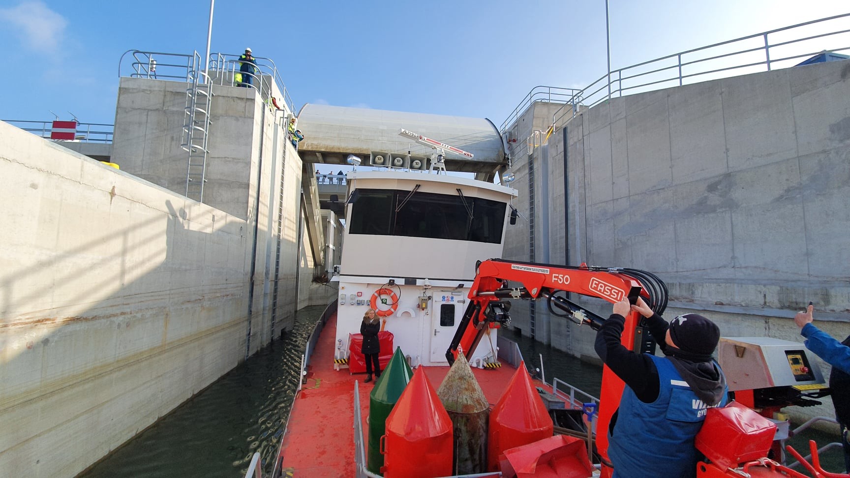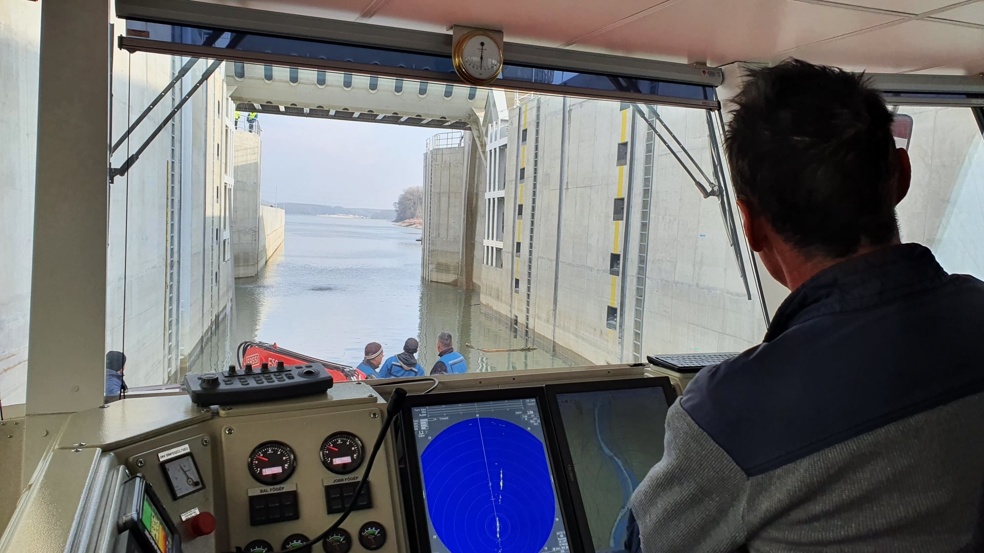 Mint a vízügyi igazgatóság beszámol róla, a kitűzőhajó az alvíz felől, az ÉDVUVIZIG gönyűi hajózási telepéről érkezett, a hajók fogadására kialakított előkikötőben várakozott a 135 tonna tömegű szegmenstábla felemelkedésére. Ezután úszott be a zsilipkamrába, kikötött az egyik úszóbakhoz, megvárta a szegmens zárását, a kamra töltését, majd a töltést követően a felnyitott másik oldali szegmenstábla alatt átúszva hajózott át a műtárgy túloldalára.