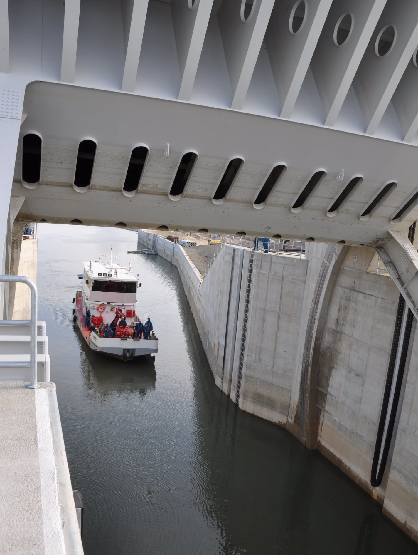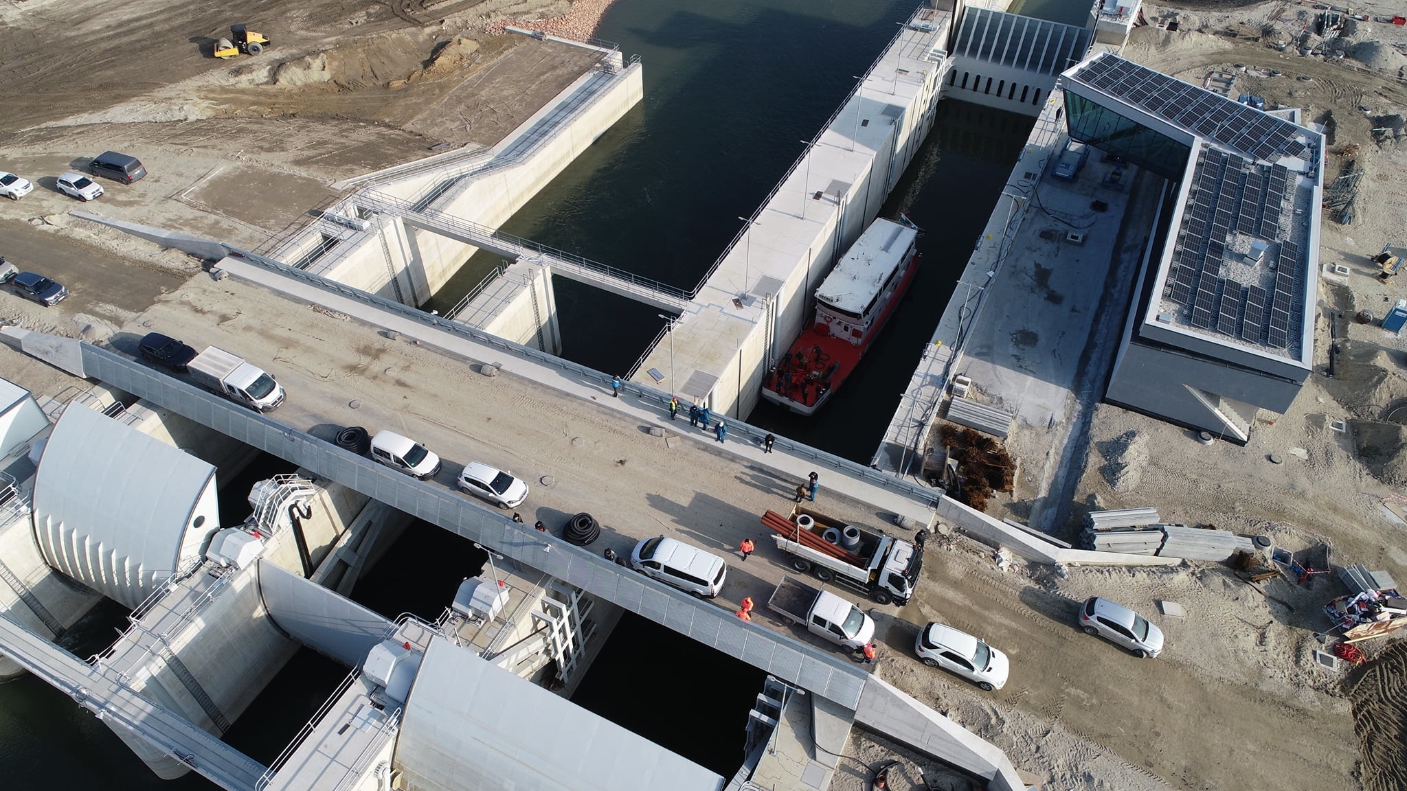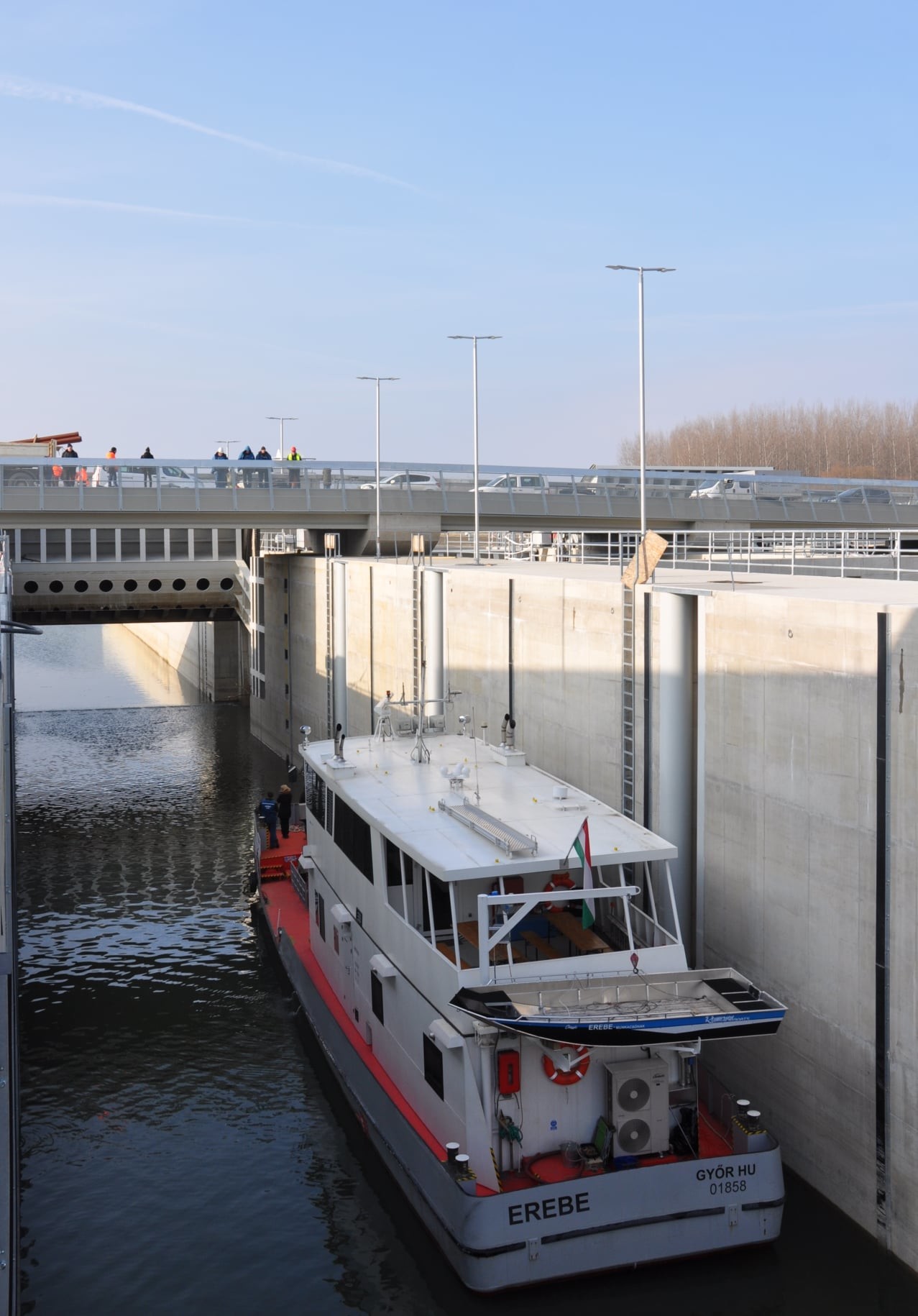 Az immár 90 százalékban elkészült beruházásban óriási szegmenstáblákkal és összetett munkával fejlesztett műtárgy zsilipjén néhány nappal ezelőtt kelt át az első hajó: a megtiszteltetés 25 méteres EREBE kitűzőhajót érte, a zsilip első üzempróbája során – derül ki az ÉDUVIZIG közleményéből.