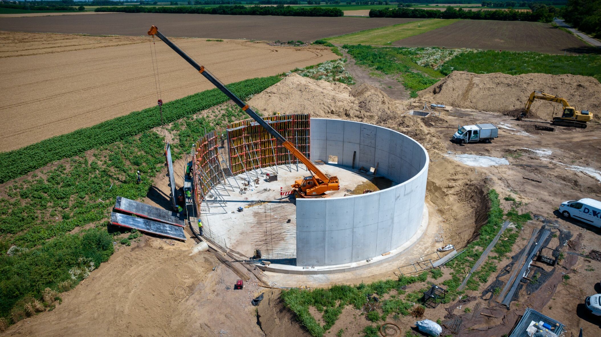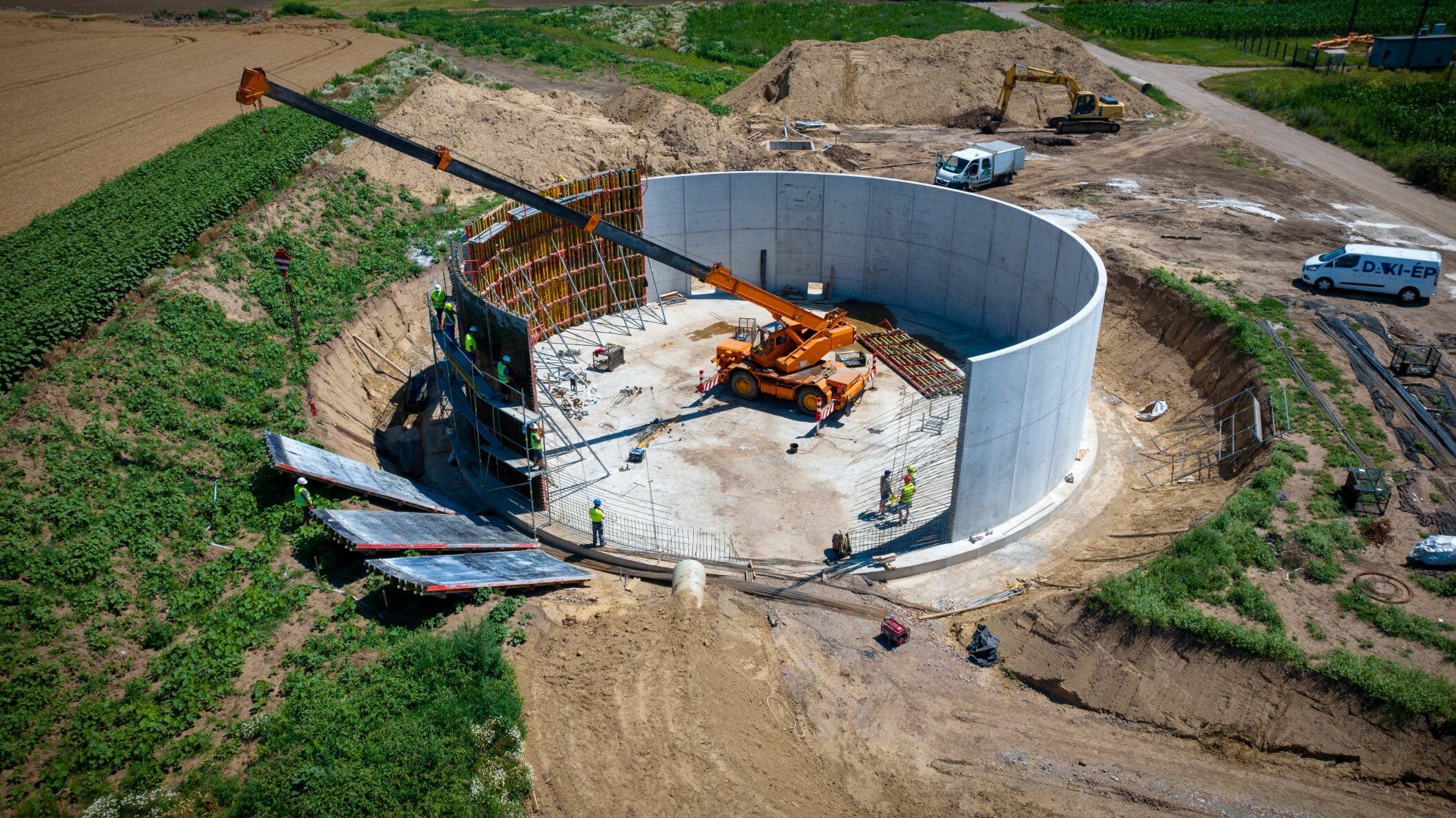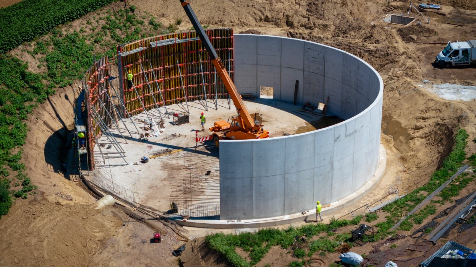 „A nagy mennyiségű víz optimális eloszlása érdekében a tározó kör alaprajzú, falai 6,65 méter magasak, ezért megépítése nem mindennapi zsaluzási technológiát igényelt.”
