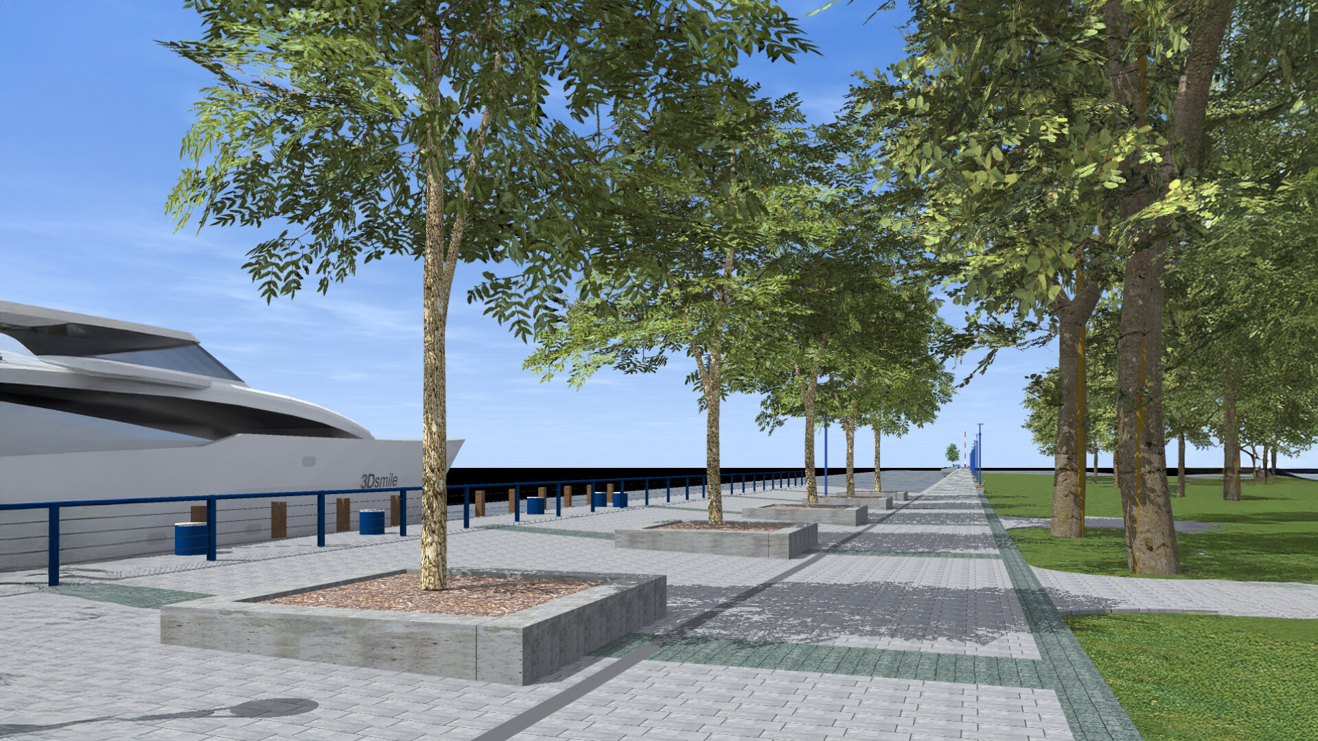 A mólósétányt a vízépítészeti tervek alapján magasabbra emelik, a nyugati oldalon új partfalat kap, a közpark északi határától a keleti oldalon alacsony beton mellvédfallal választják majd le.